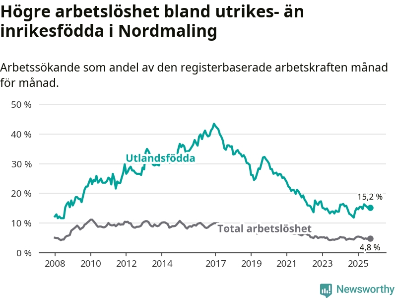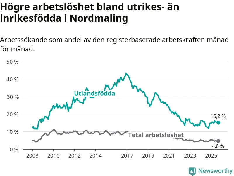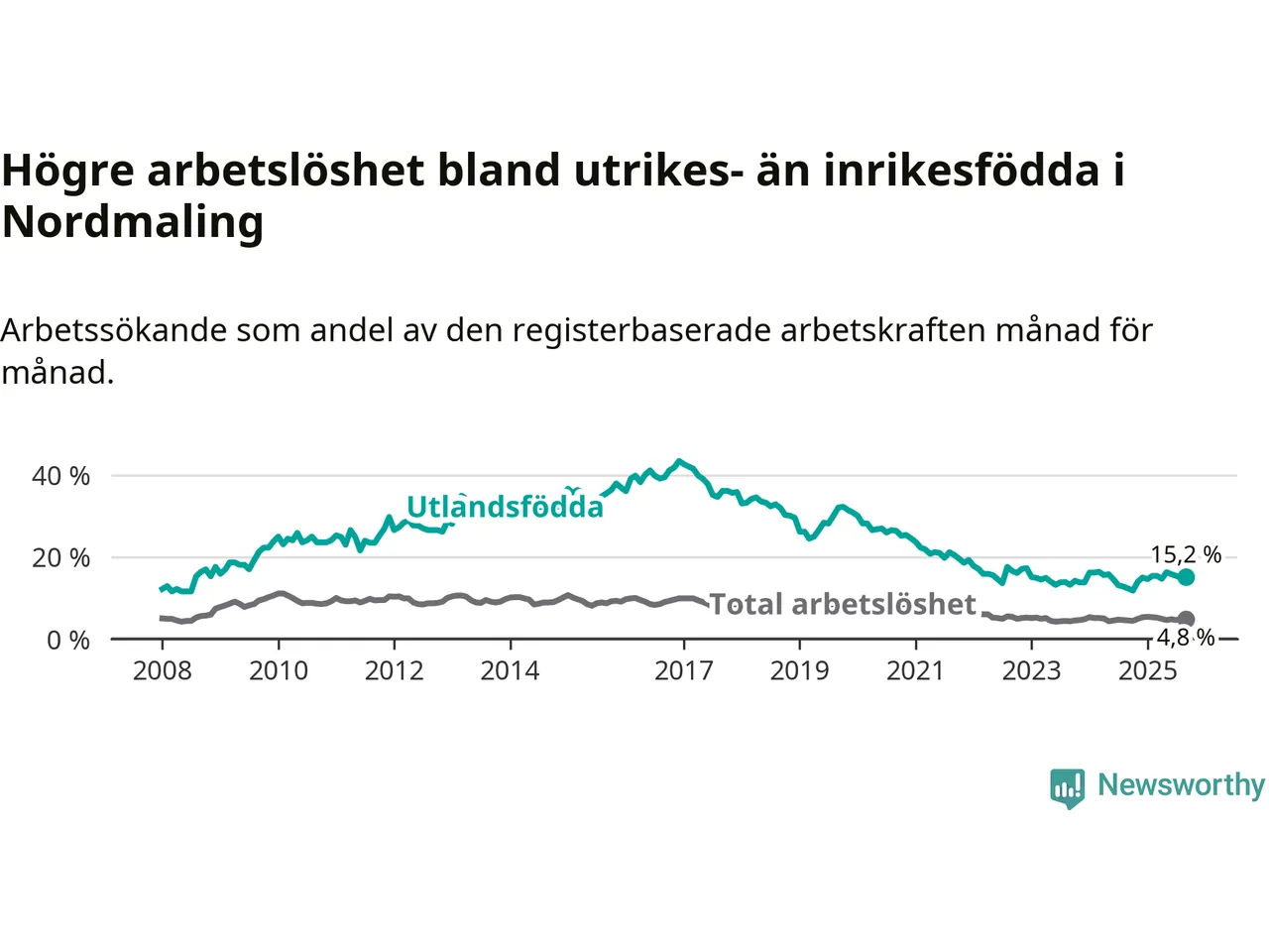 Arbetslösheten bland utlandsfödda var 15,2 procent i Nordmaling under september månad, motsvarande 56 av 368 personer. Det är 2,9 procentenheter fler än vid samma tidpunkt i fjol (+9 om man räknar personer).