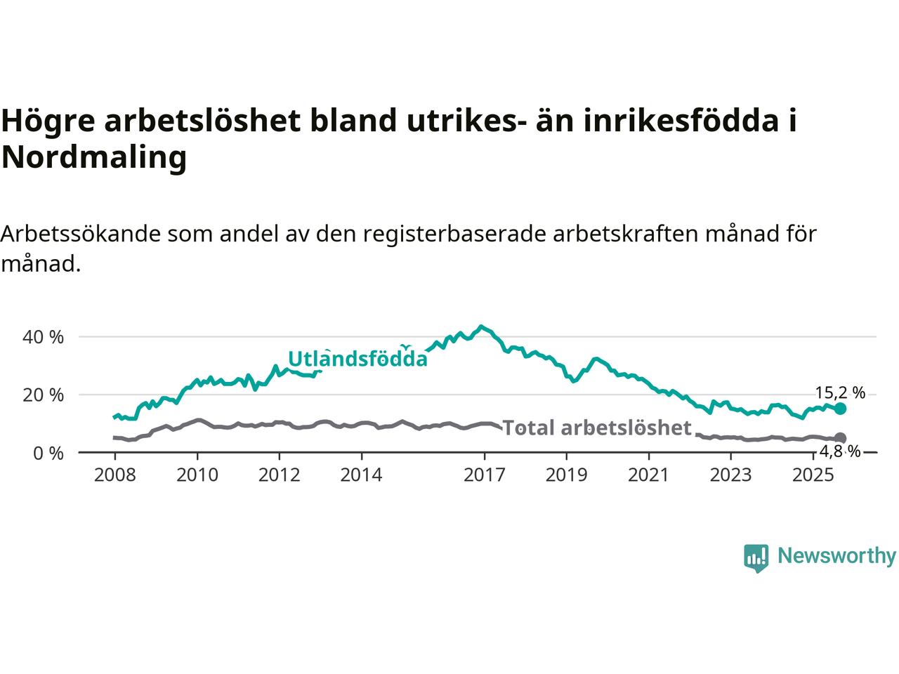 Skillnaden i arbetslöshet mellan utrikesfödda och hela befolkningen är 10,4 procentenheter i Nordmaling. Det är en betydligt större skillnad än för ett år sedan (+2,6 procentenheter).