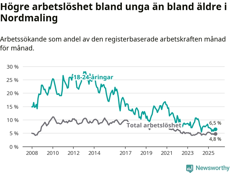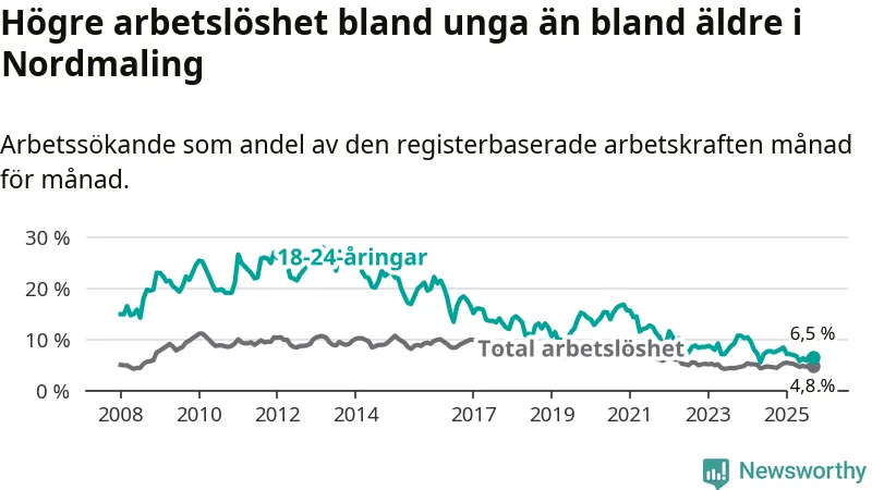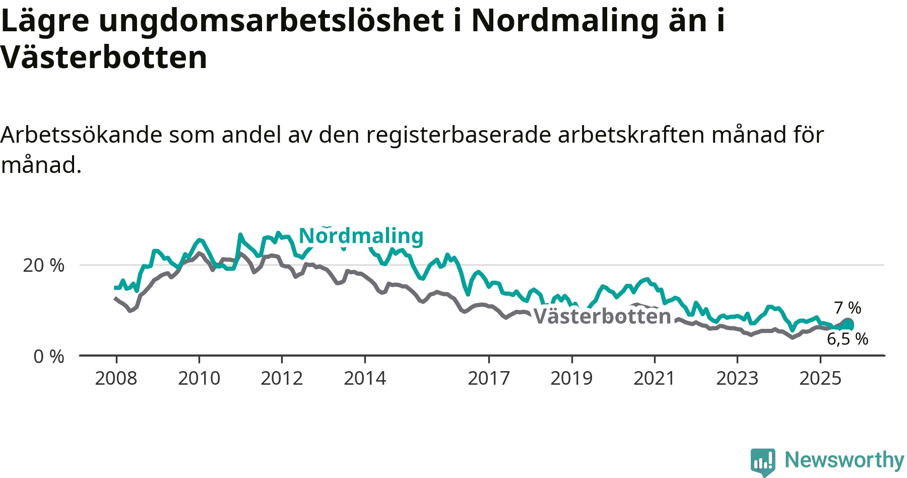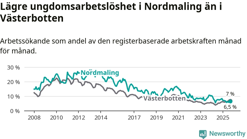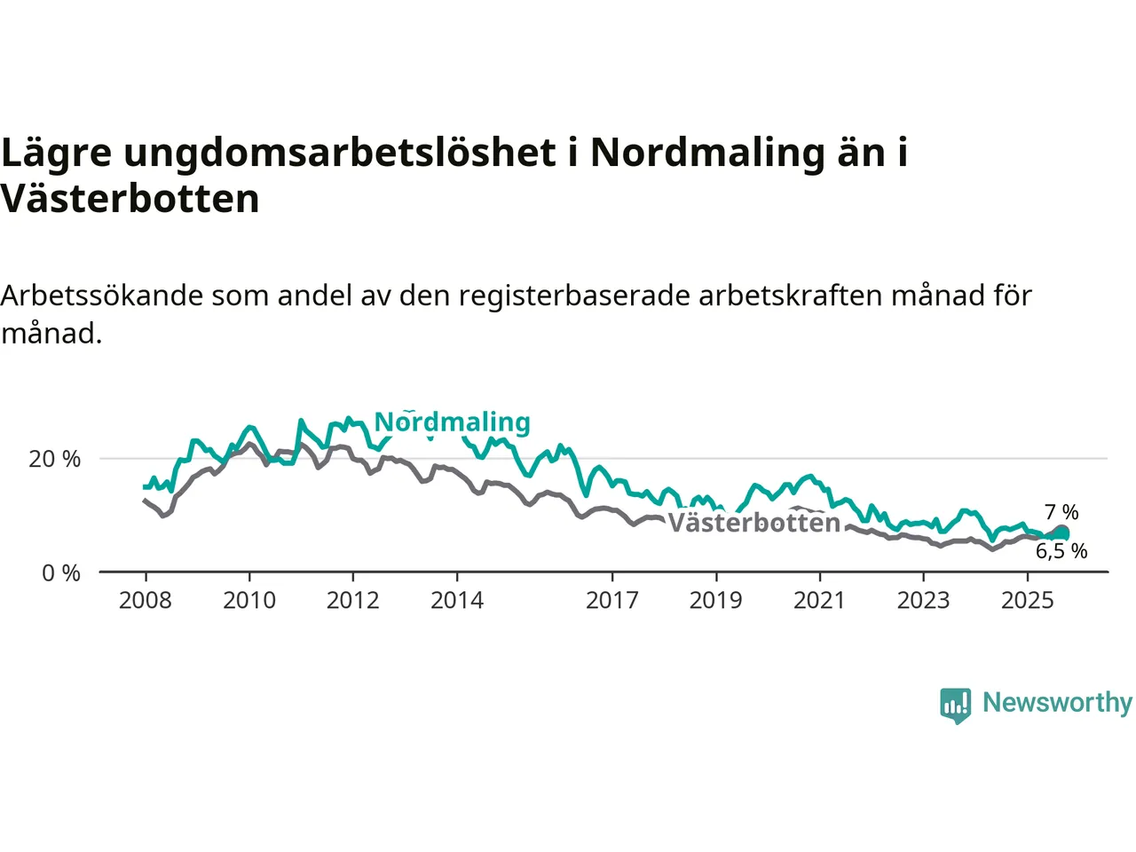 Precis som den totala arbetslösheten ligger ungdomsarbetslösheten i Nordmaling lägre än i Västerbotten som helhet. Skillnaden mellan kommunen och länet är 0,5 procentenheter.