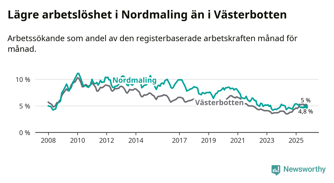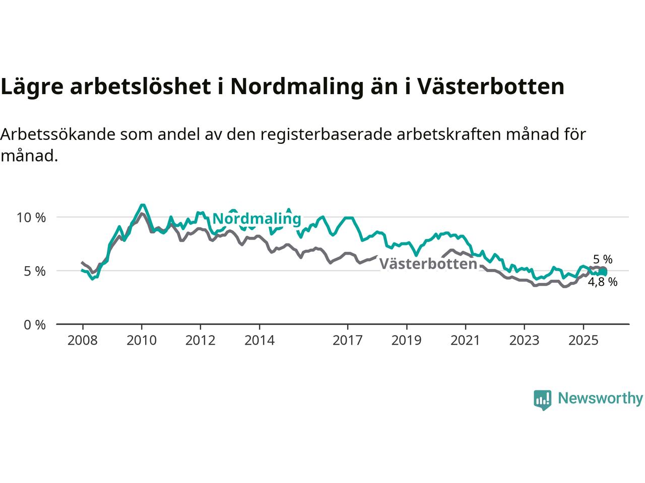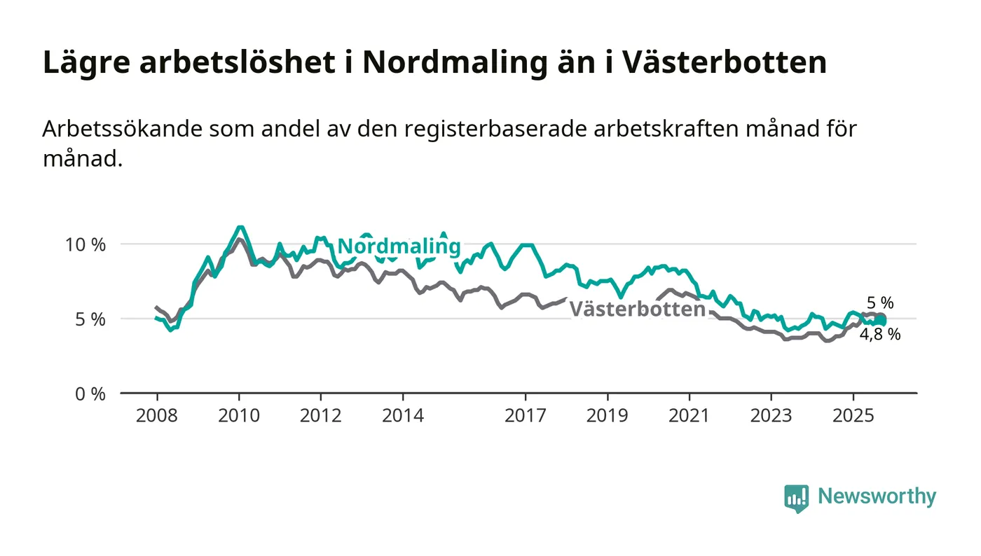 Även om arbetslösheten i Nordmaling alltså ökar, så ligger den fortfarande under snittet i hela Västerbottens län (4,8 procent i kommunen, jämfört med 5,0 procent i hela länet). Vindeln har den lägsta arbetslösheten i länet (3,2 procent), medan Skellefteå har den högsta (7,0 procent). För att Nordmaling skulle komma ner i samma arbetslöshetsnivå som Vindeln skulle 51 personer behöva sysselsättas.