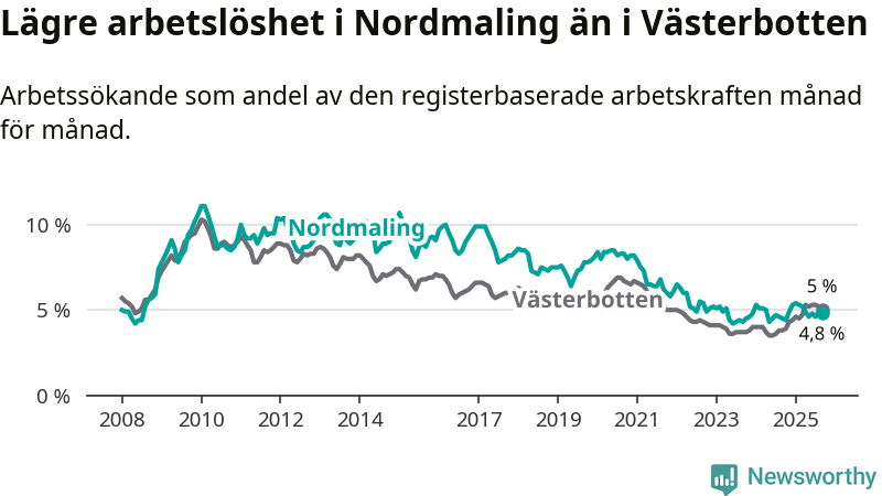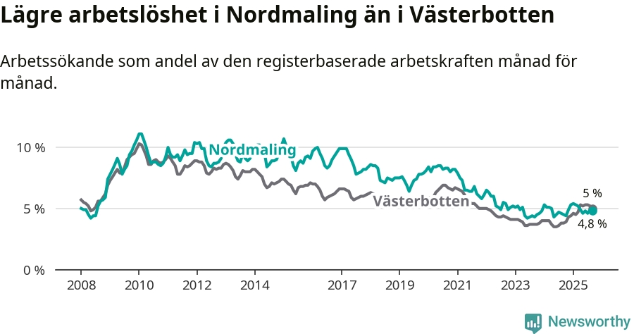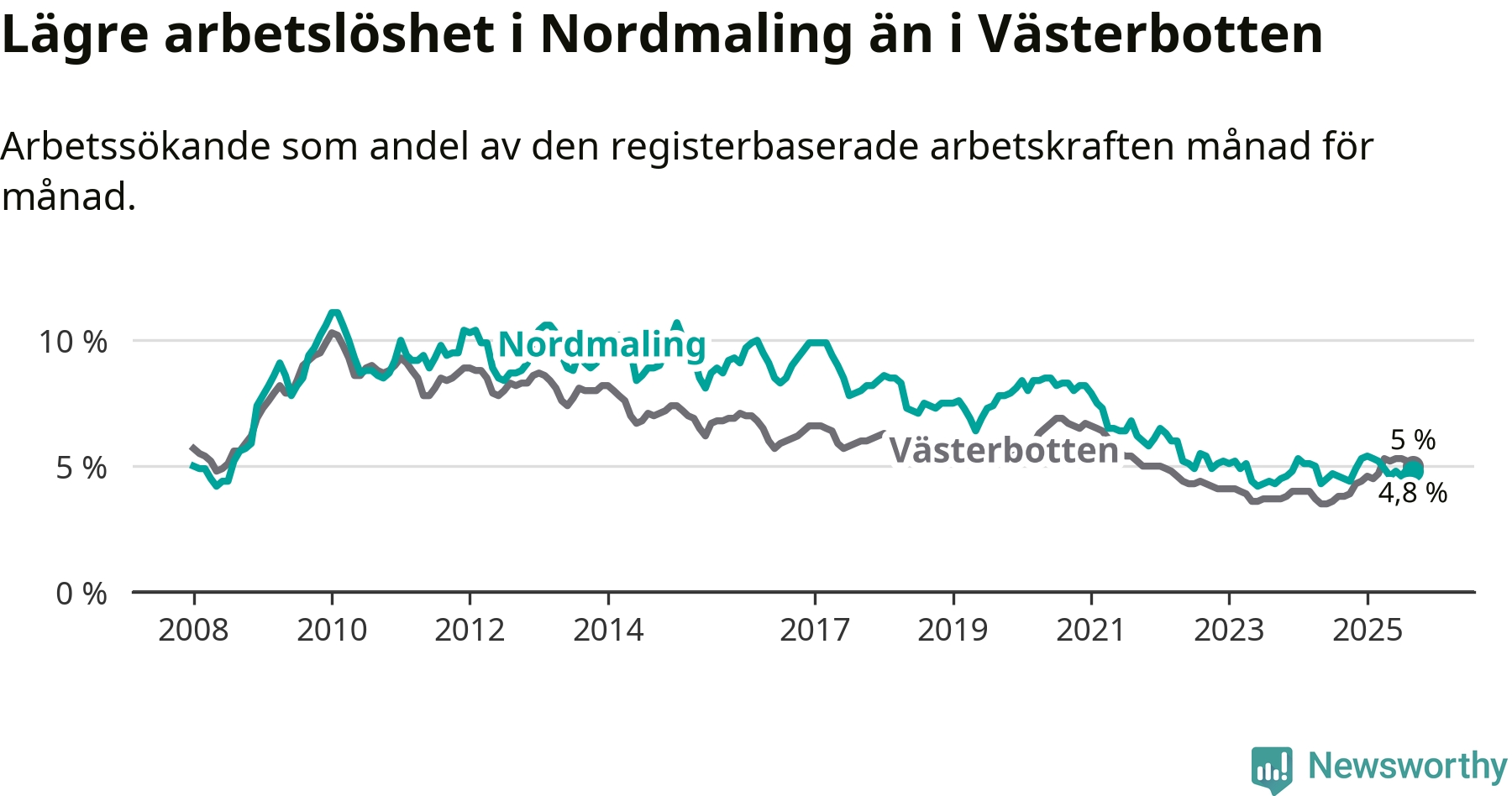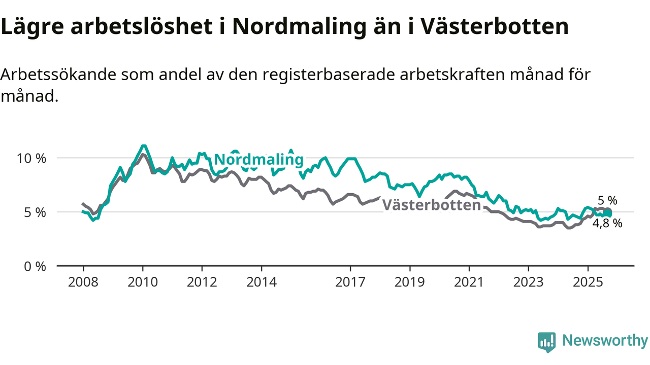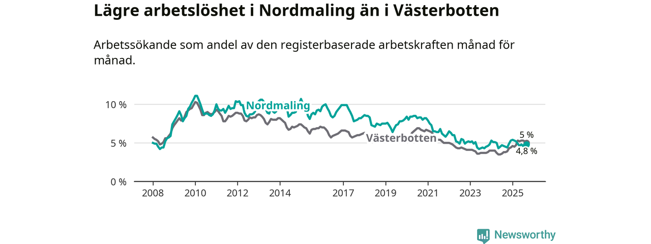Även om arbetslösheten i Nordmaling alltså ökar, så ligger den fortfarande under snittet i hela Västerbottens län (4,8 procent i kommunen, jämfört med 5,0 procent i hela länet). Vindeln har den lägsta arbetslösheten i länet (3,2 procent), medan Skellefteå har den högsta (7,0 procent). För att Nordmaling skulle komma ner i samma arbetslöshetsnivå som Vindeln skulle 51 personer behöva sysselsättas.