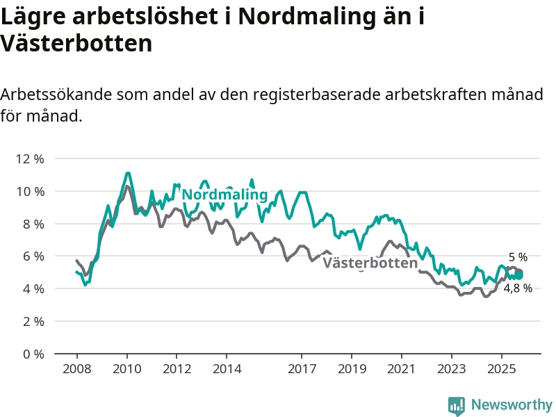 Under september månad rapporterade Nordmalings kommun en total arbetslöshet på 4,8 procent. Det är en ökning jämfört med samma tidpunkt i fjol (+0,3 procentenheter). Även i Västerbottens län stiger arbetslösheten .
