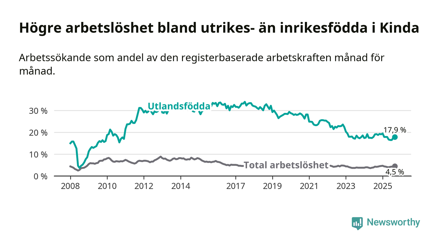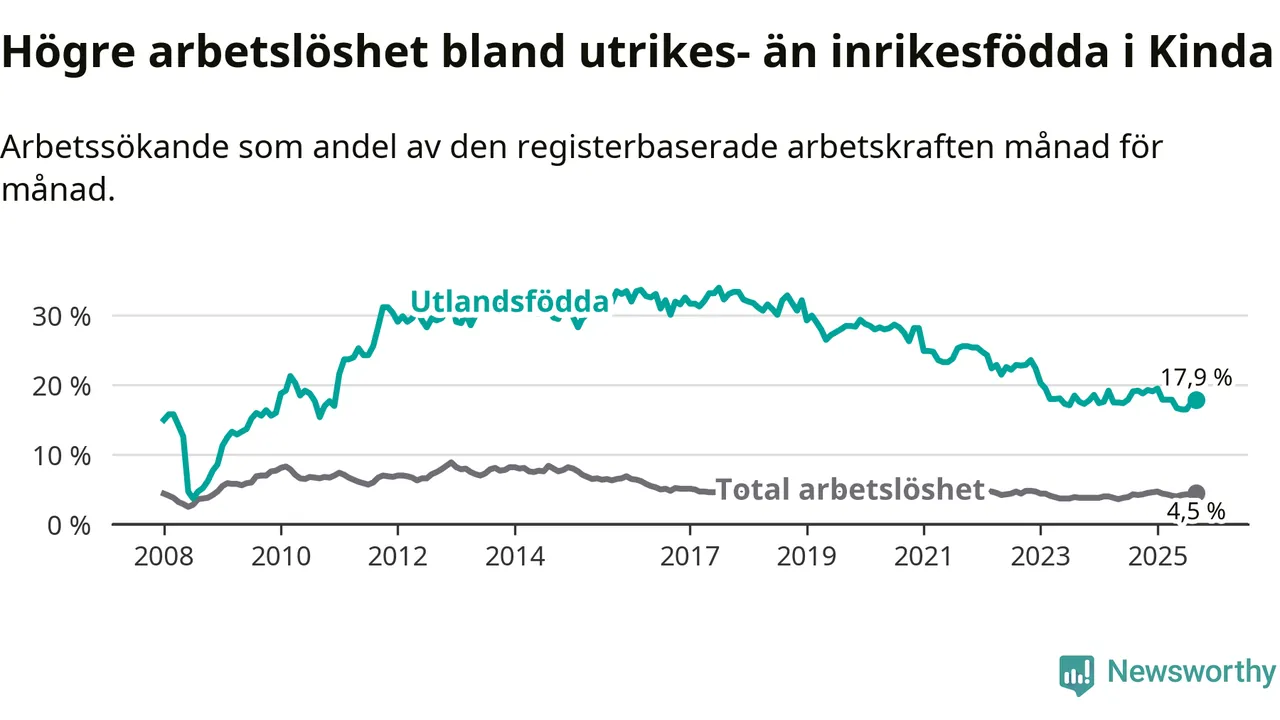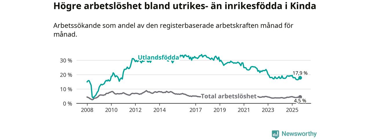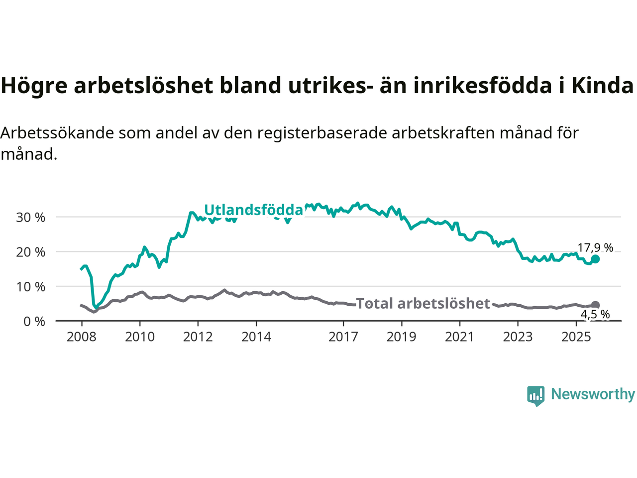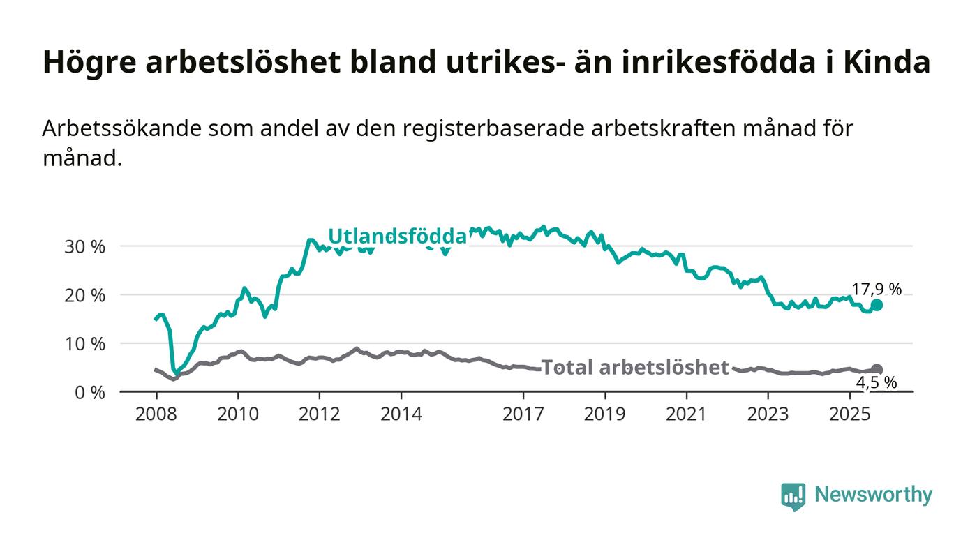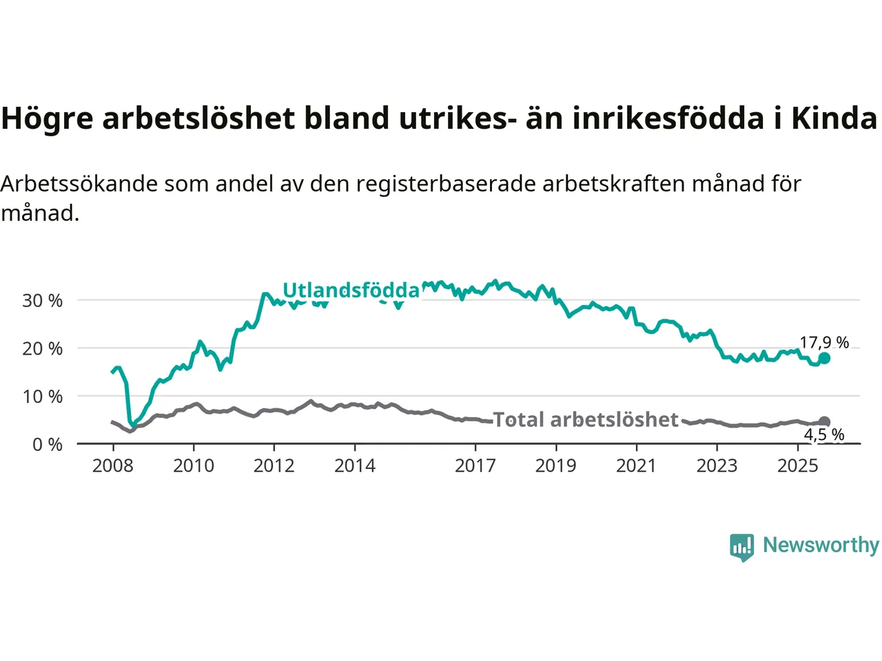 Skillnaden i arbetslöshet mellan utrikesfödda och hela befolkningen är 13,4 procentenheter i Kinda. Det är en betydligt mindre skillnad än för ett år sedan (−1,6 procentenheter).