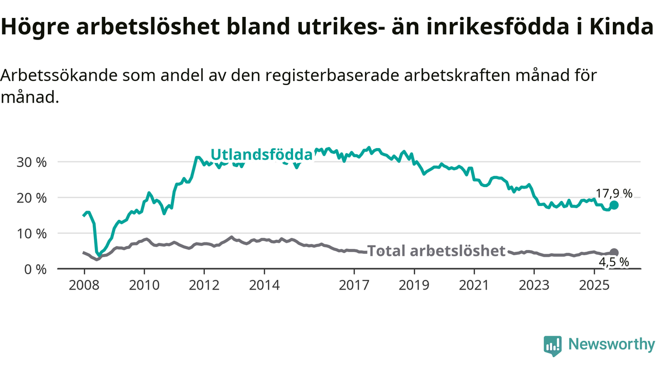 Arbetslösheten bland utlandsfödda var 17,9 procent i Kinda under september månad, motsvarande 90 av 503 personer. Det är 1,3 procentenheter färre än vid samma tidpunkt i fjol (−6 om man räknar personer).