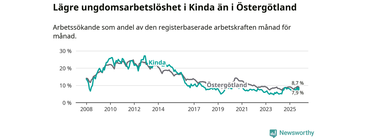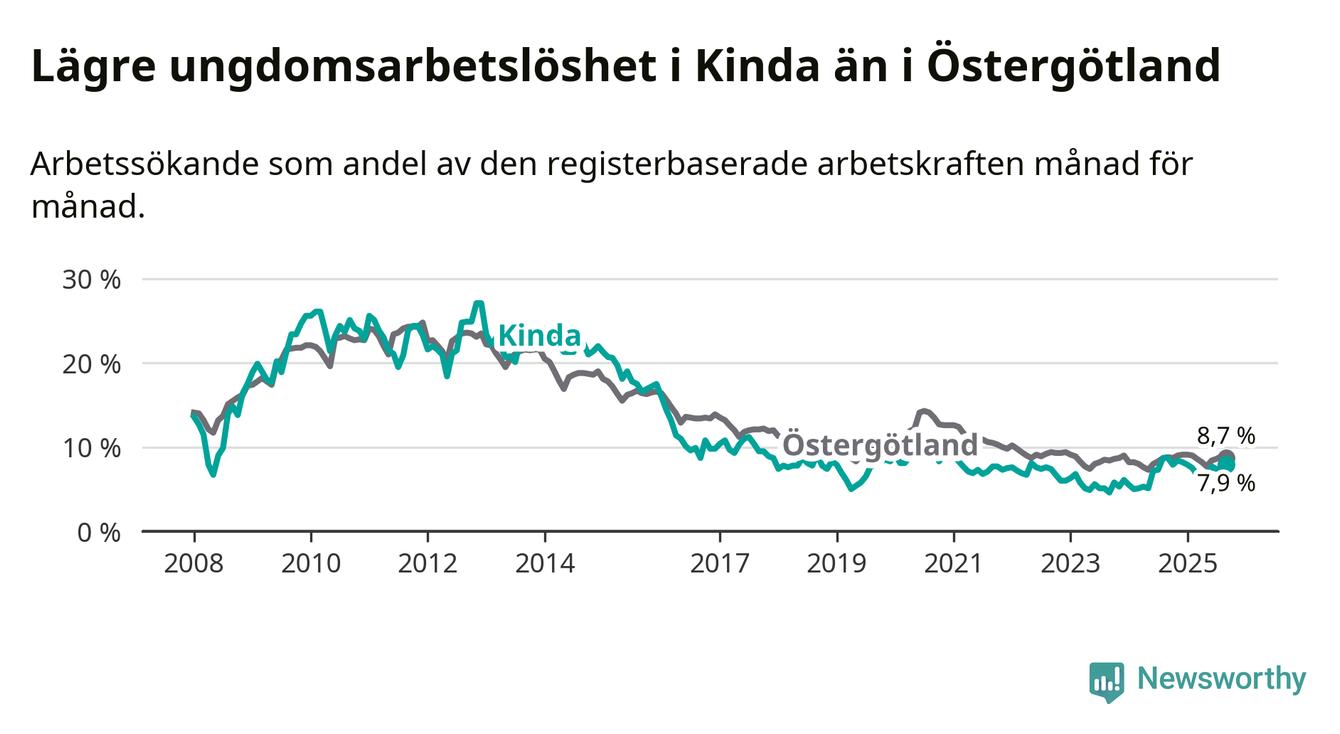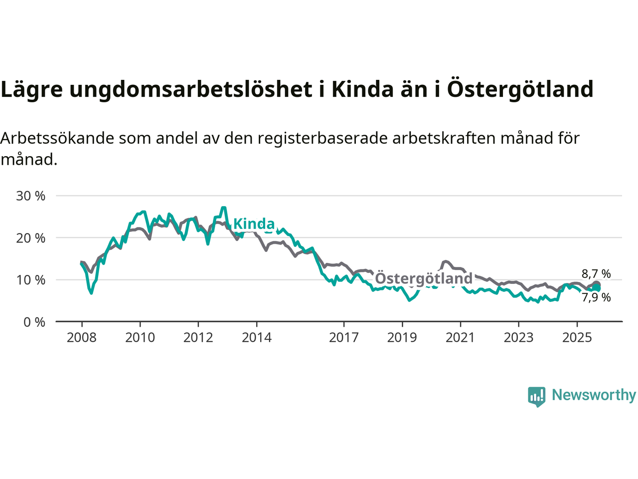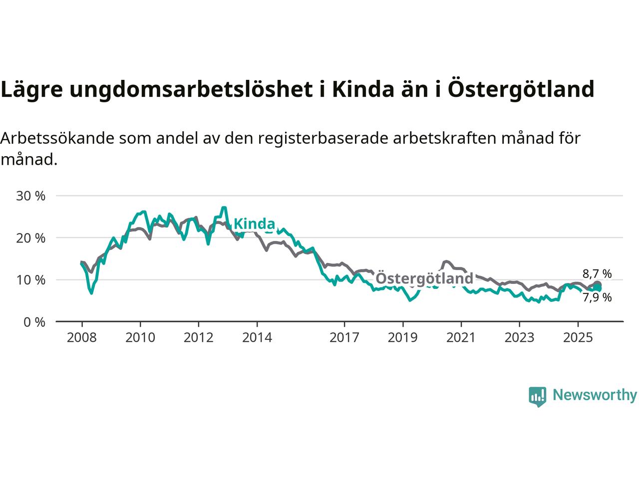 Precis som den totala arbetslösheten ligger ungdomsarbetslösheten i Kinda lägre än i Östergötland som helhet. Skillnaden mellan kommunen och länet är 0,8 procentenheter.