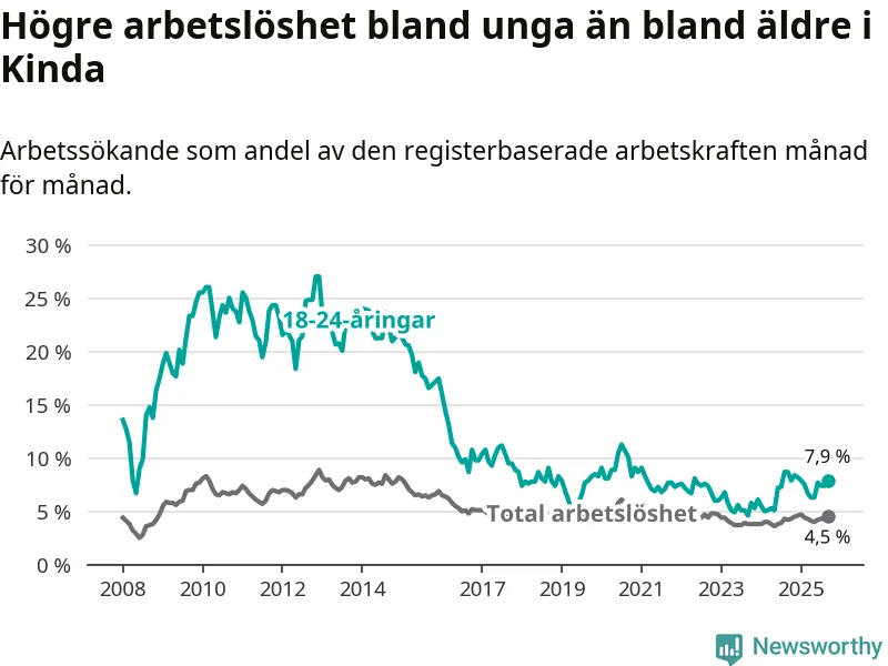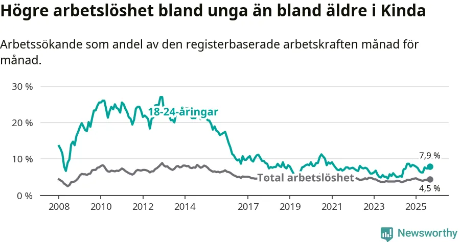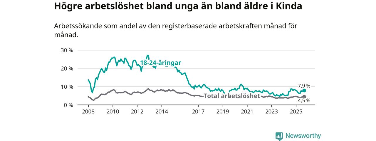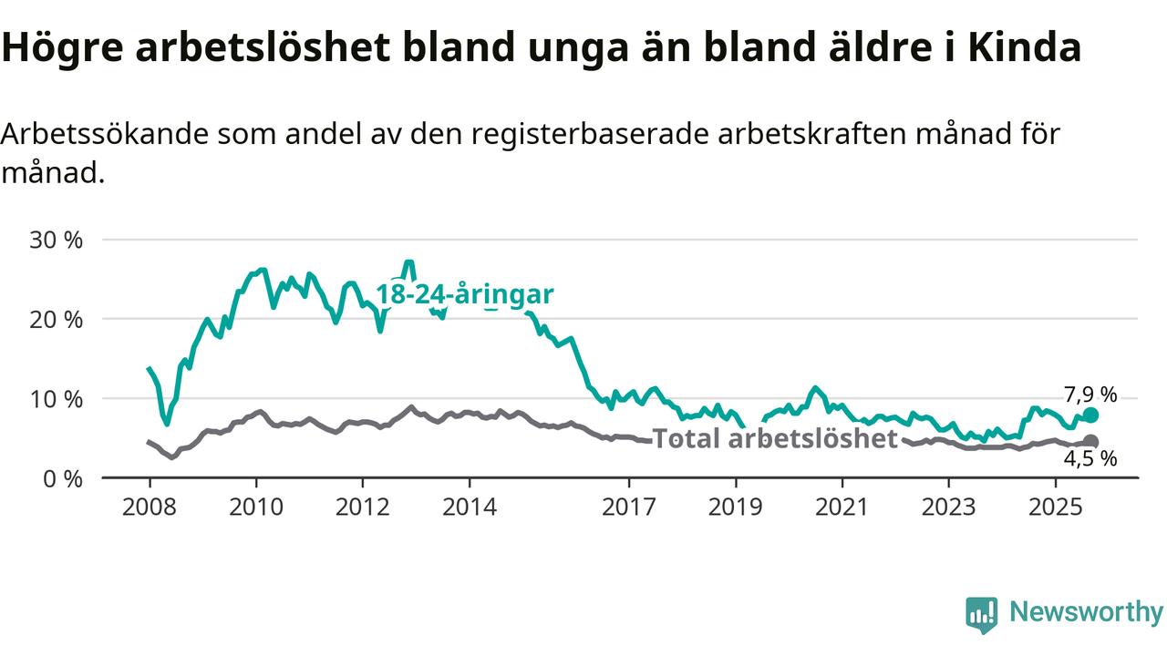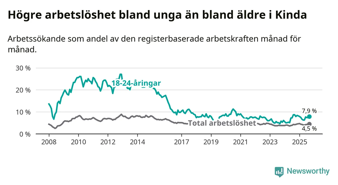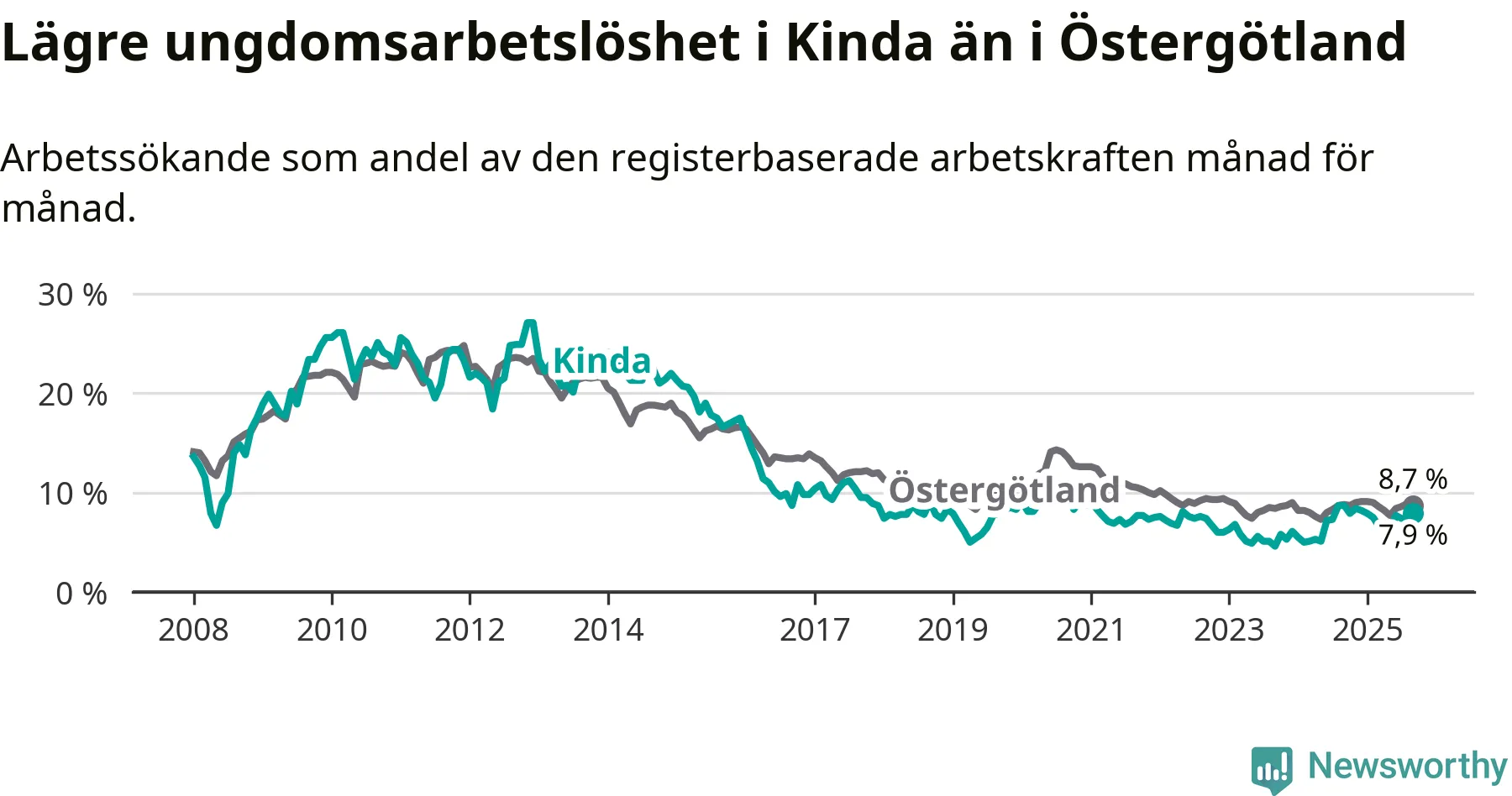 Precis som den totala arbetslösheten ligger ungdomsarbetslösheten i Kinda lägre än i Östergötland som helhet. Skillnaden mellan kommunen och länet är 0,8 procentenheter.