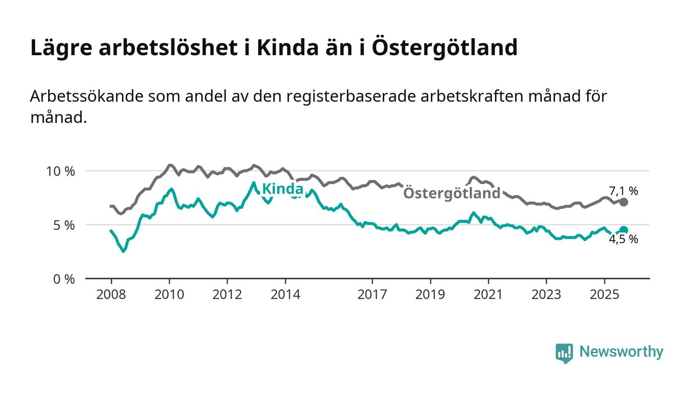 Även om arbetslösheten i Kinda alltså ökar, så ligger den fortfarande under snittet i hela Östergötlands län (4,5 procent i kommunen, jämfört med 7,1 procent i hela länet). Ydre har den lägsta arbetslösheten i länet (3,3 procent), medan Norrköping har den högsta (9,3 procent). För att Kinda skulle komma ner i samma arbetslöshetsnivå som Ydre skulle 55 personer behöva sysselsättas.