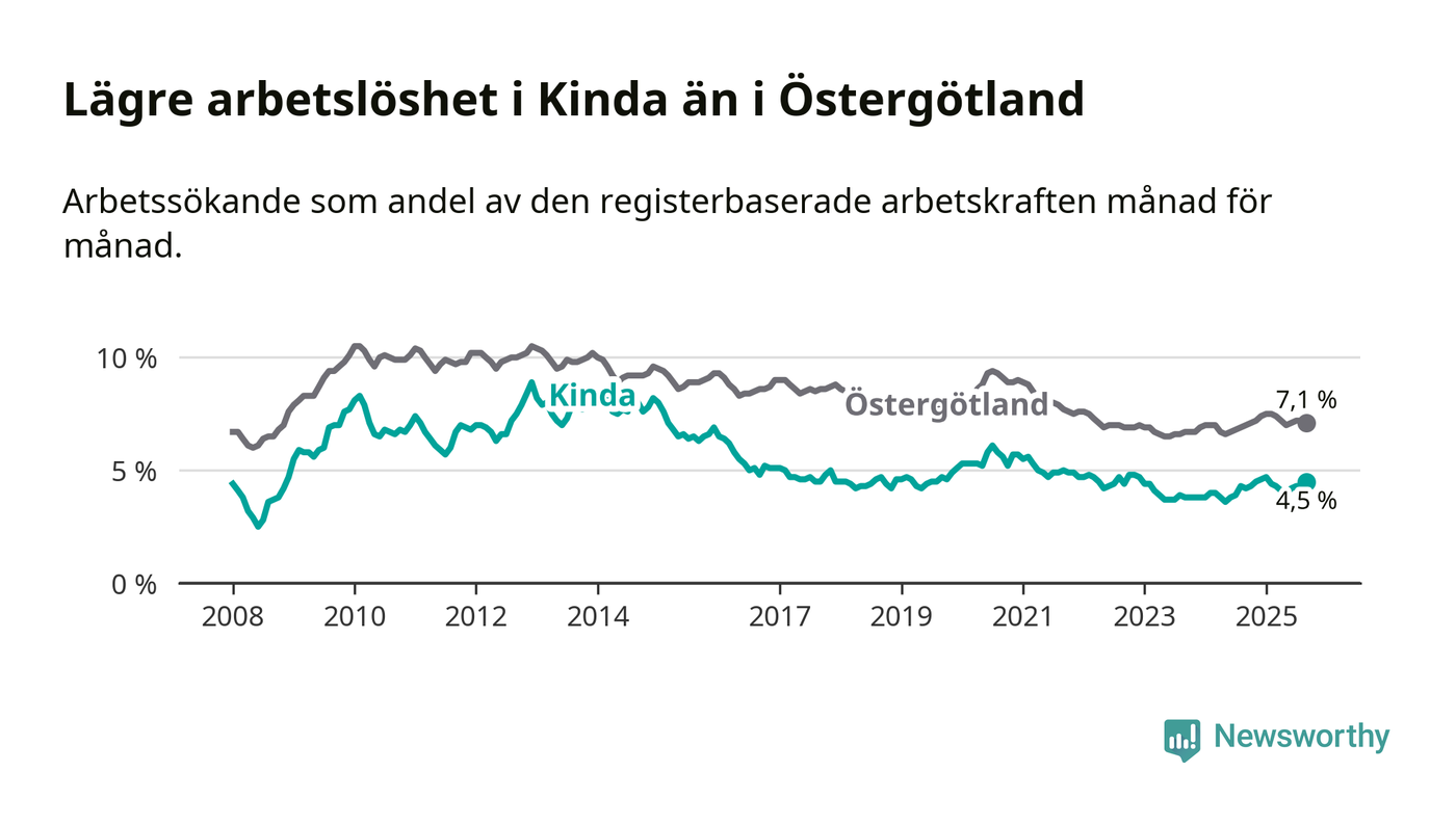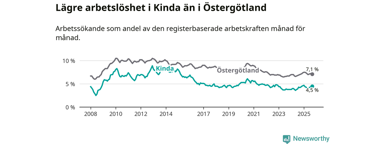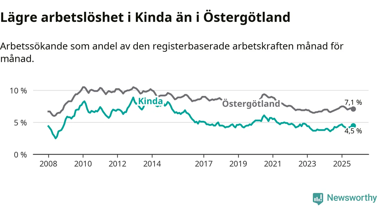 Kinda är inte den enda kommunen i Östergötland där arbetslösheten går uppåt. Vi ser just nu en uppgång i åtta av 13 kommuner. Störst är ökningen i Valdemarsvik, där arbetslösheten stiger med 0,8 procentenheter. I tabellen längre ner ser du utvecklingen i samtliga kommuner i länet.