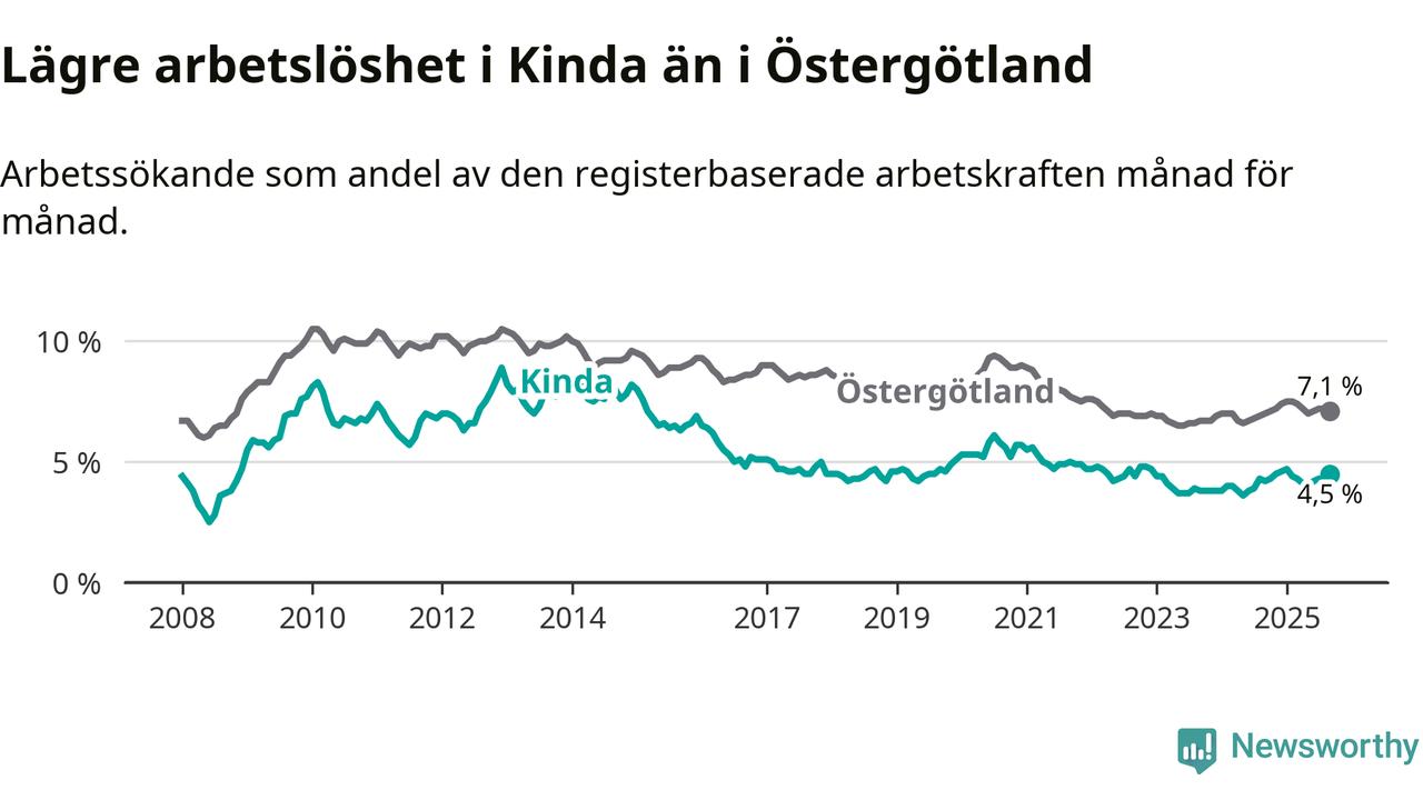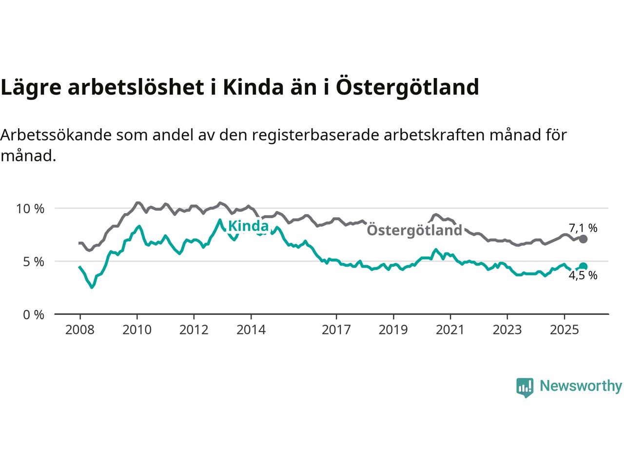 Under september månad rapporterade Kinda kommun en total arbetslöshet på 4,5 procent. Det är en ökning jämfört med samma tidpunkt i fjol (+0,3 procentenheter). Även i Östergötlands län stiger arbetslösheten något.