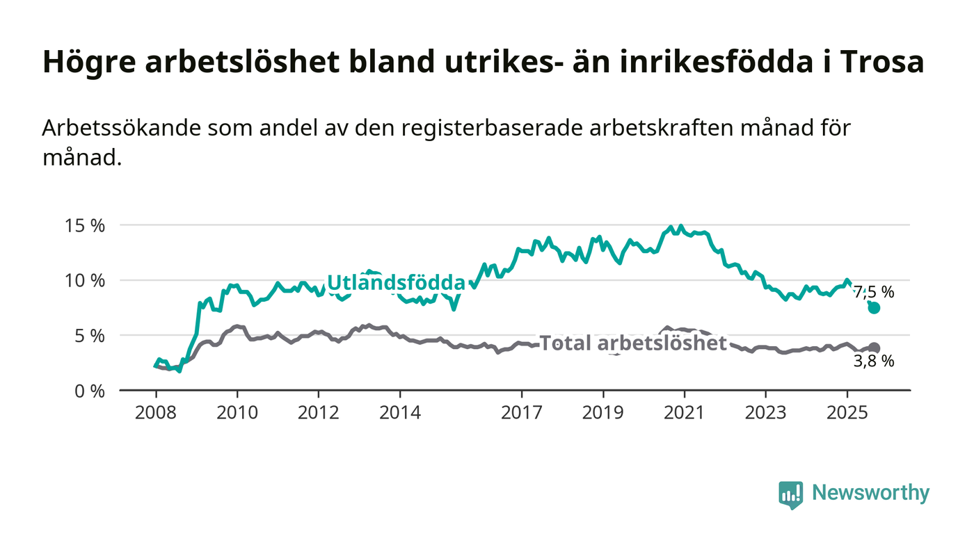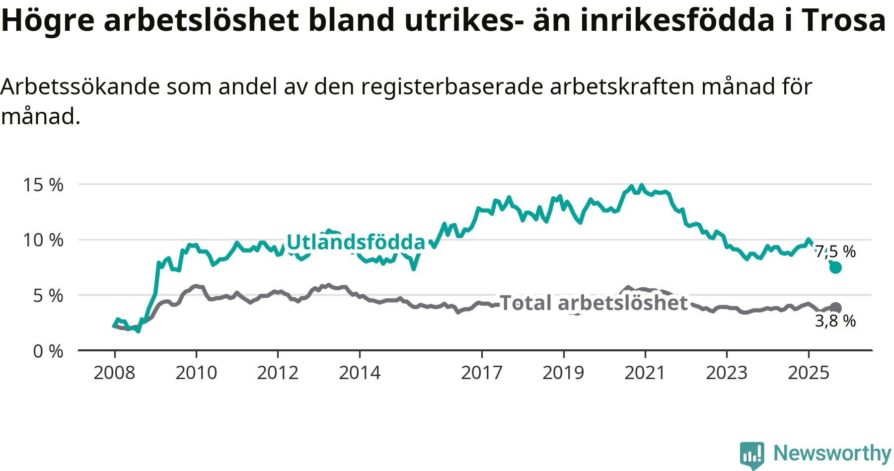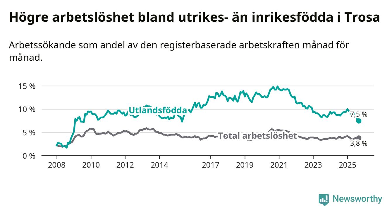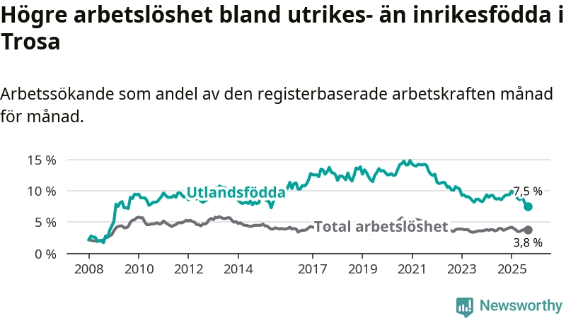 Skillnaden i arbetslöshet mellan utrikesfödda och hela befolkningen är 3,7 procentenheter i Trosa. Det är en betydligt mindre skillnad än för ett år sedan (−1,6 procentenheter).