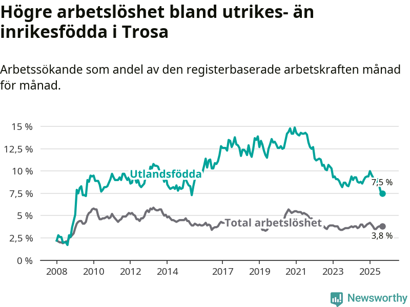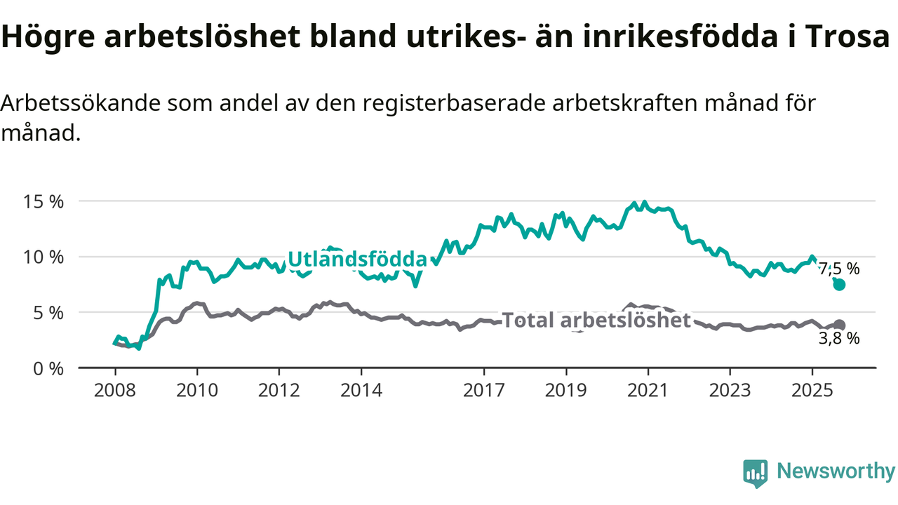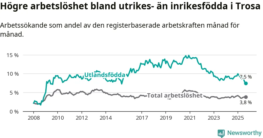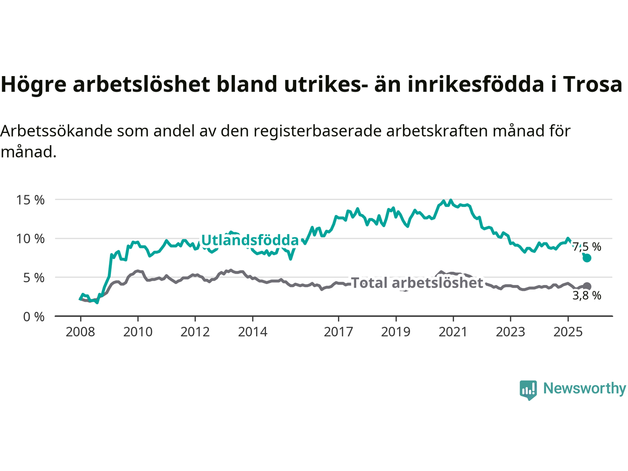 Skillnaden i arbetslöshet mellan utrikesfödda och hela befolkningen är 3,7 procentenheter i Trosa. Det är en betydligt mindre skillnad än för ett år sedan (−1,6 procentenheter).