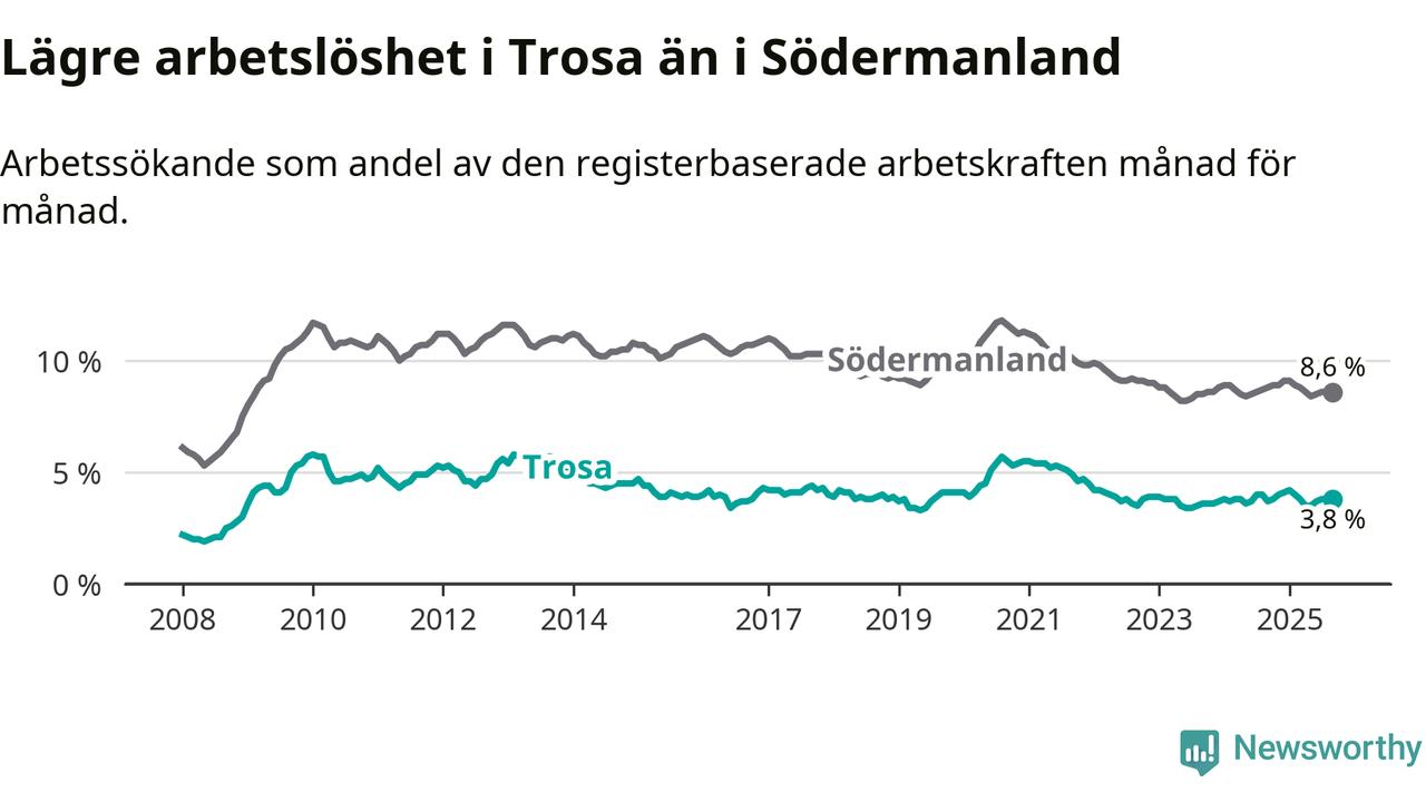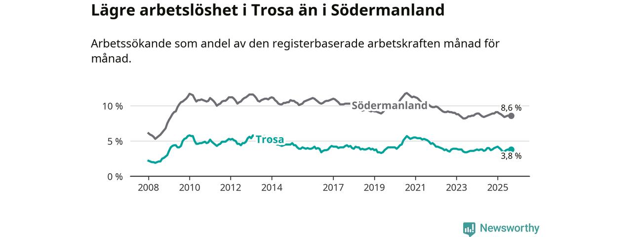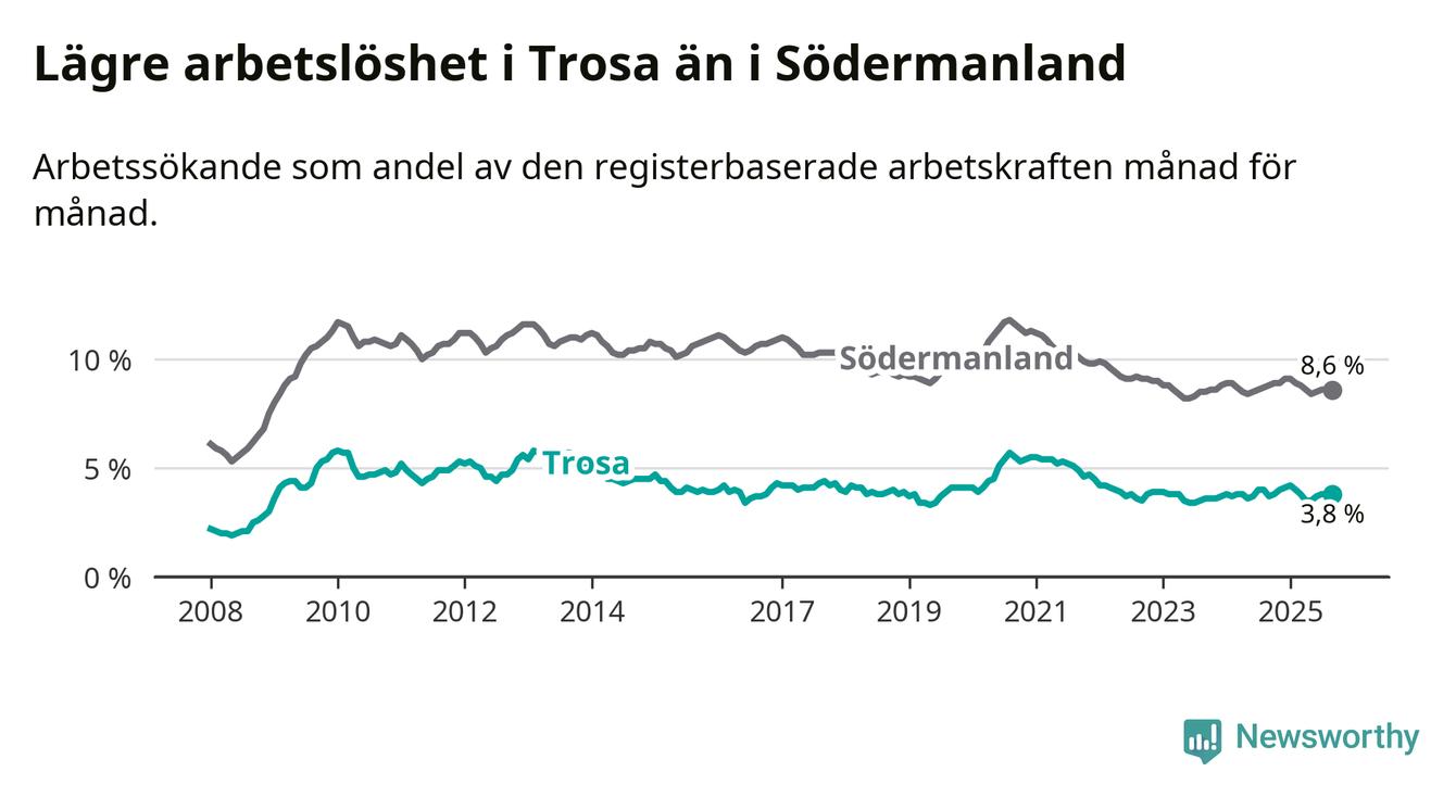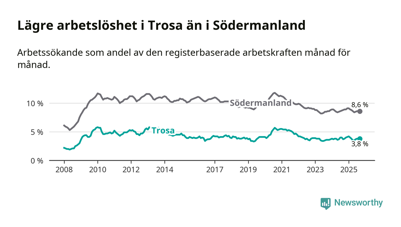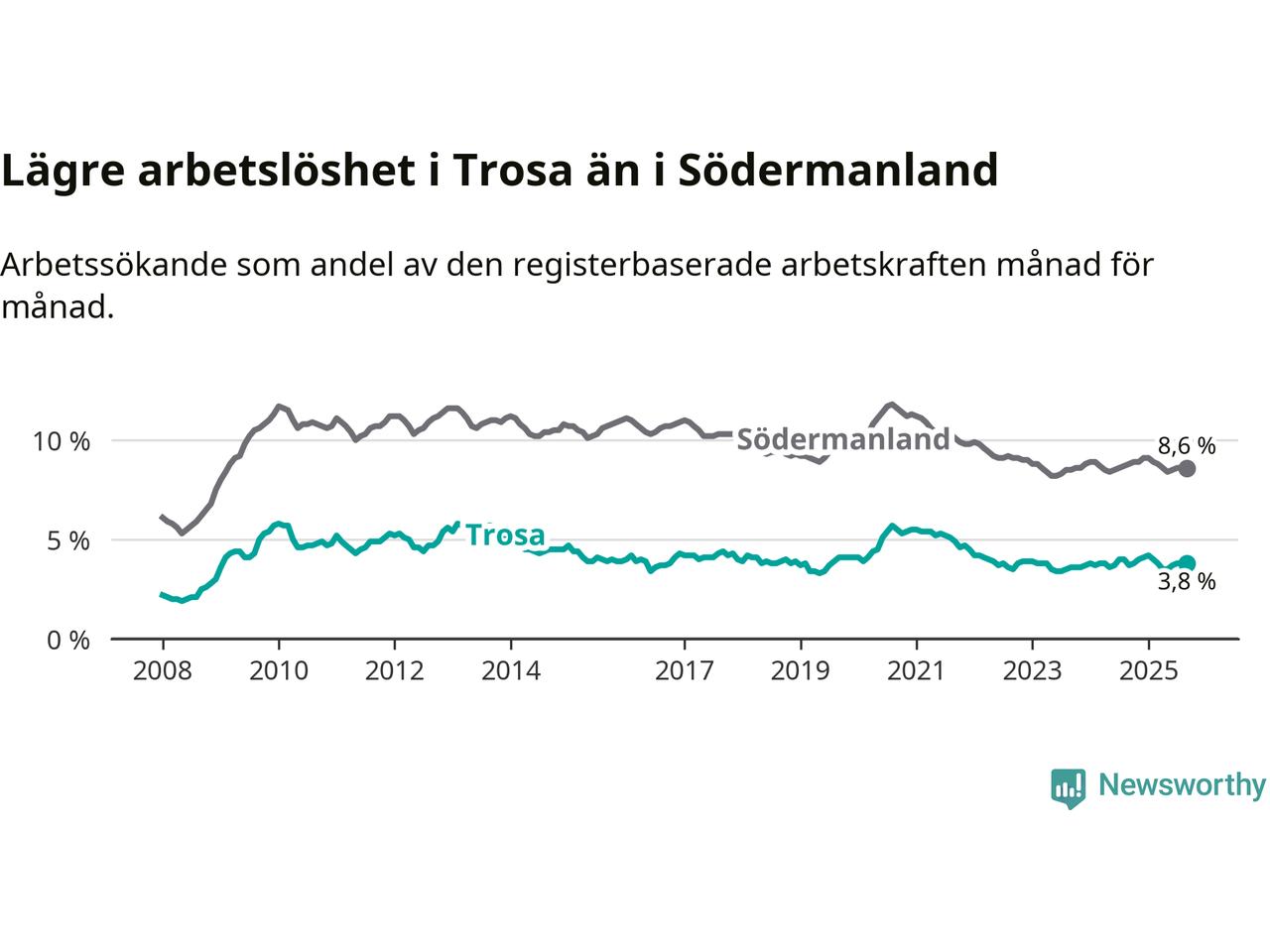 Även om arbetslösheten i Trosa alltså ökar, så ligger den fortfarande under snittet i hela Södermanlands län (3,8 procent i kommunen, jämfört med 8,6 procent i hela länet). Trosa har därmed även den lägsta arbetslöshetsnivån i länet. Eskilstuna har den högsta (10,9 procent).