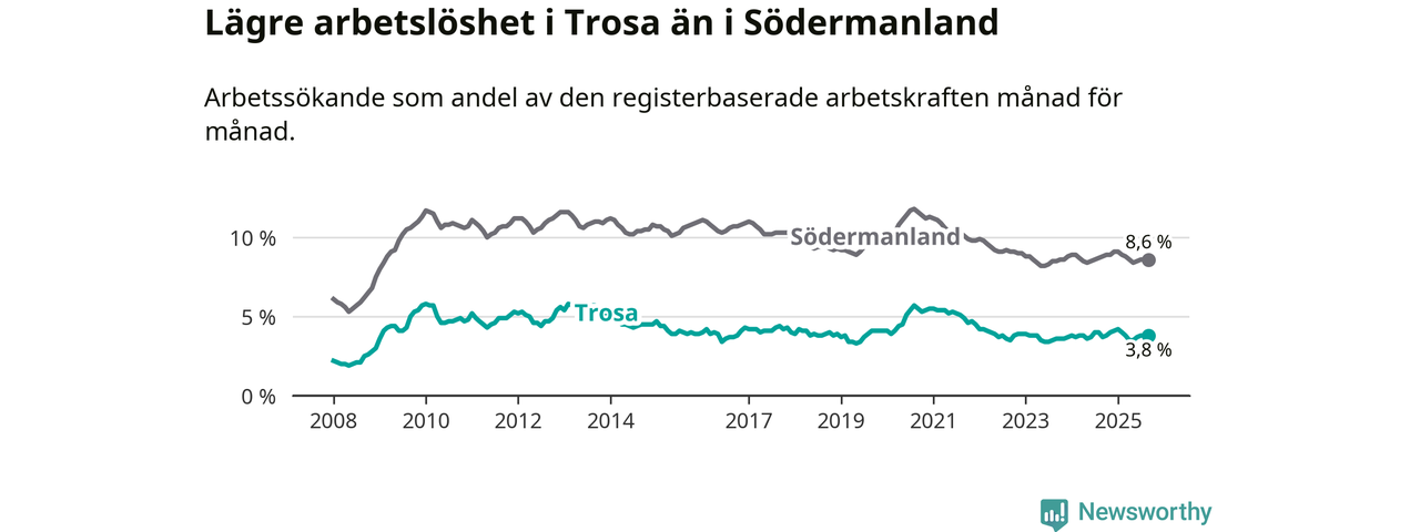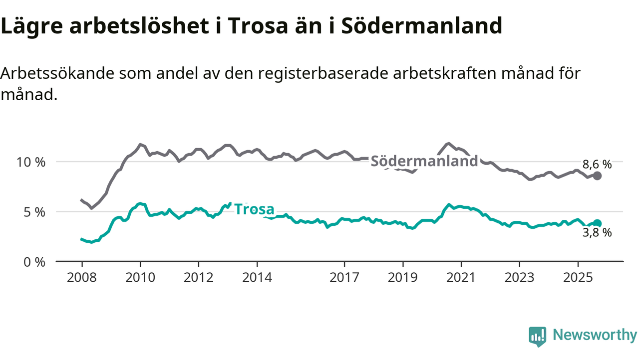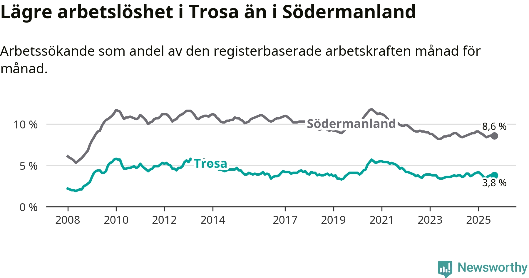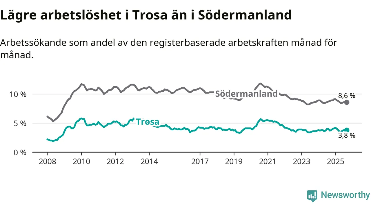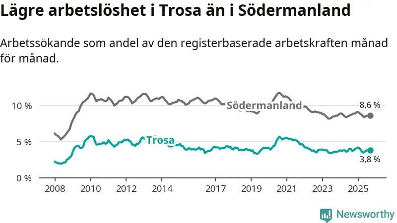 Även om arbetslösheten i Trosa alltså ökar, så ligger den fortfarande under snittet i hela Södermanlands län (3,8 procent i kommunen, jämfört med 8,6 procent i hela länet). Trosa har därmed även den lägsta arbetslöshetsnivån i länet. Eskilstuna har den högsta (10,9 procent).