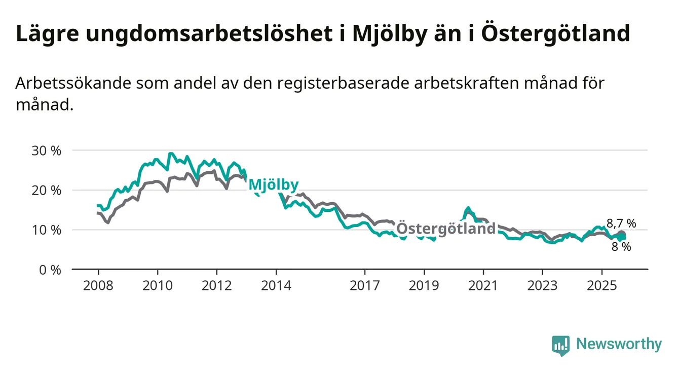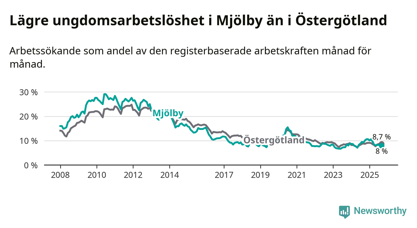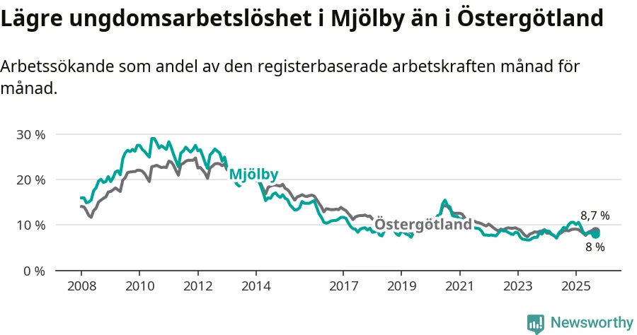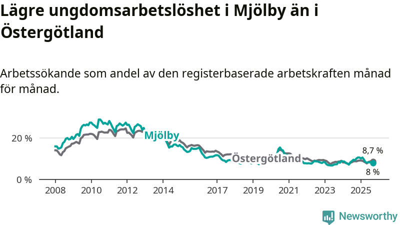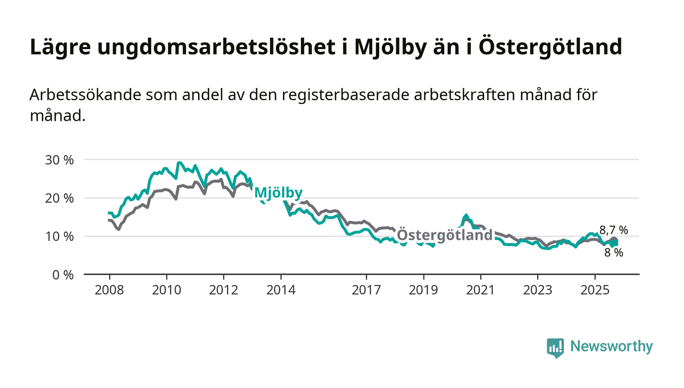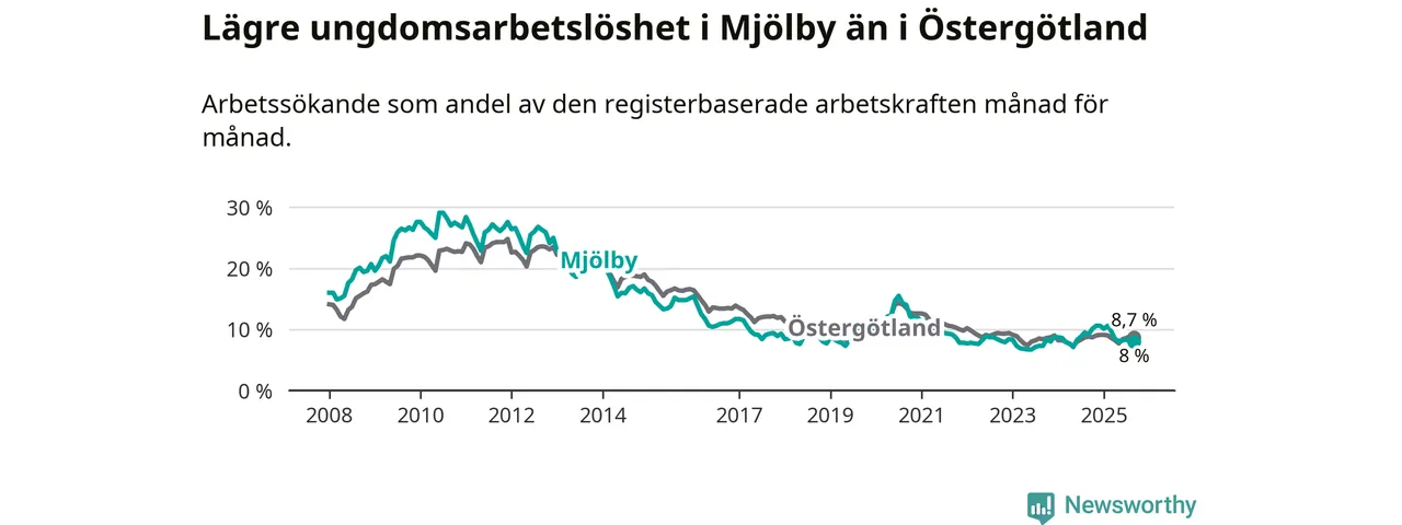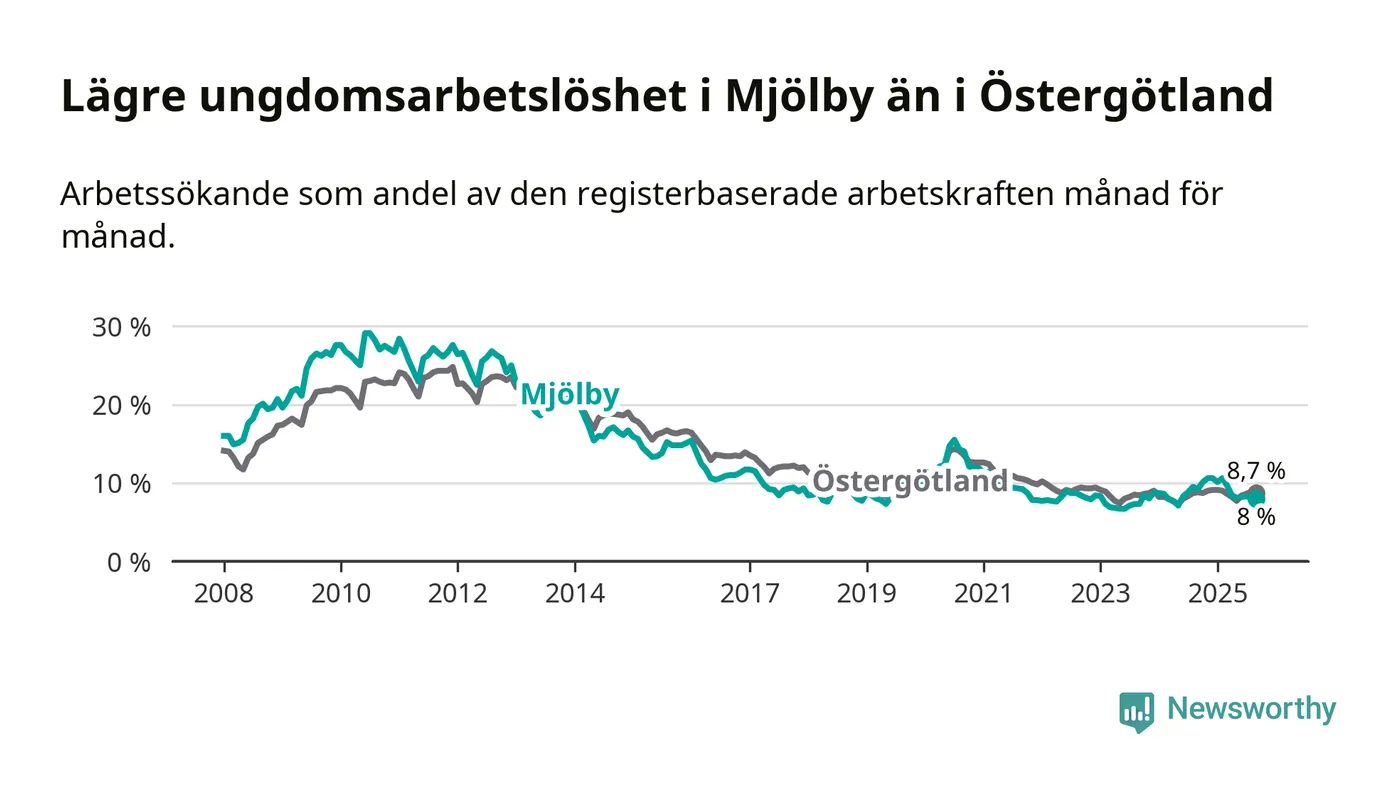Precis som den totala arbetslösheten ligger ungdomsarbetslösheten i Mjölby lägre än i Östergötland som helhet. Skillnaden mellan kommunen och länet är 0,7 procentenheter.
