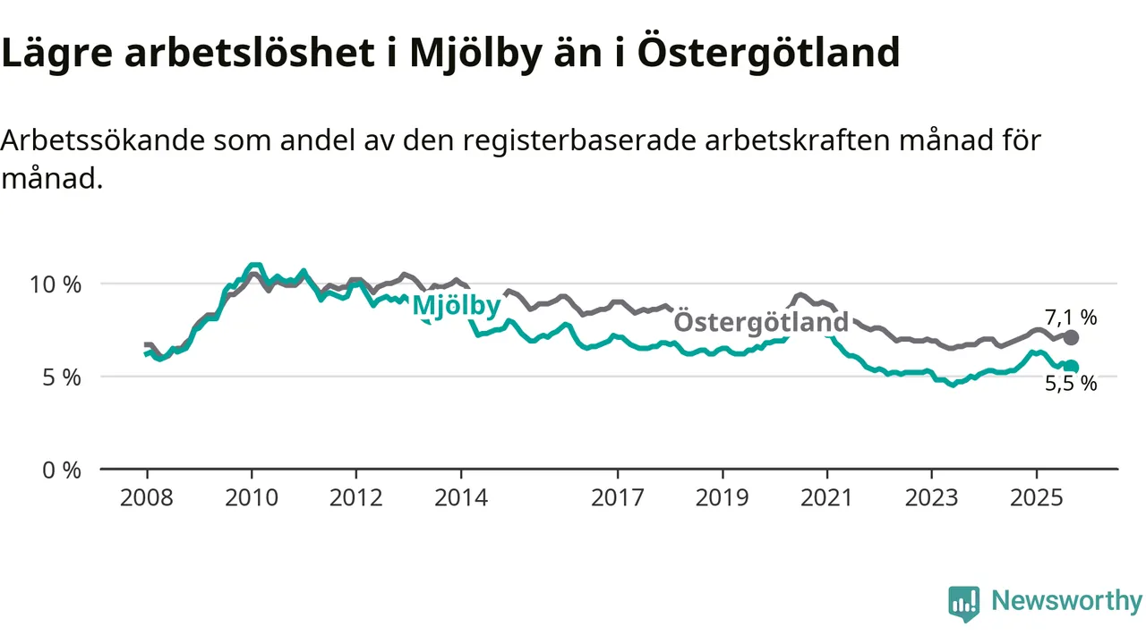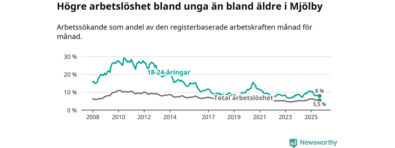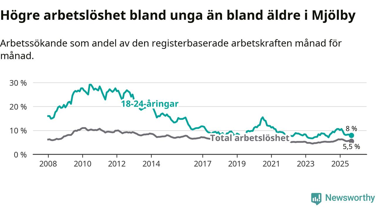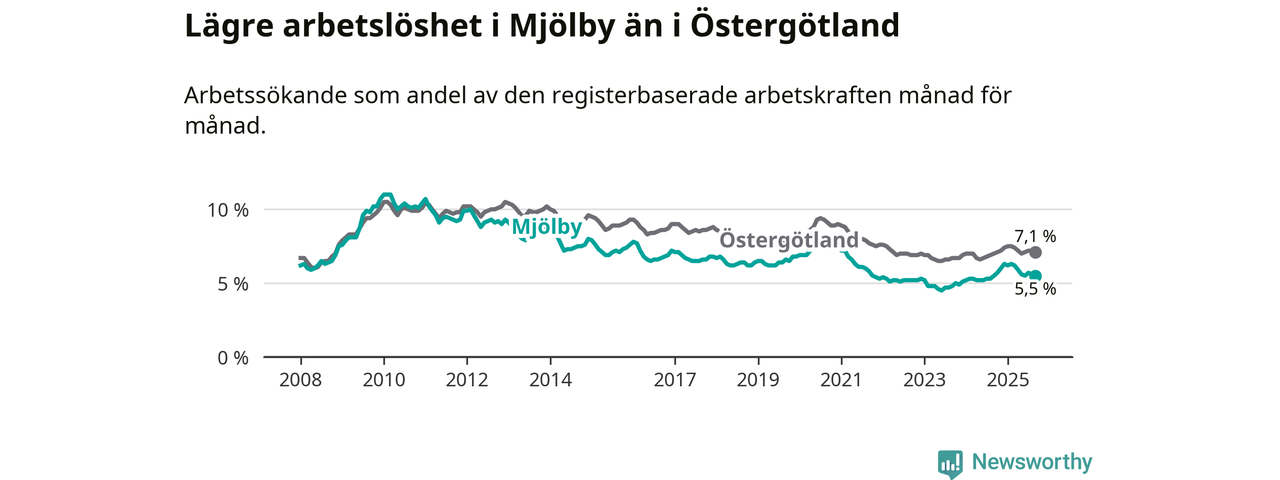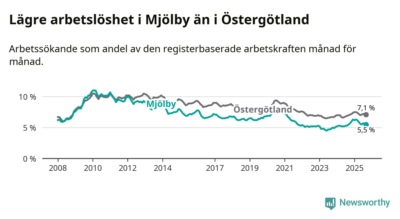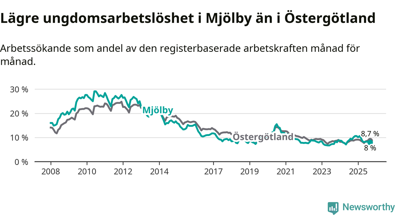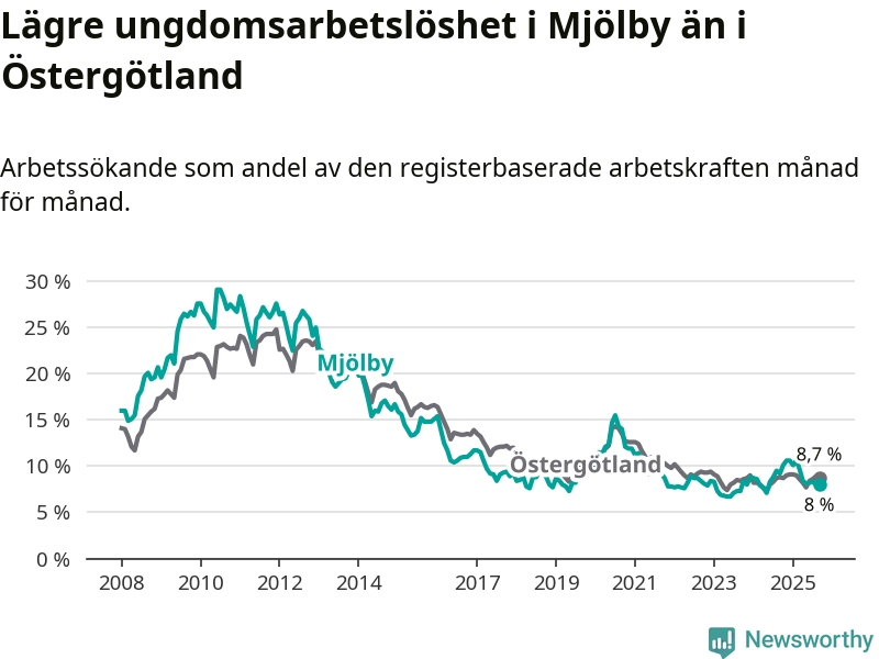 Precis som den totala arbetslösheten ligger ungdomsarbetslösheten i Mjölby lägre än i Östergötland som helhet. Skillnaden mellan kommunen och länet är 0,7 procentenheter.