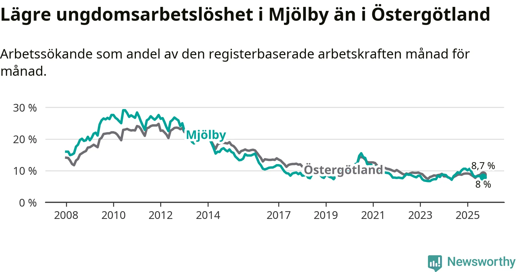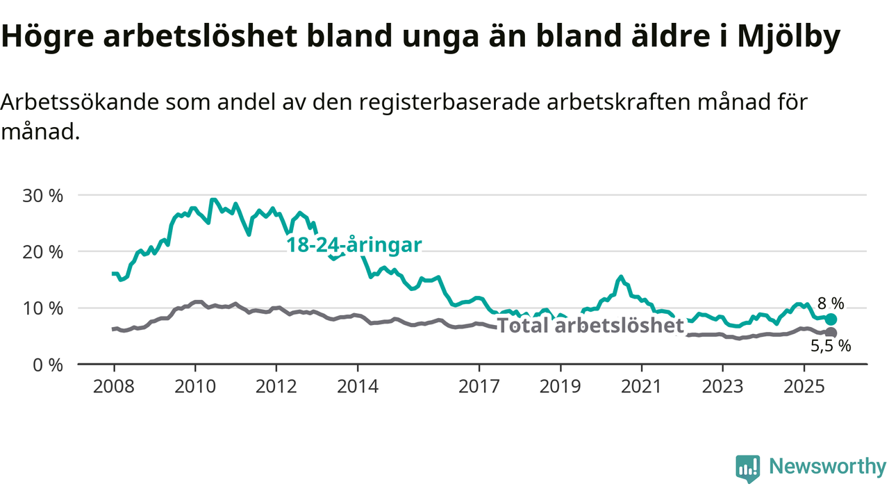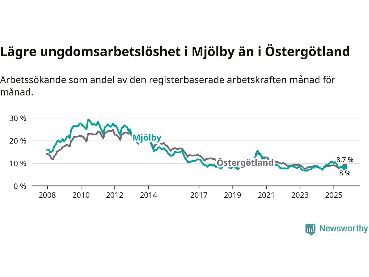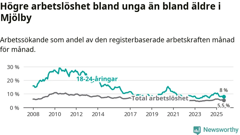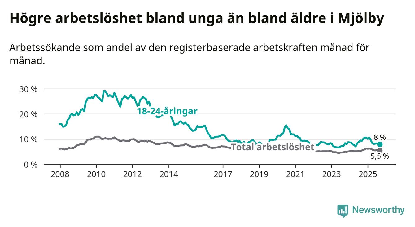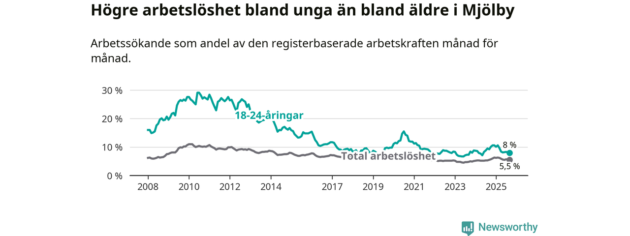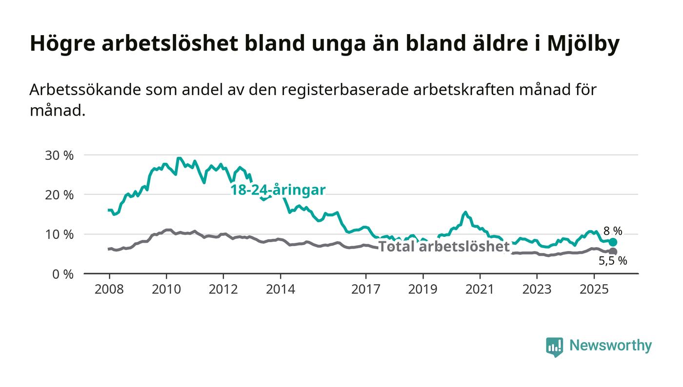 Precis som den totala arbetslösheten ligger ungdomsarbetslösheten i Mjölby lägre än i Östergötland som helhet. Skillnaden mellan kommunen och länet är 0,7 procentenheter.