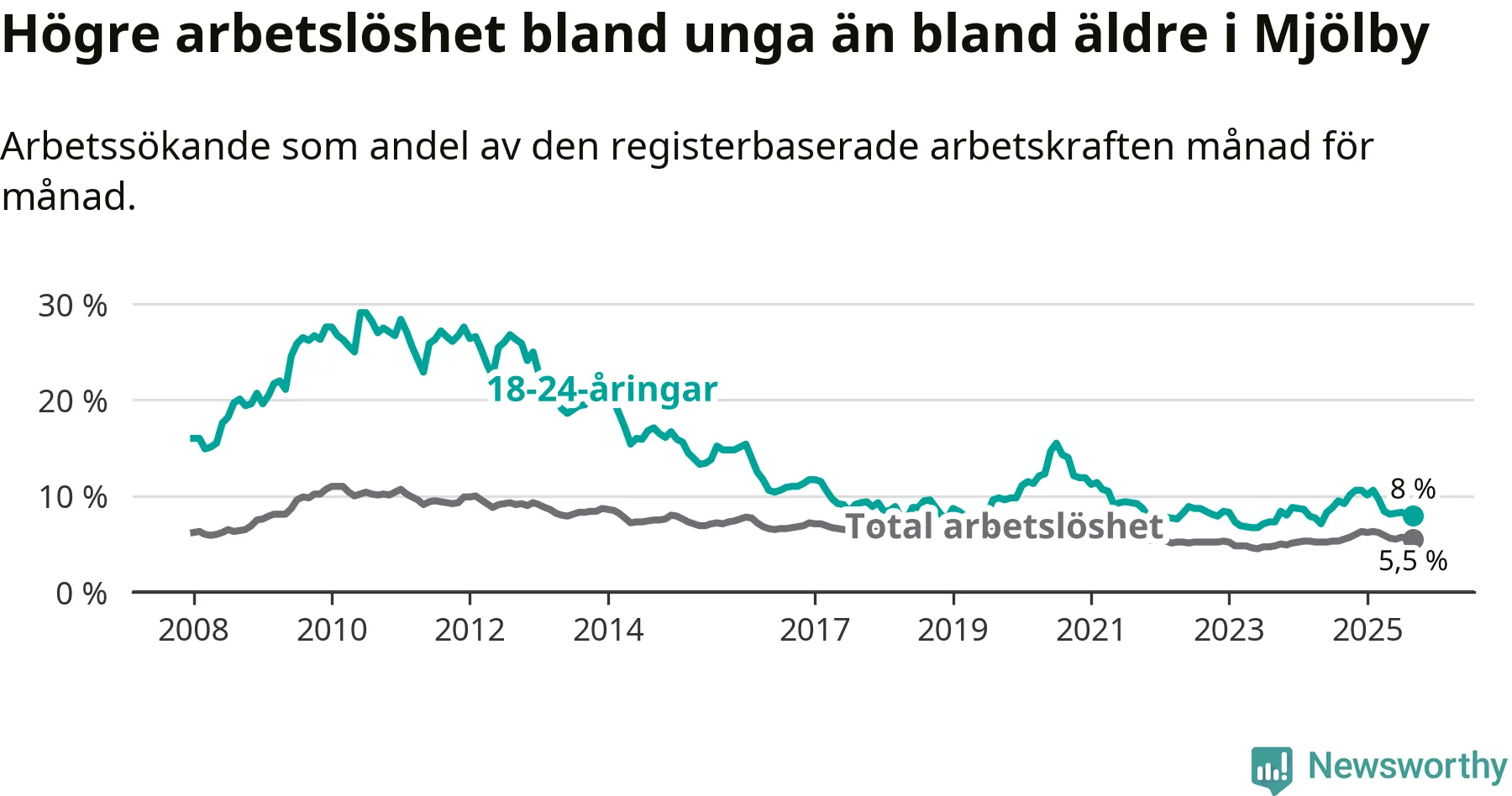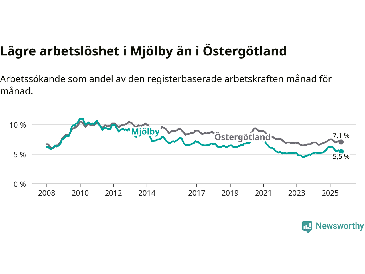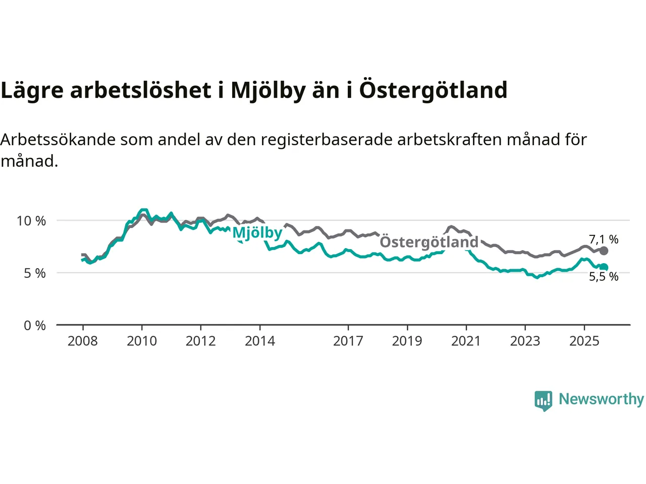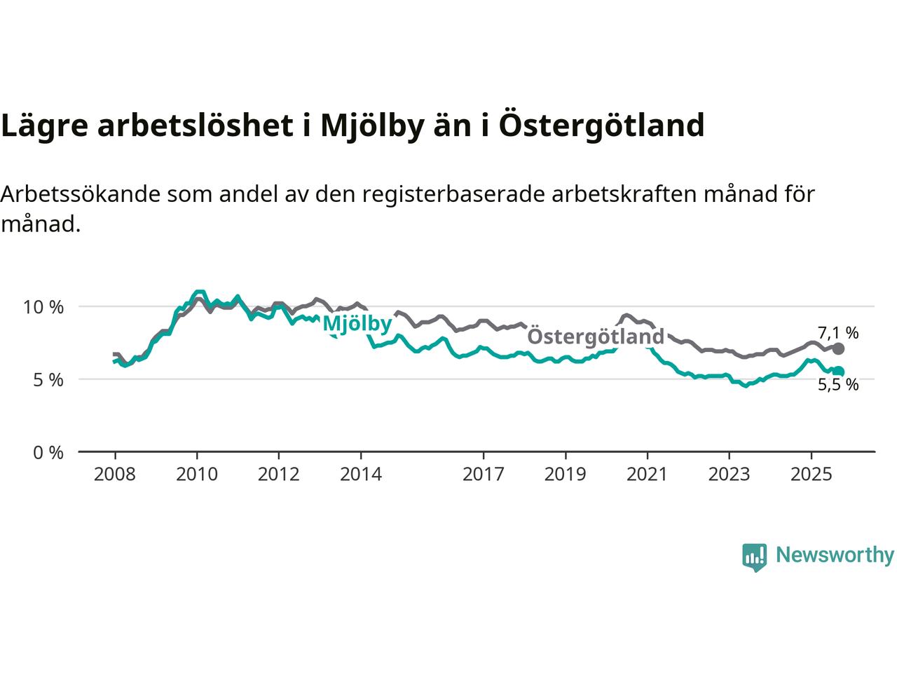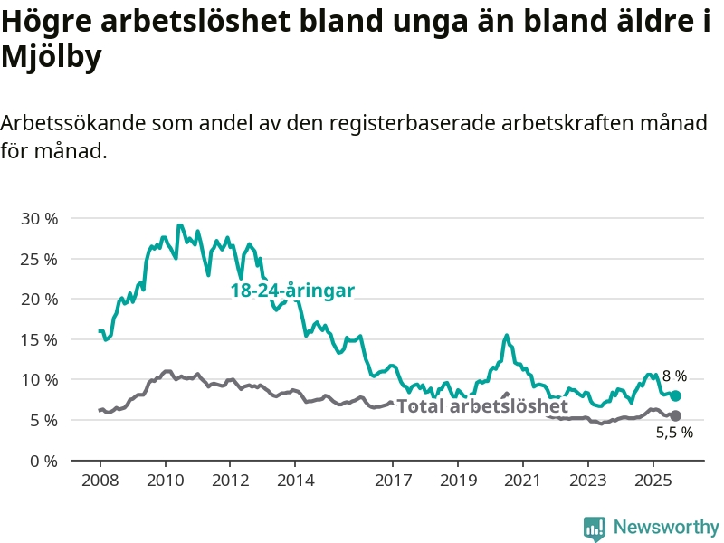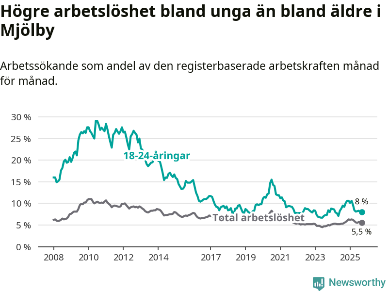 Precis som den totala arbetslösheten ligger ungdomsarbetslösheten i Mjölby lägre än i Östergötland som helhet. Skillnaden mellan kommunen och länet är 0,7 procentenheter.