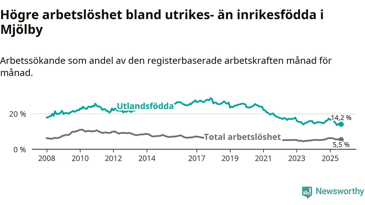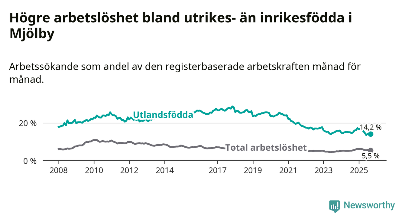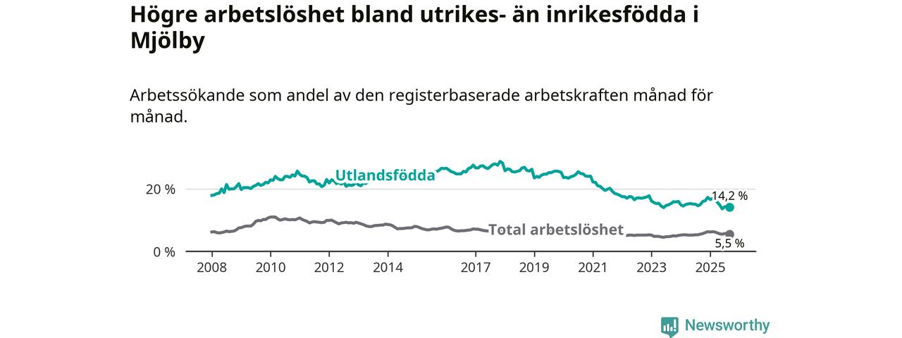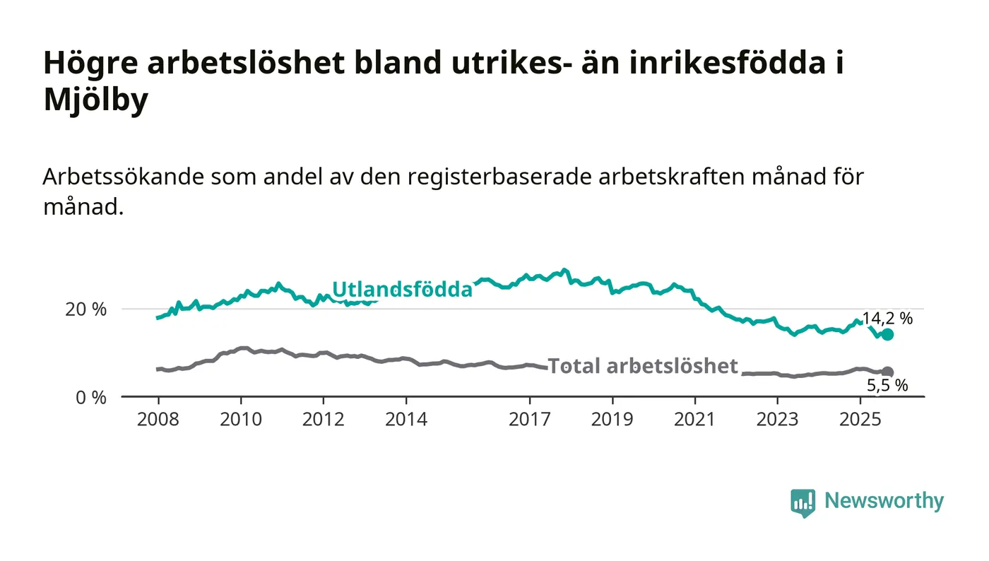 Skillnaden i arbetslöshet mellan utrikesfödda och hela befolkningen är 8,7 procentenheter i Mjölby. Det är en mindre skillnad än för ett år sedan (−0,8 procentenheter).