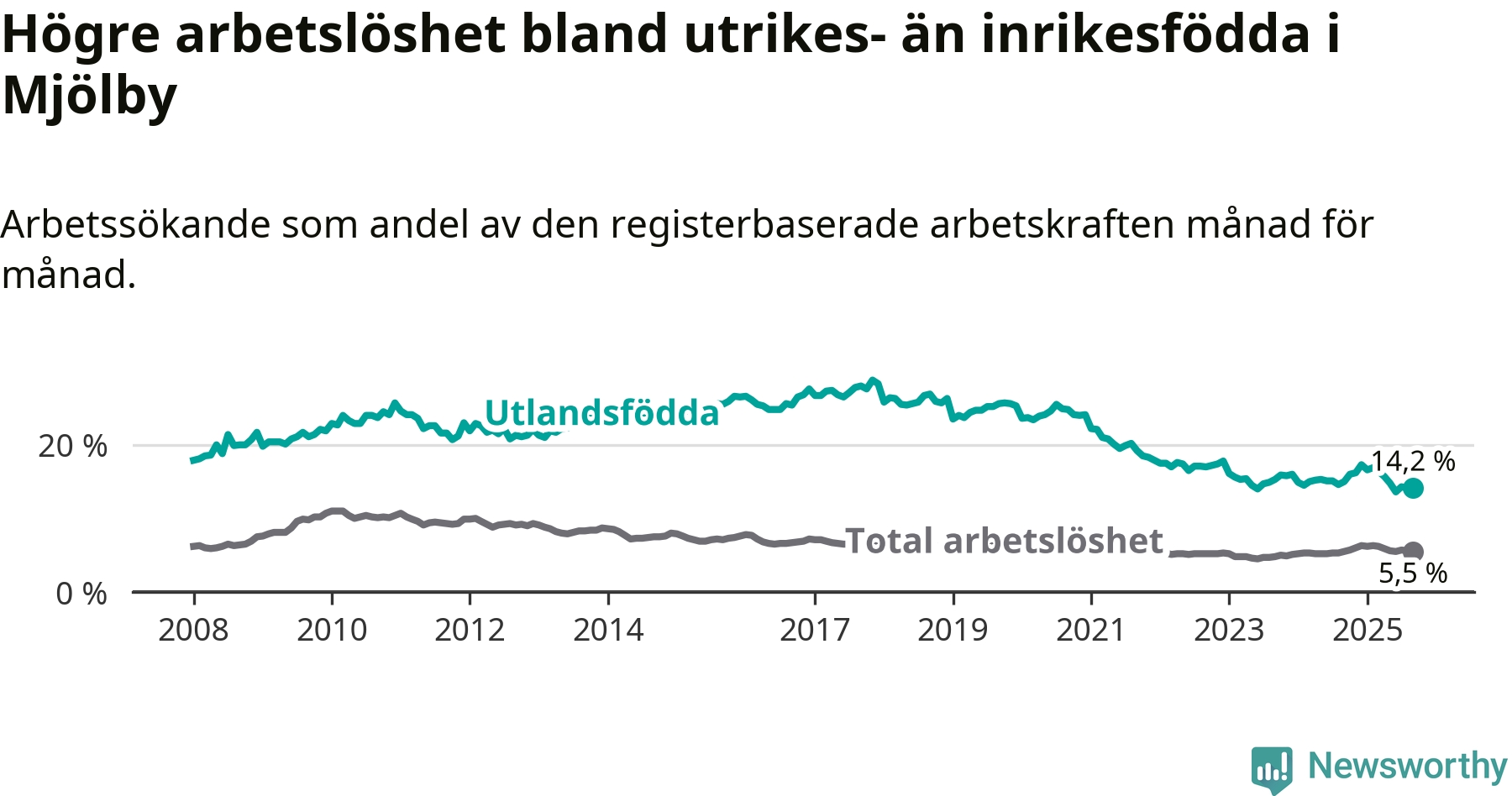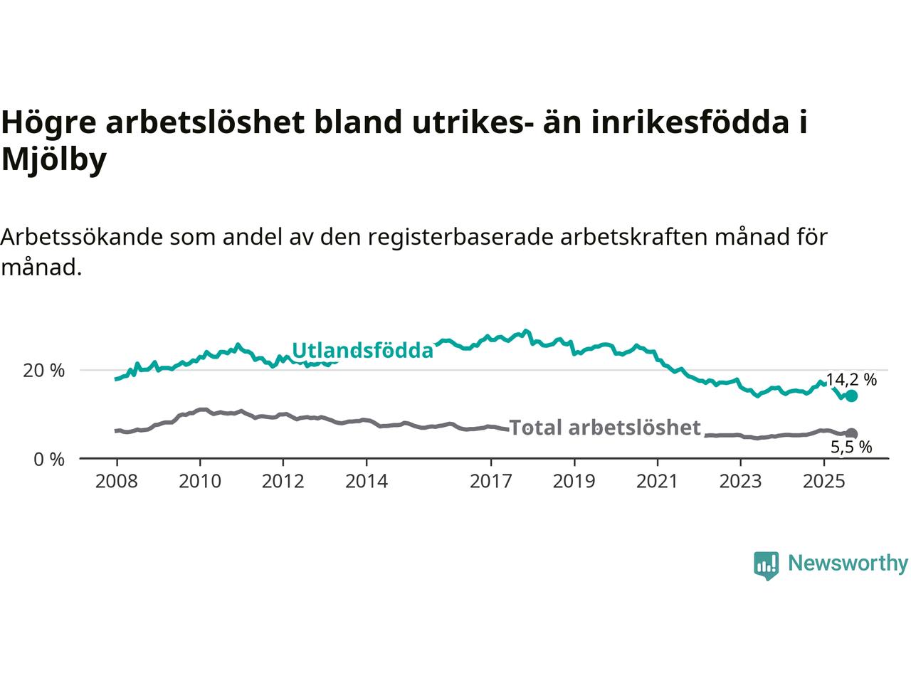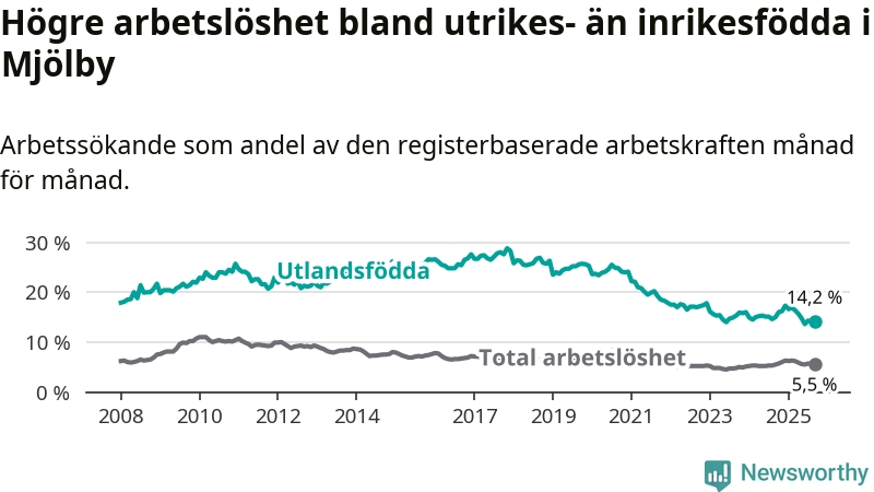 Skillnaden i arbetslöshet mellan utrikesfödda och hela befolkningen är 8,7 procentenheter i Mjölby. Det är en mindre skillnad än för ett år sedan (−0,8 procentenheter).