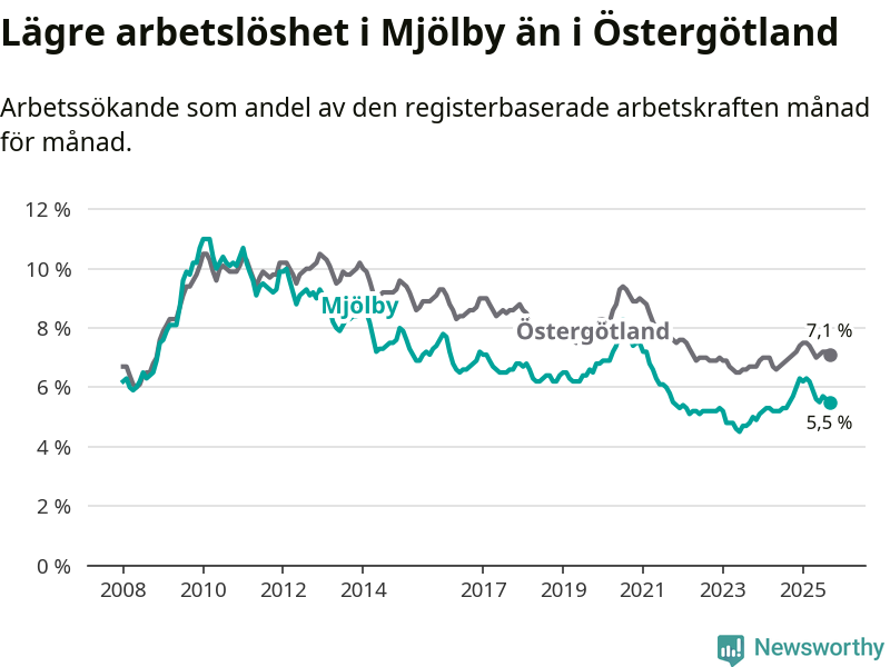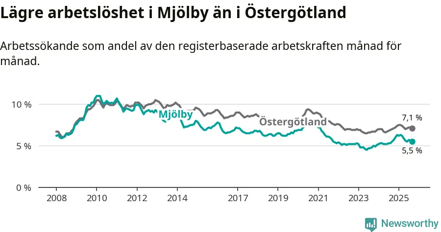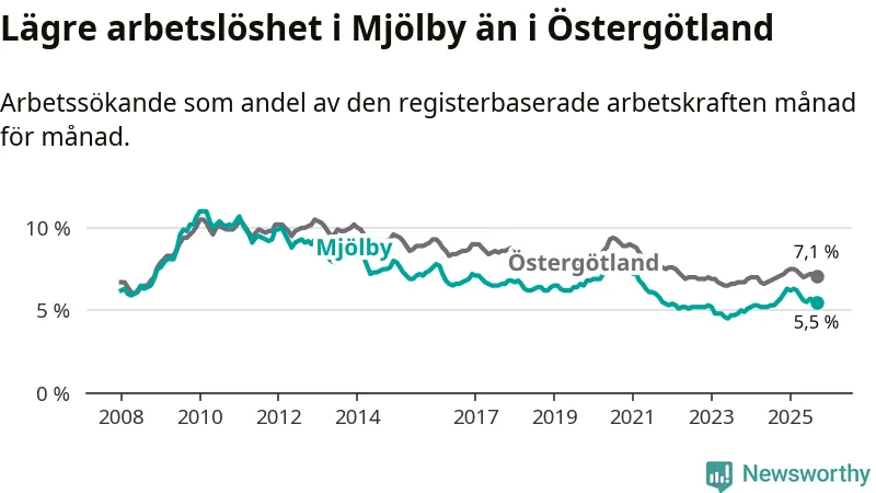 Arbetslösheten i Mjölby ligger under nivån i hela Östergötlands län (5,5 procent i kommunen, jämfört med 7,1 procent i hela länet). Ydre har den lägsta arbetslösheten i länet (3,3 procent), medan Norrköping har den högsta (9,3 procent). För att Mjölby skulle komma ner i samma arbetslöshetsnivå som Ydre skulle 316 personer behöva sysselsättas.