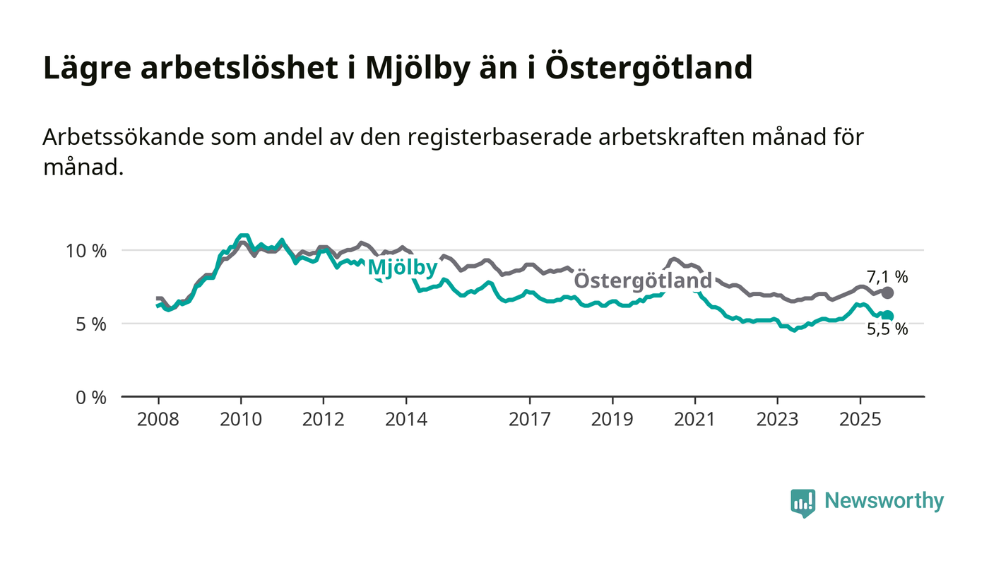 Under september månad rapporterade Mjölby kommun en total arbetslöshet på 5,5 procent. Det är i samma nivå som i september i fjol. I Östergötlands län däremot stiger arbetslösheten något