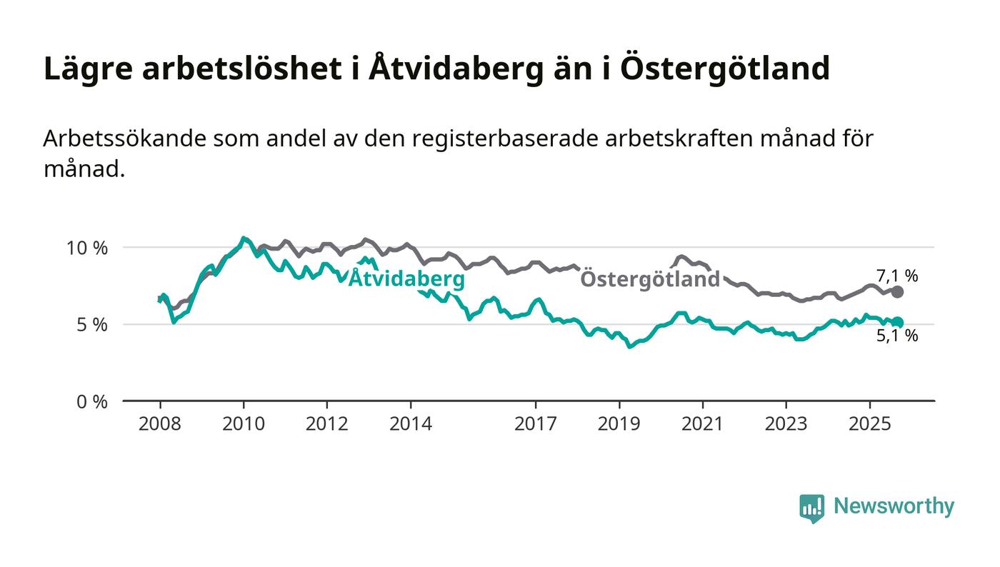 Under september månad rapporterade Åtvidabergs kommun en total arbetslöshet på 5,1 procent. Det är en minskning jämfört med samma tidpunkt i fjol (−0,2 procentenheter). I Östergötlands län däremot stiger arbetslösheten något.