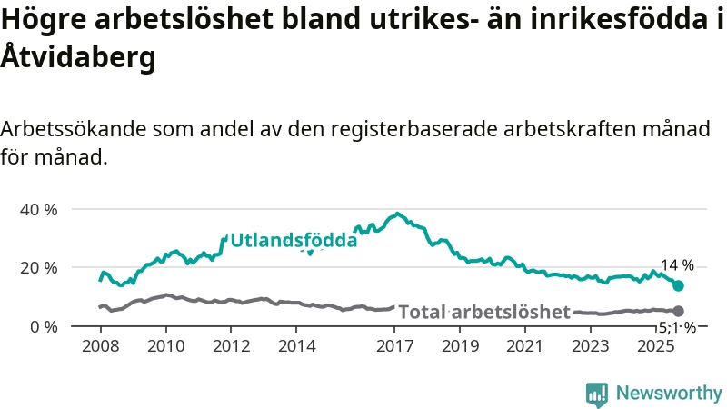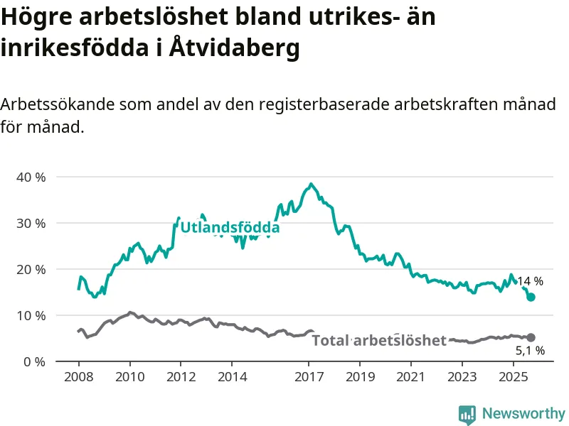Skillnaden i arbetslöshet mellan utrikesfödda och hela befolkningen är 8,9 procentenheter i Åtvidaberg. Det är en betydligt mindre skillnad än för ett år sedan (−3,3 procentenheter).