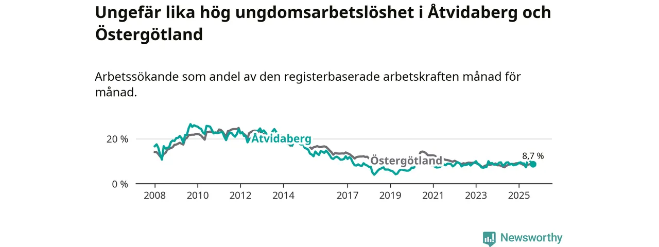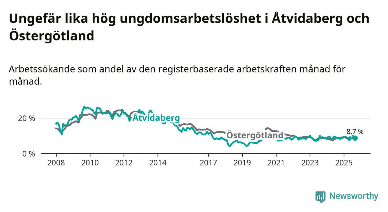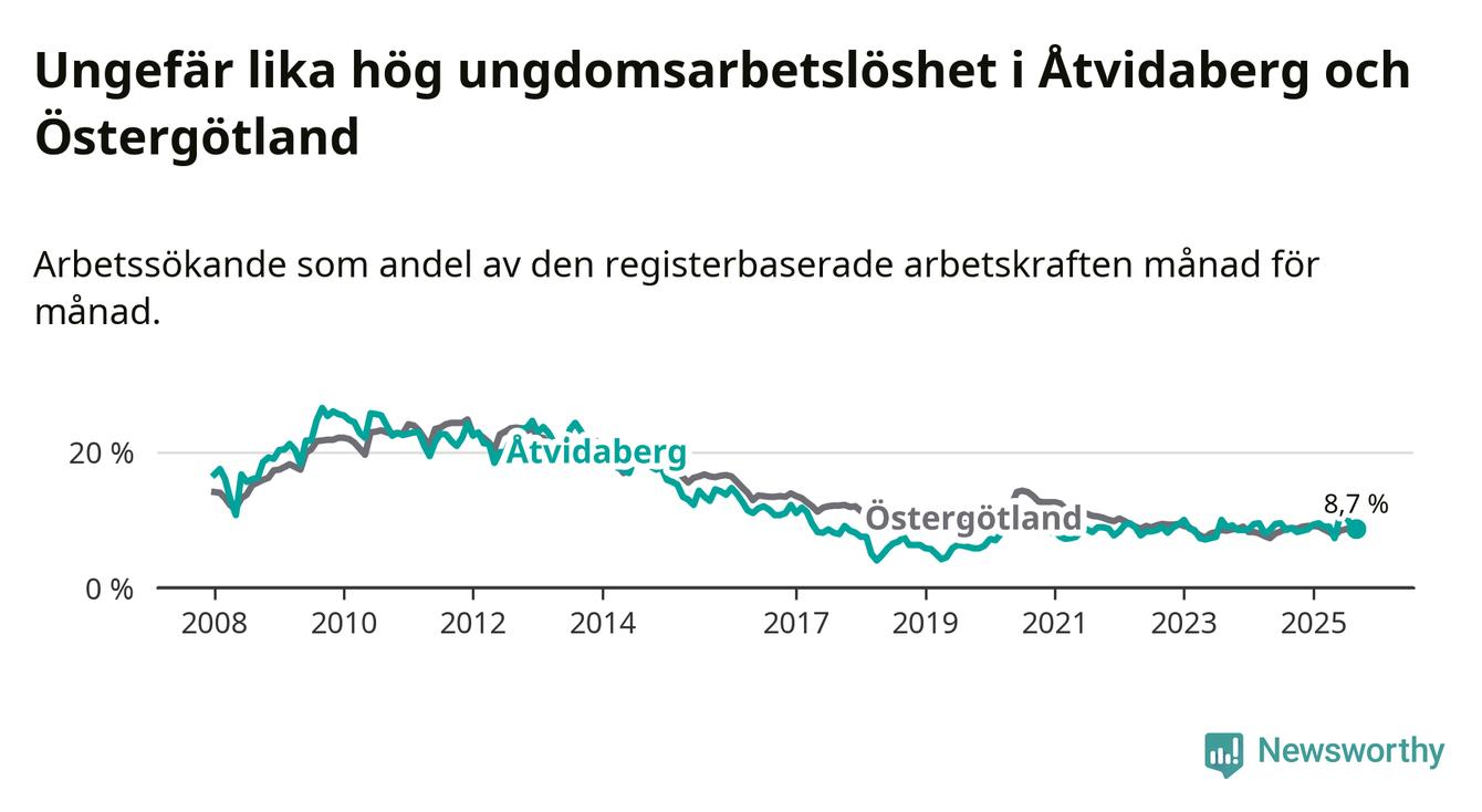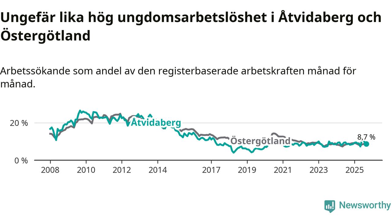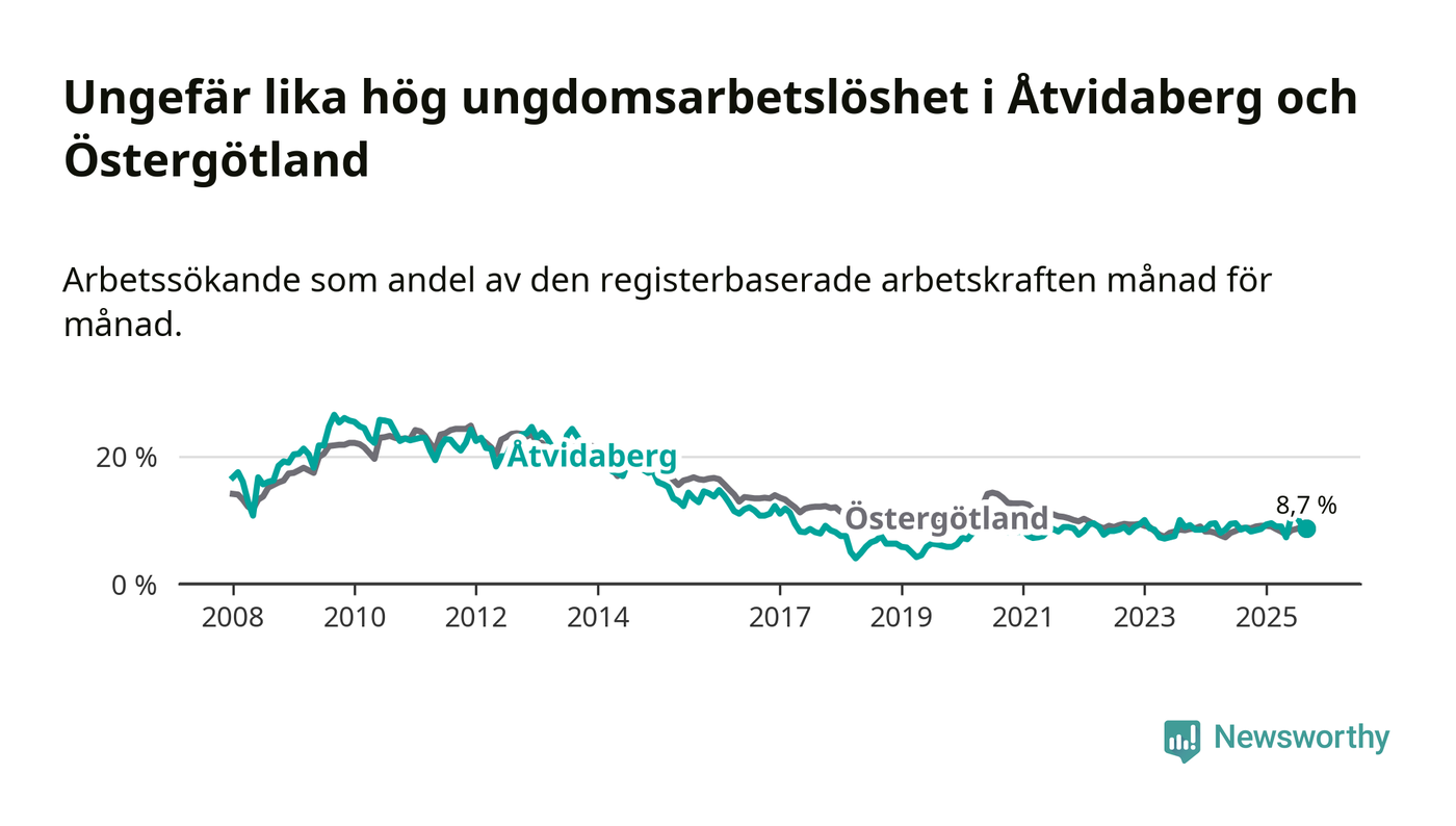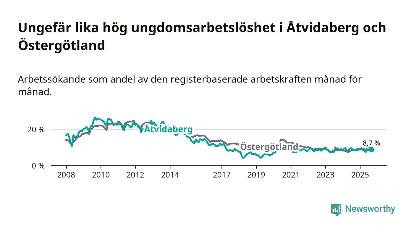 Medan Åtvidaberg har lägre total arbetslöshet än Östergötland, ligger ungdomsarbetslösheten på i stort sett samma nivå.