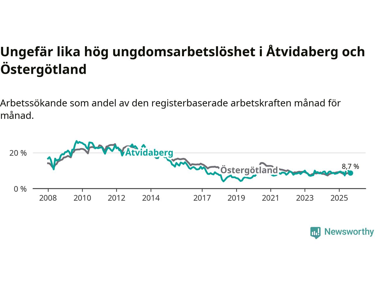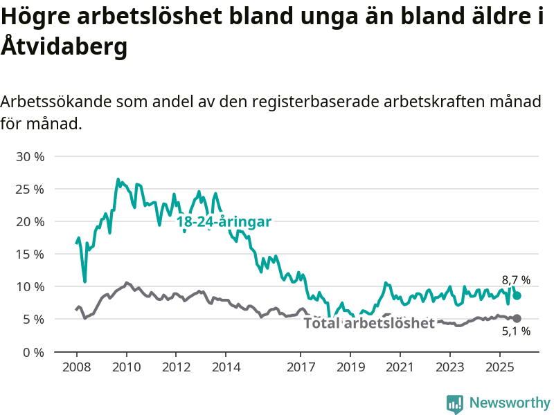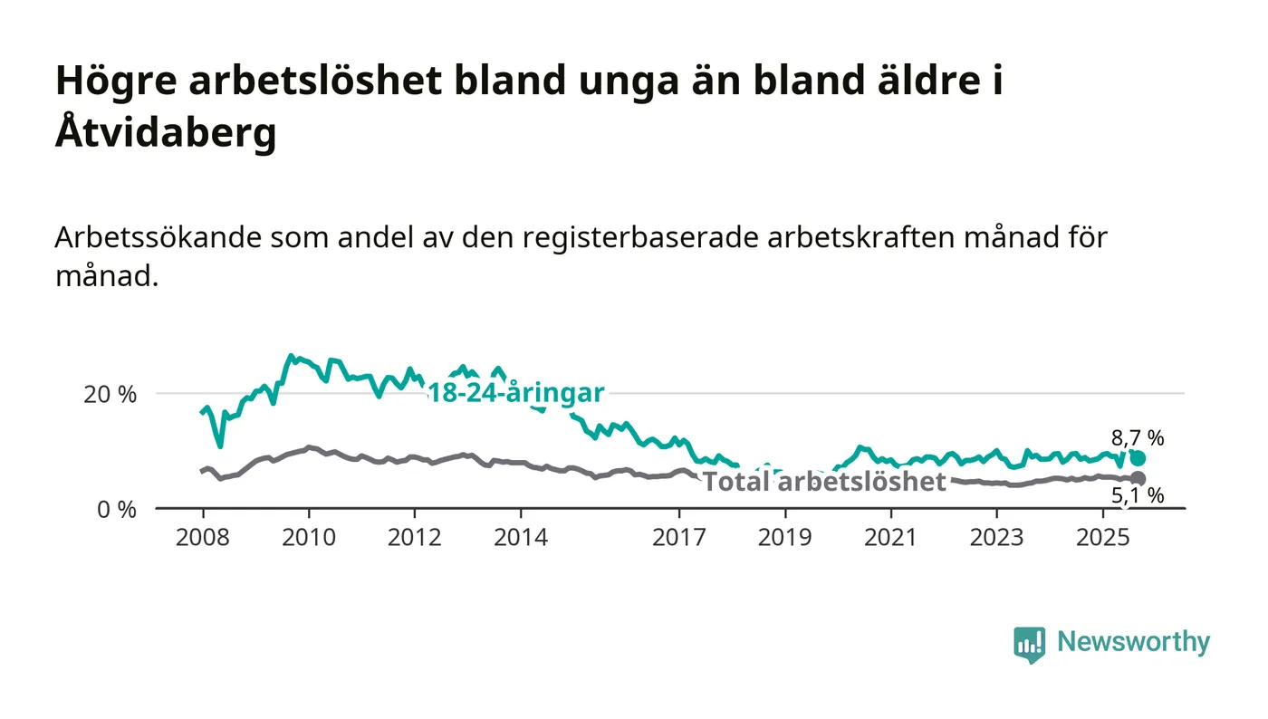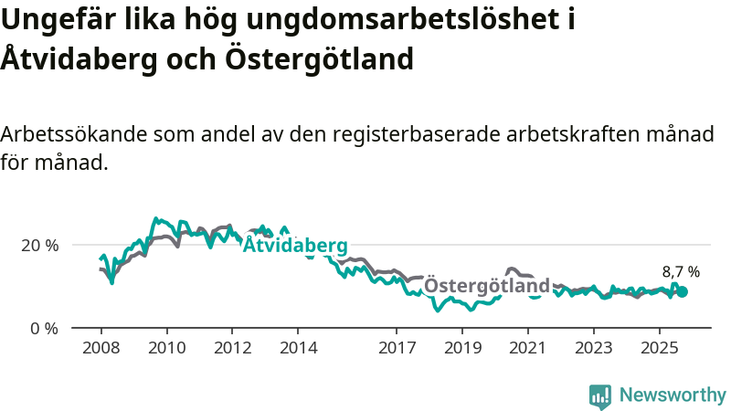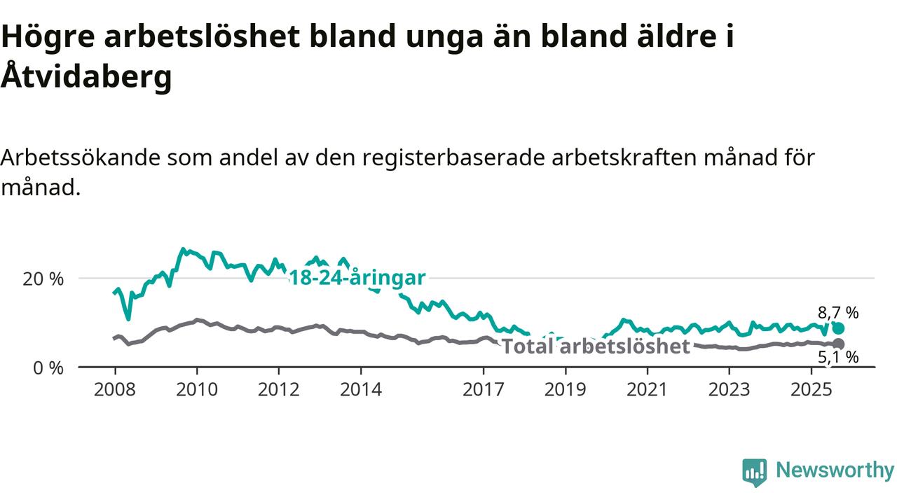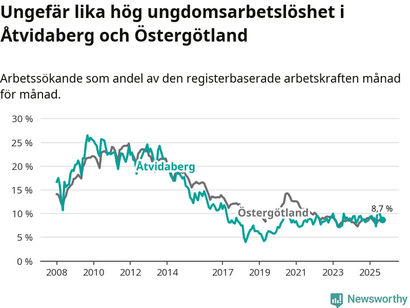 Medan Åtvidaberg har lägre total arbetslöshet än Östergötland, ligger ungdomsarbetslösheten på i stort sett samma nivå.