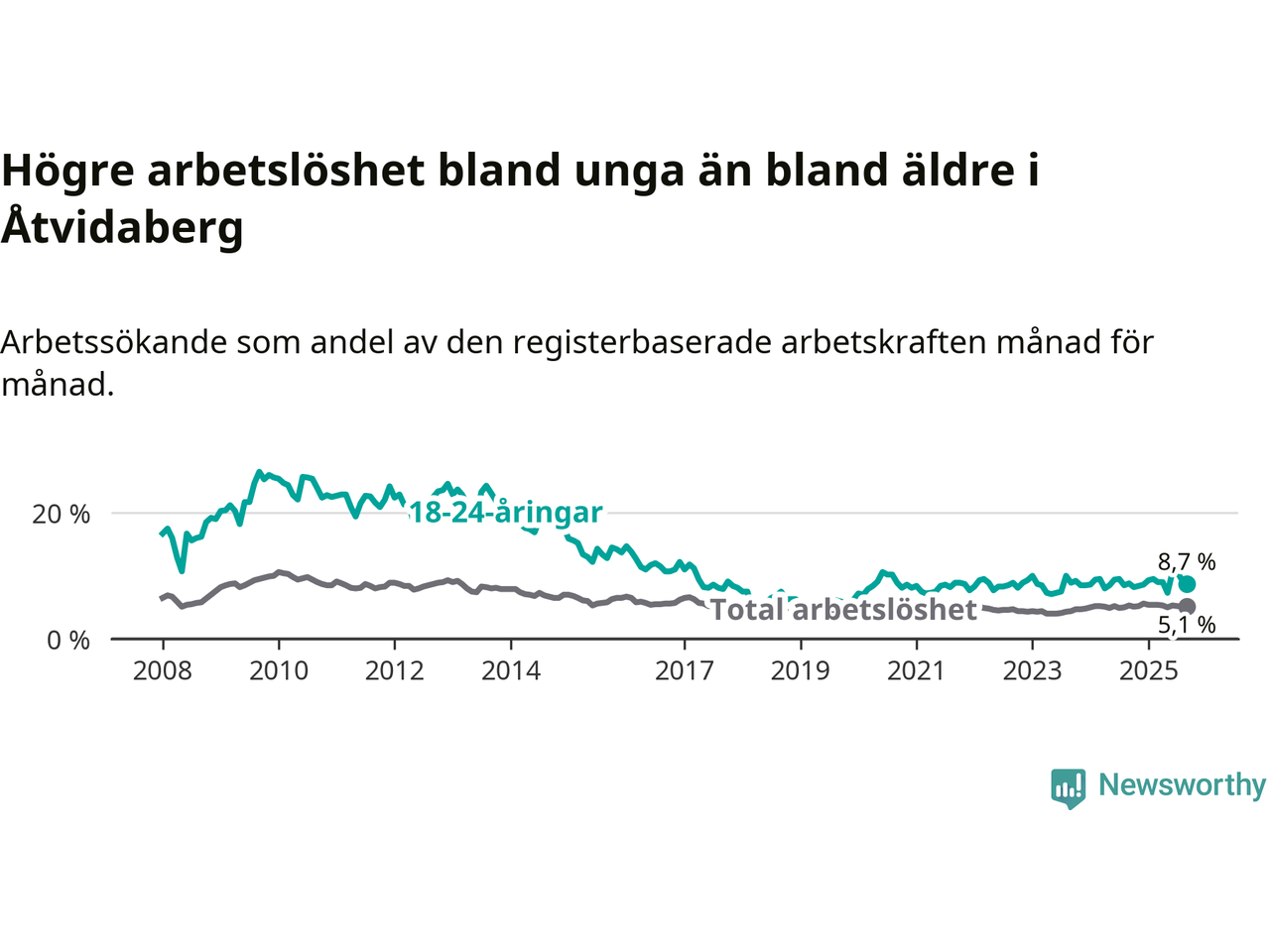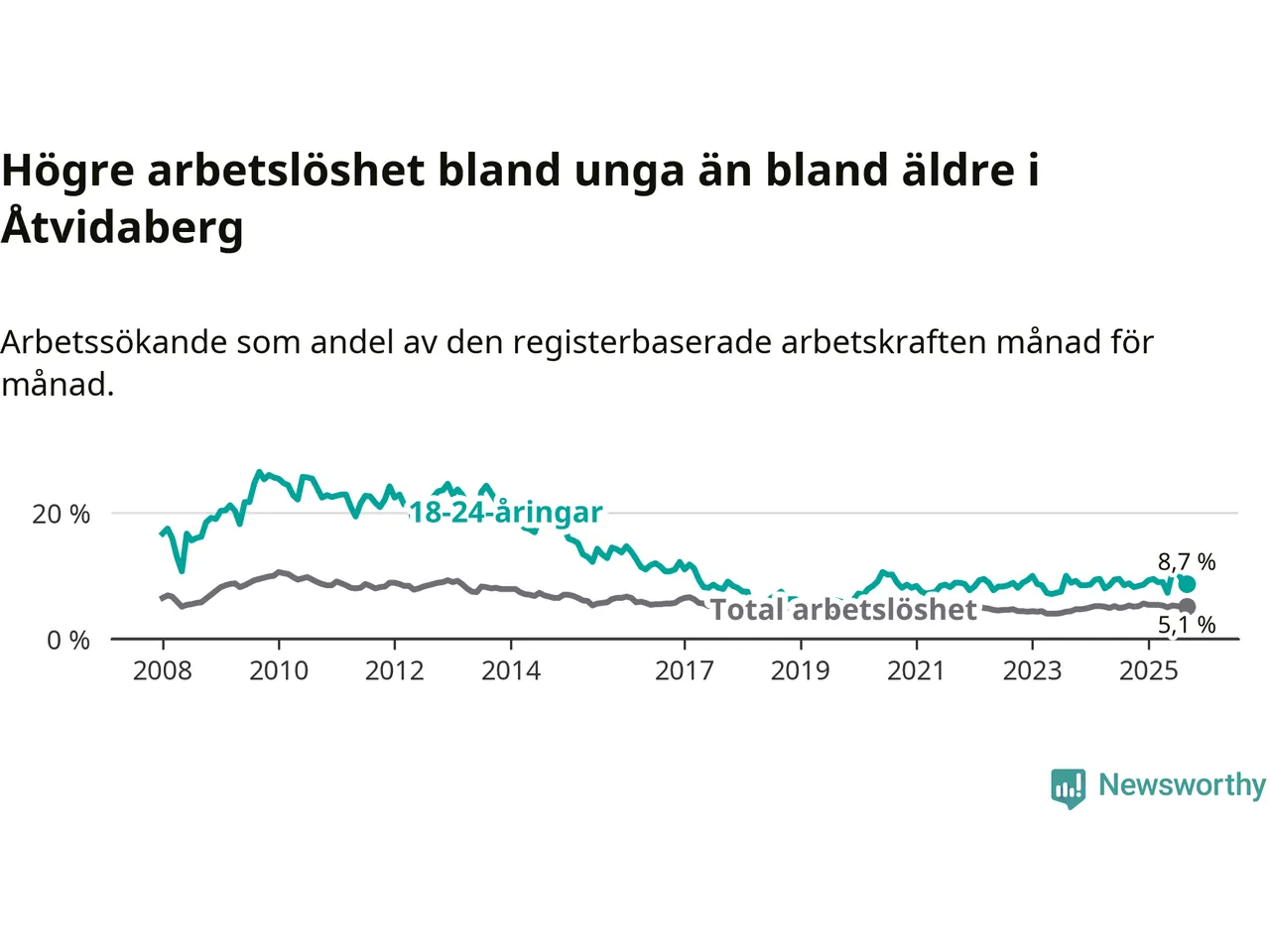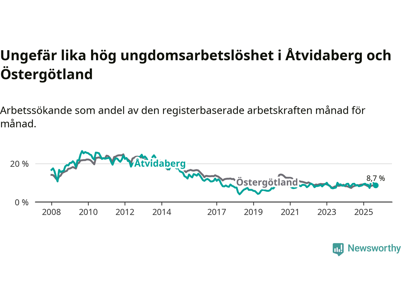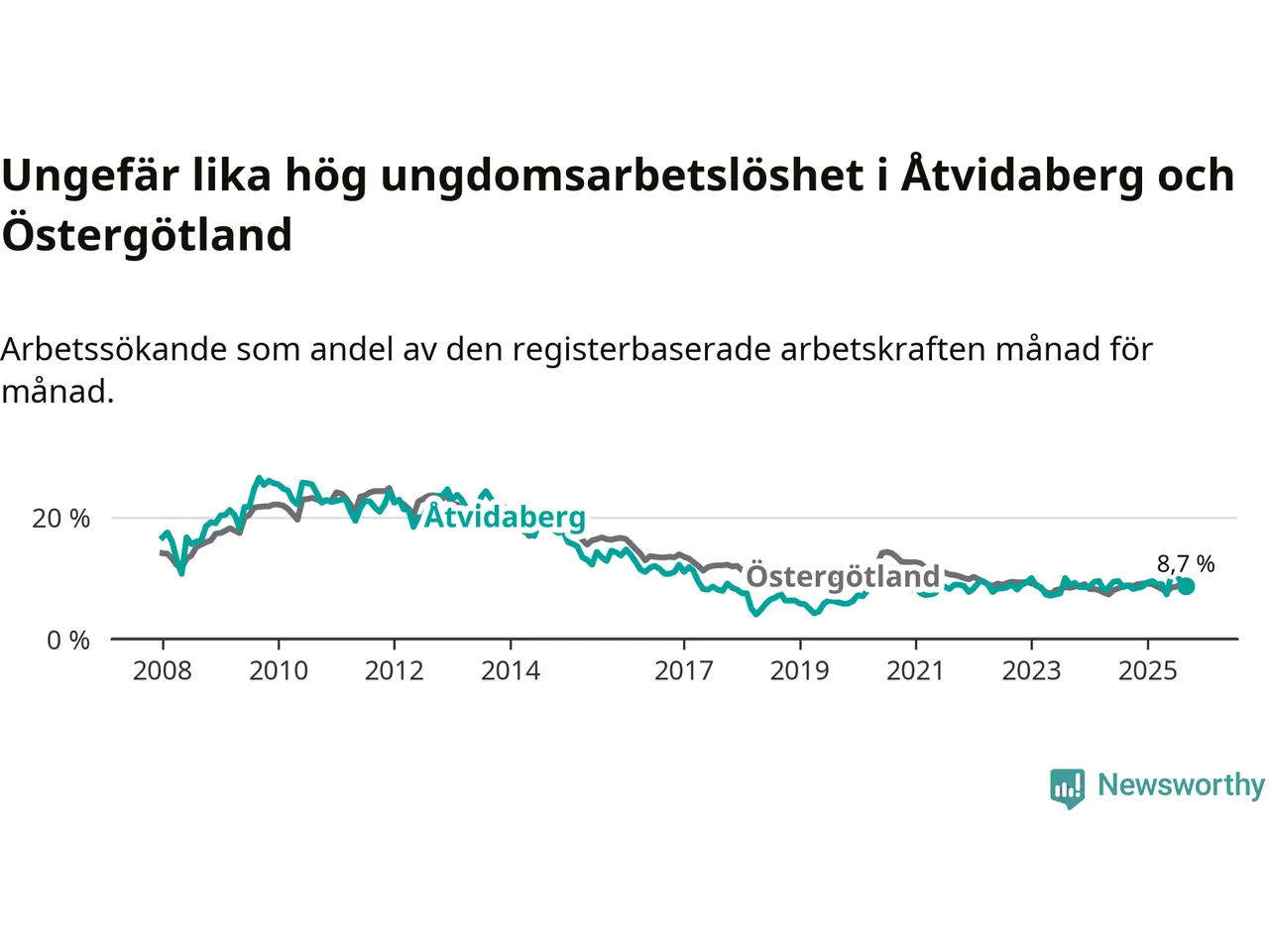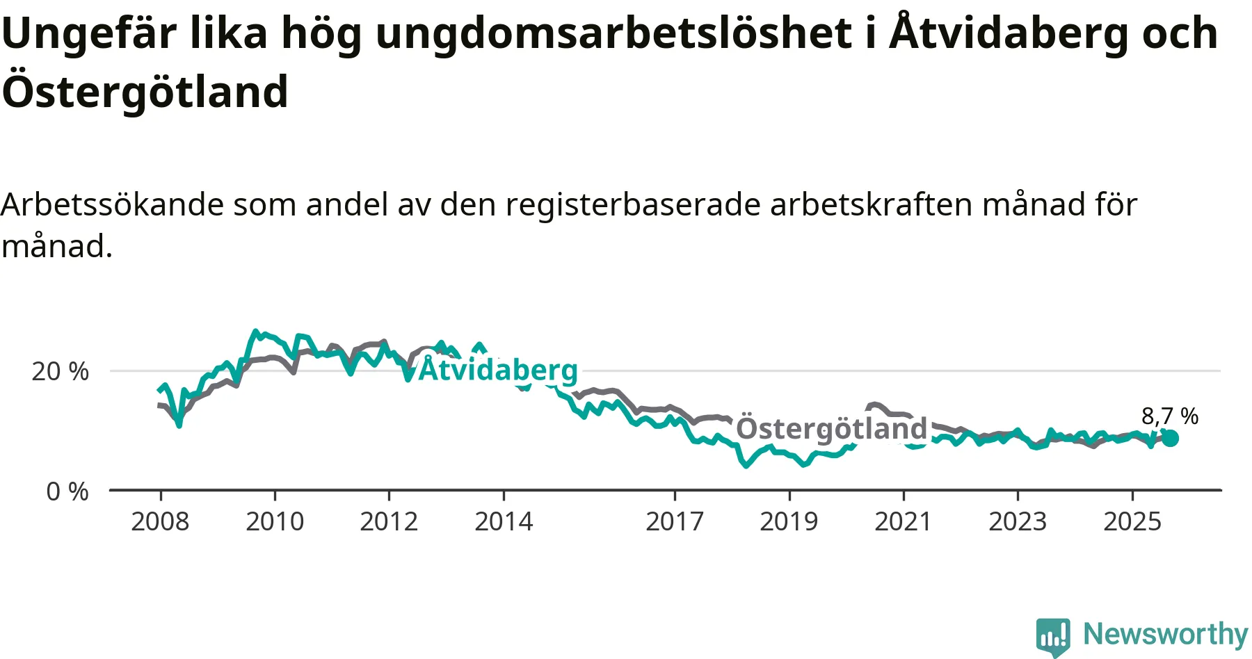 Medan Åtvidaberg har lägre total arbetslöshet än Östergötland, ligger ungdomsarbetslösheten på i stort sett samma nivå.