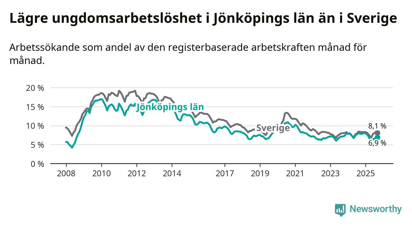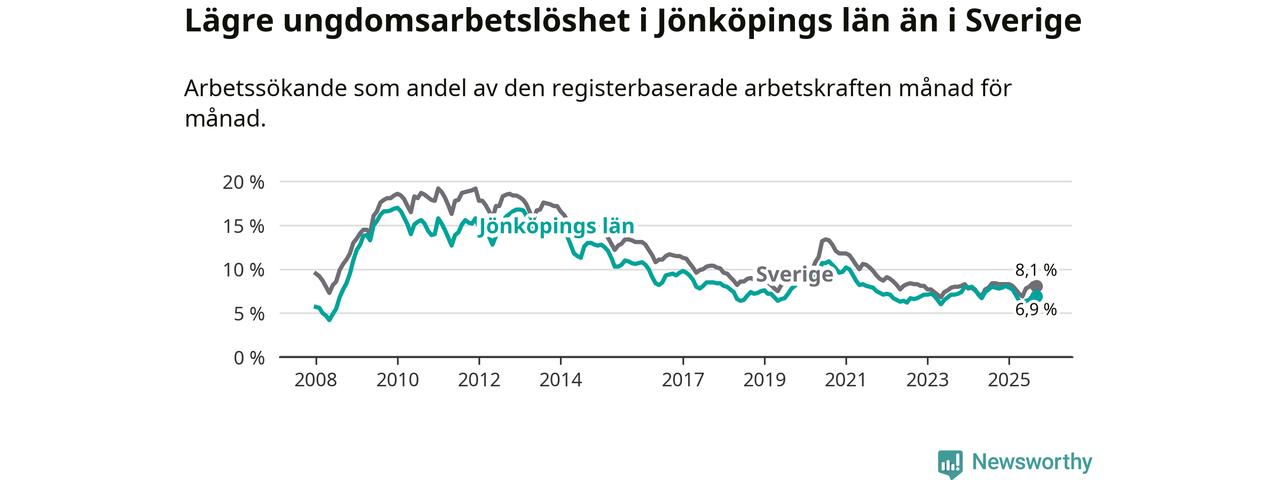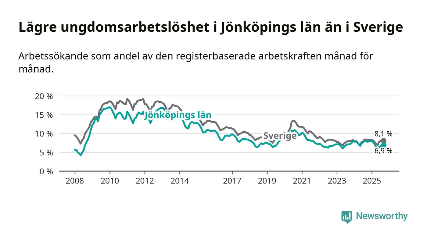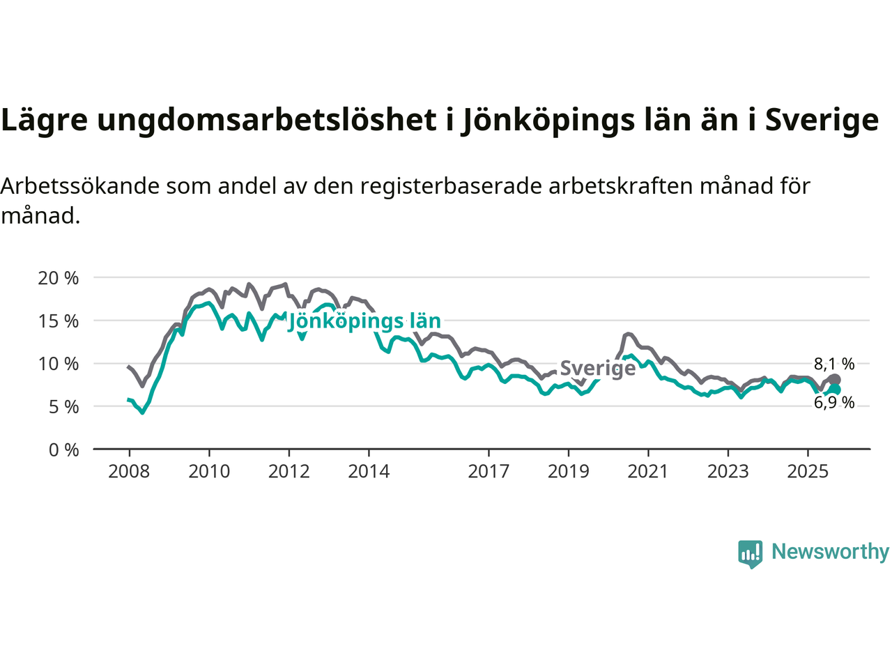 Precis som den totala arbetslösheten ligger ungdomsarbetslösheten i Jönköping lägre än i Sverige som helhet. Skillnaden mellan länet och riket är 1,2 procentenheter.