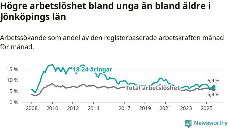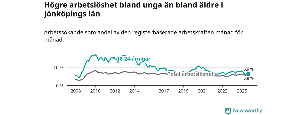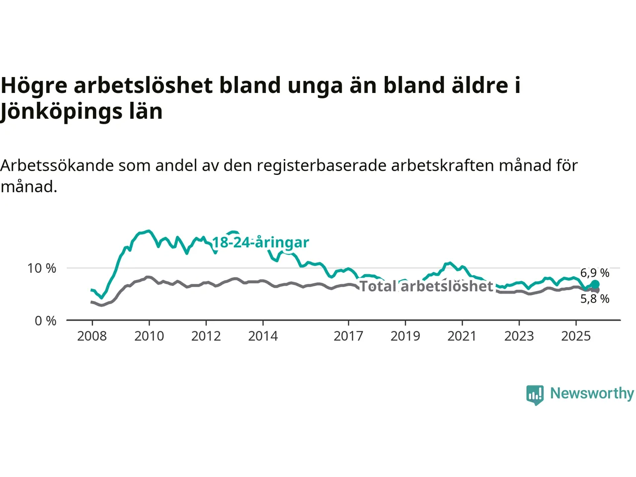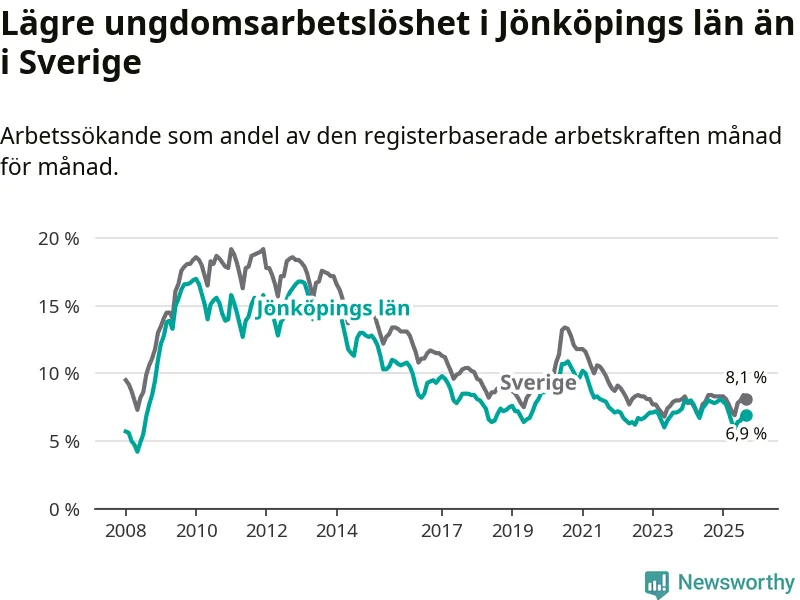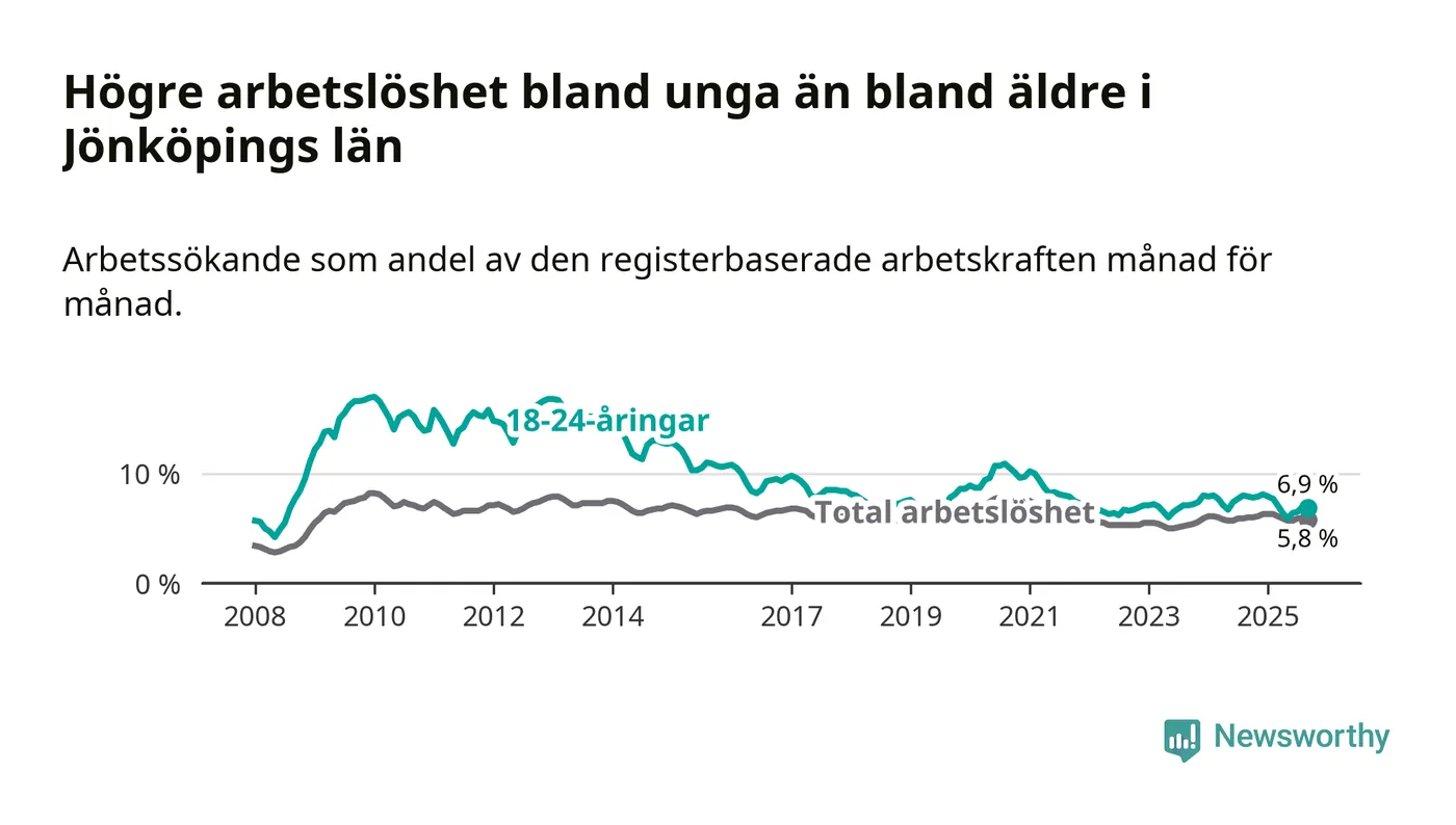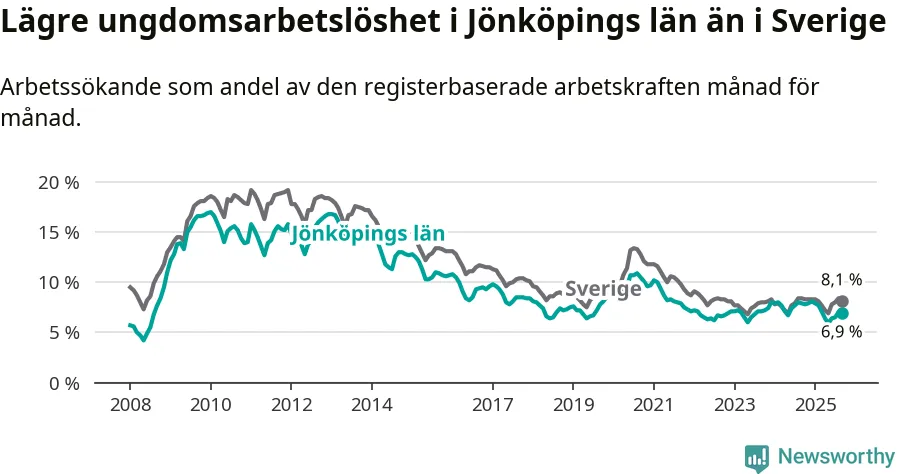 Precis som den totala arbetslösheten ligger ungdomsarbetslösheten i Jönköping lägre än i Sverige som helhet. Skillnaden mellan länet och riket är 1,2 procentenheter.