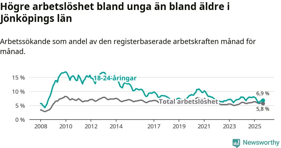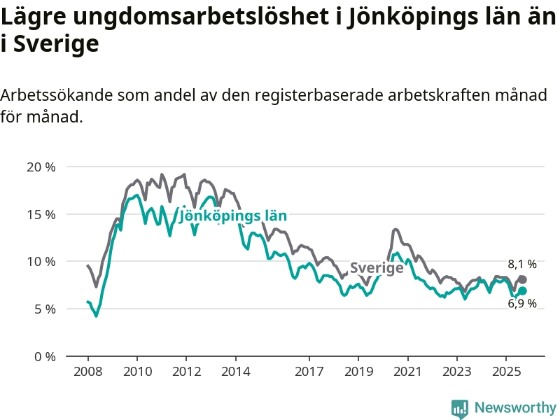 I och med den senaste månadens nedgång har de ungas arbetslöshet i Jönköping sjunkit åtta månader i följd (ner från 7,9 procent i januari till 6,9 procent nu).