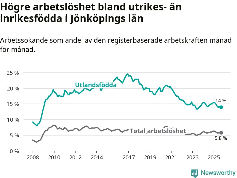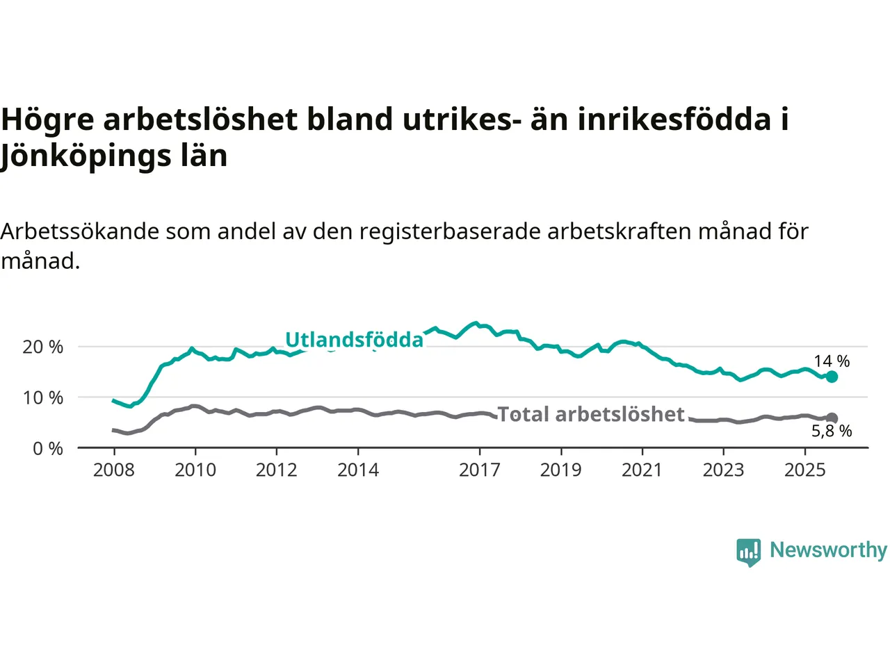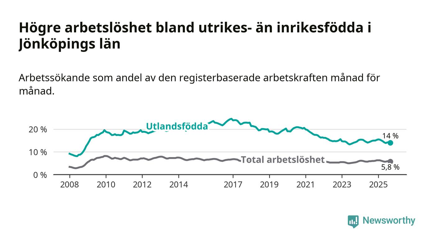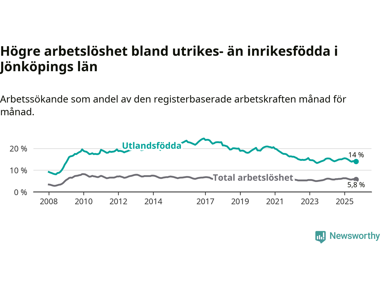 Arbetslösheten bland utlandsfödda var 14,0 procent i Jönköping under september månad, motsvarande 6 133 av 43 807 personer. Det är 0,9 procentenheter färre än vid samma tidpunkt i fjol (−368 om man räknar personer). Därmed är de utlandsföddas arbetslöshet lägre än vid samma tidpunkt i fjol för sjunde månaden i följd. Sedan februari har arbetslösheten bland utlandsfödda minskat från 15,4 till 14,0 procent.
