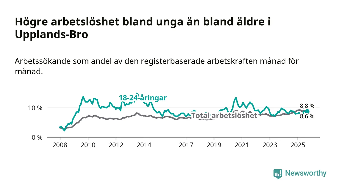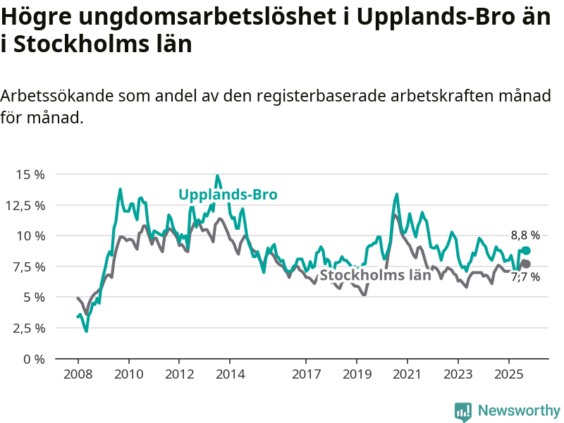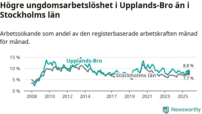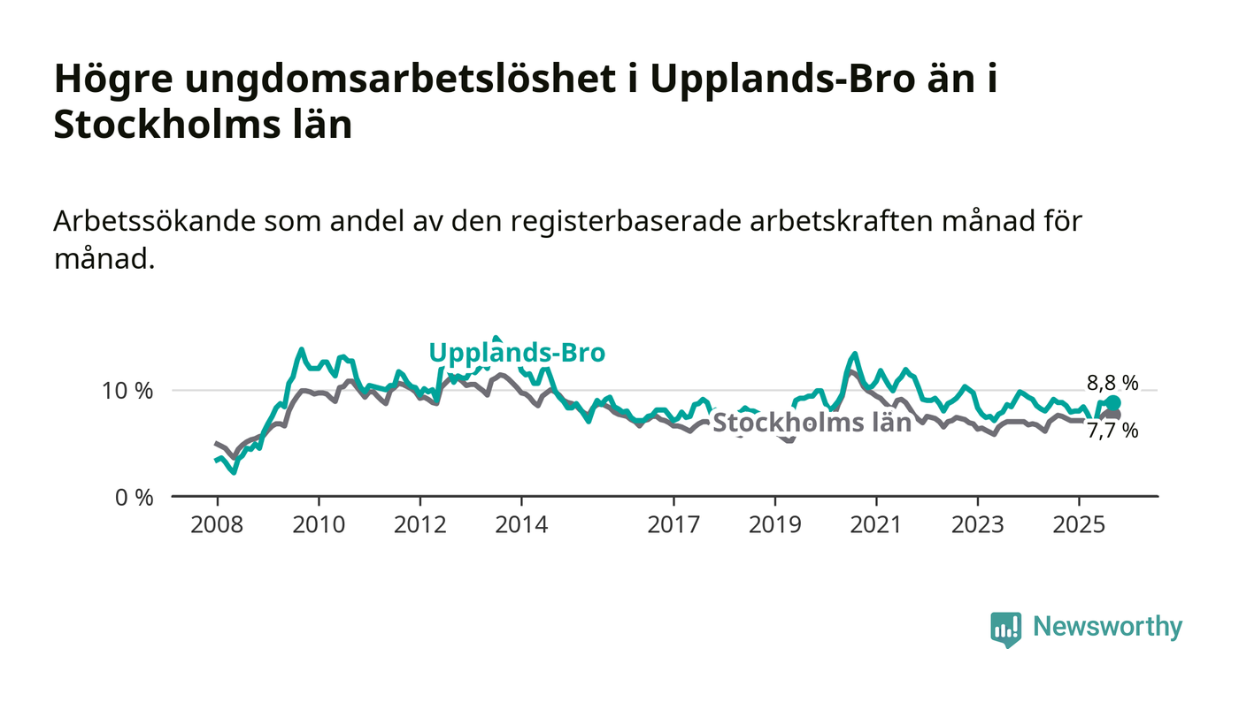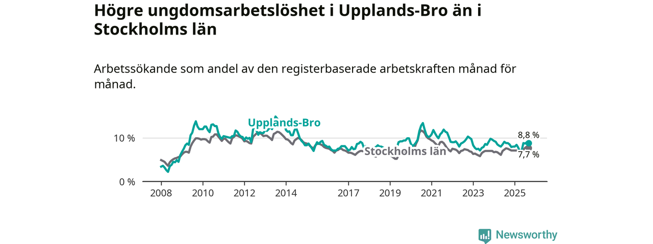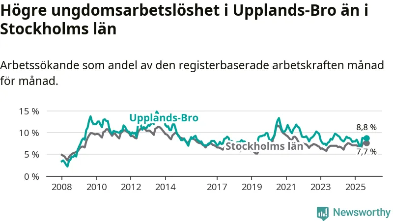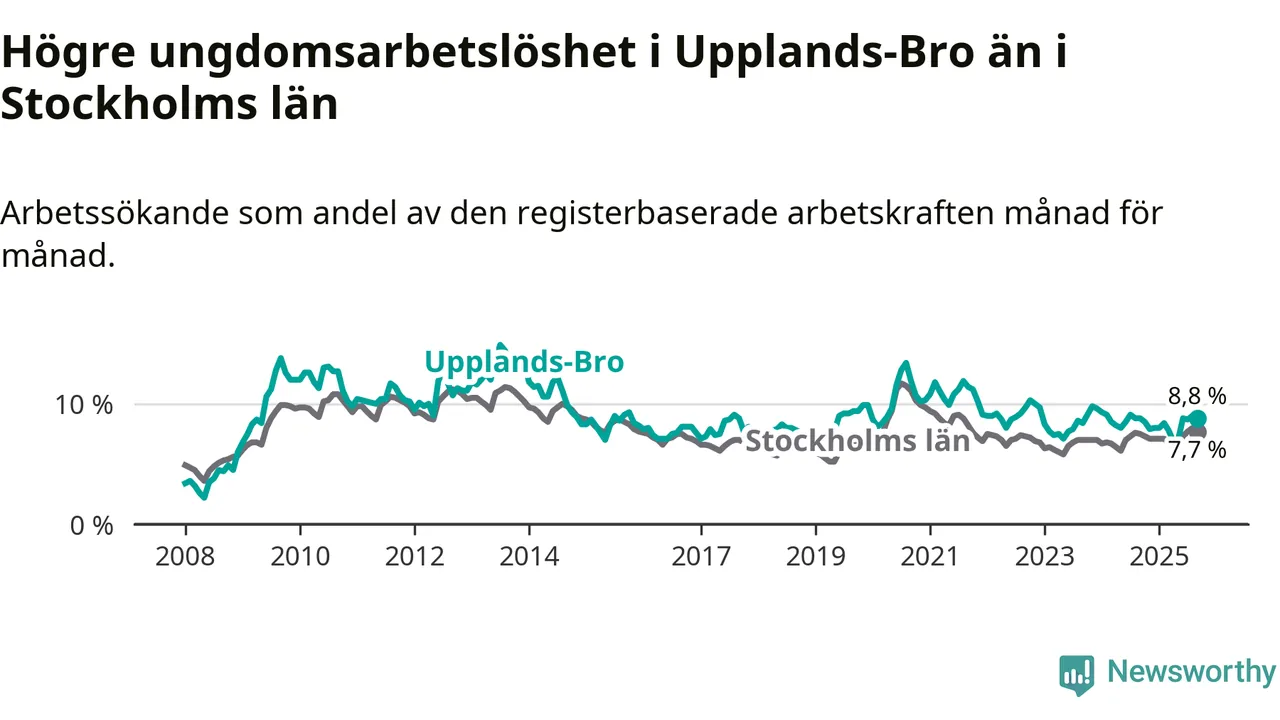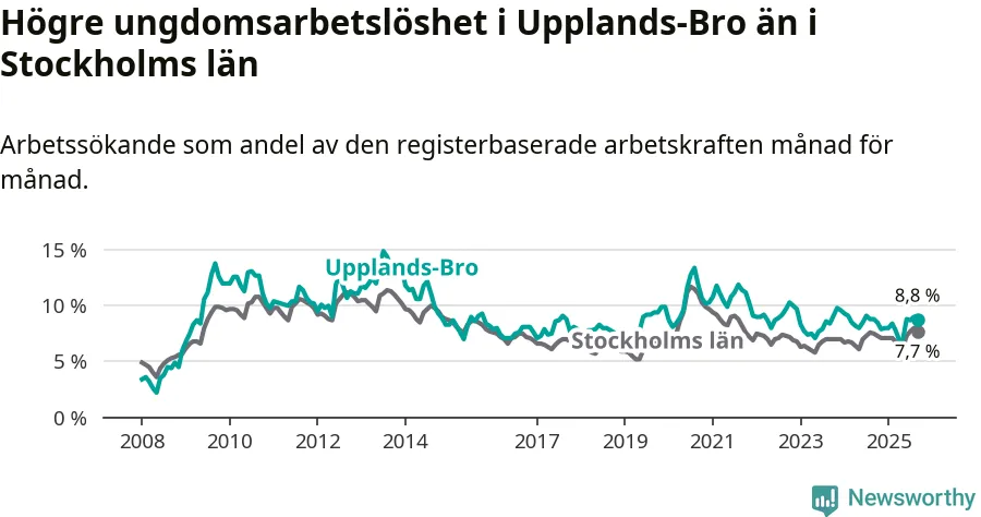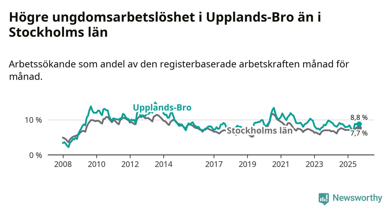 Precis som den totala arbetslösheten ligger ungdomsarbetslösheten i Upplands-Bro högre än i Stockholms län som helhet. Skillnaden mellan kommunen och länet är 1,1 procentenheter.