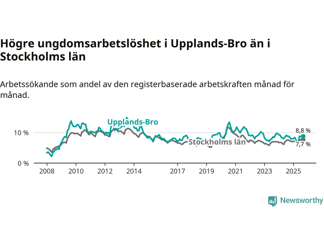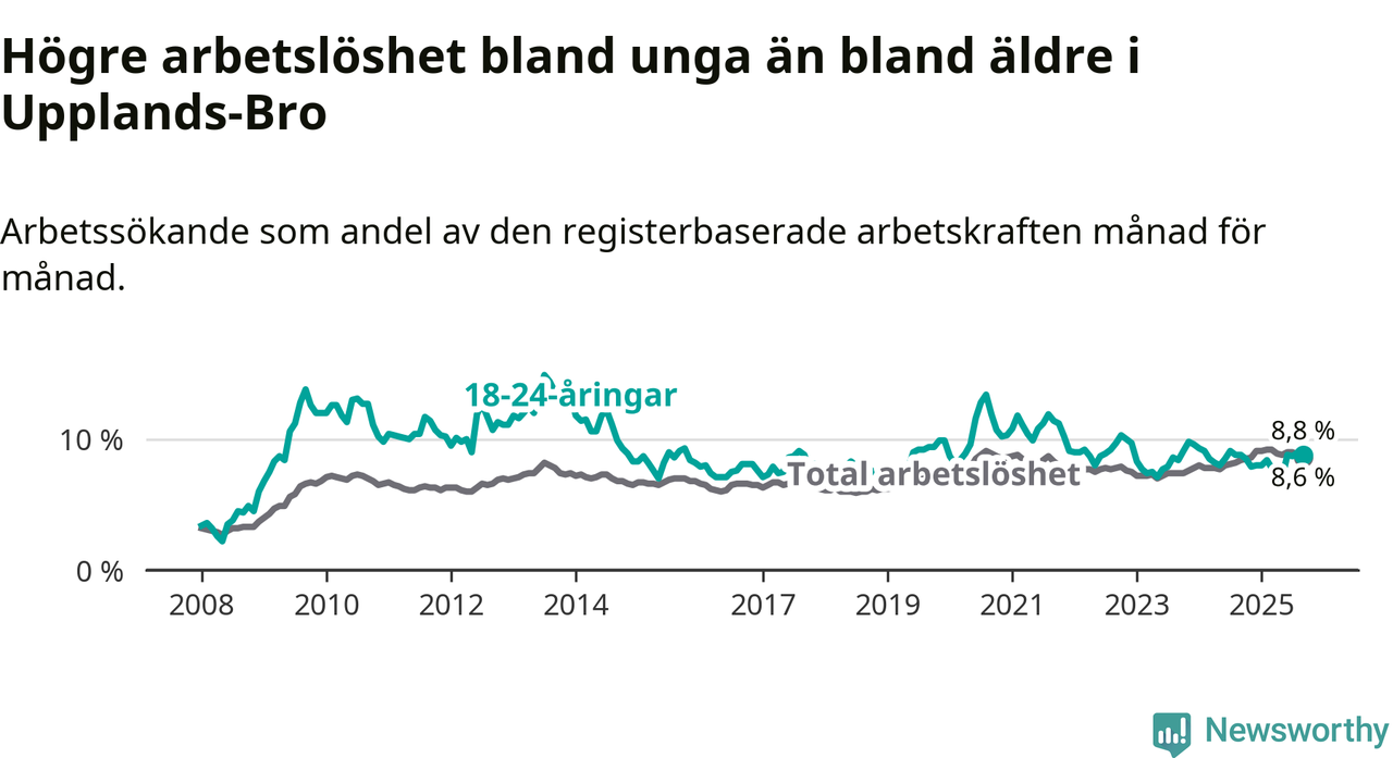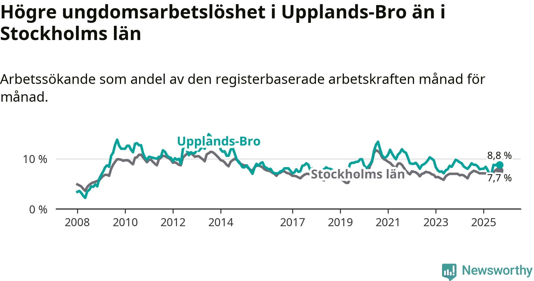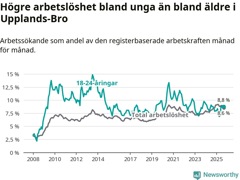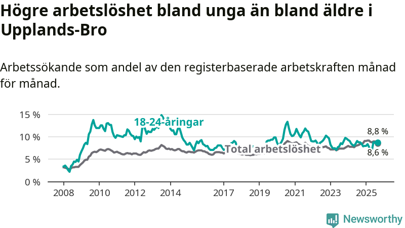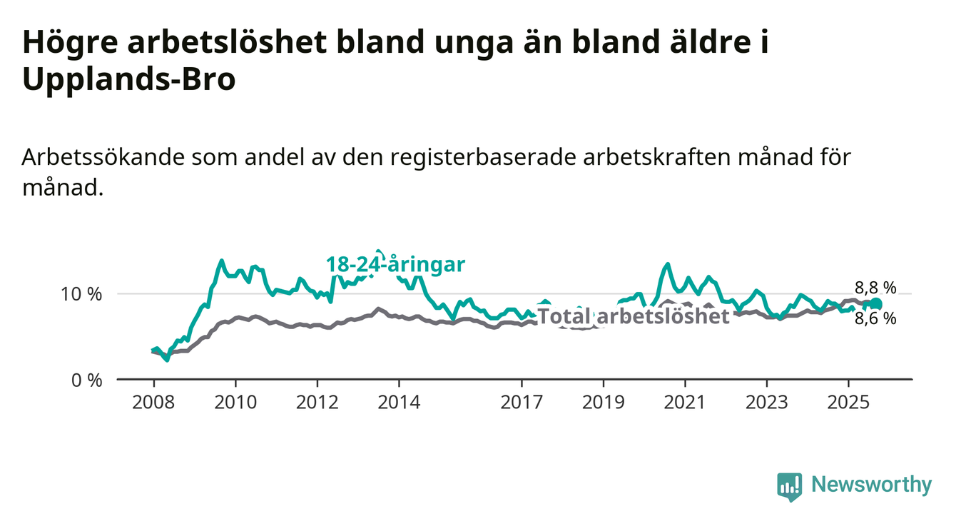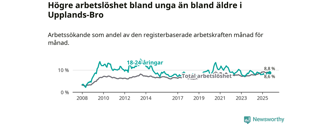 Precis som den totala arbetslösheten ligger ungdomsarbetslösheten i Upplands-Bro högre än i Stockholms län som helhet. Skillnaden mellan kommunen och länet är 1,1 procentenheter.