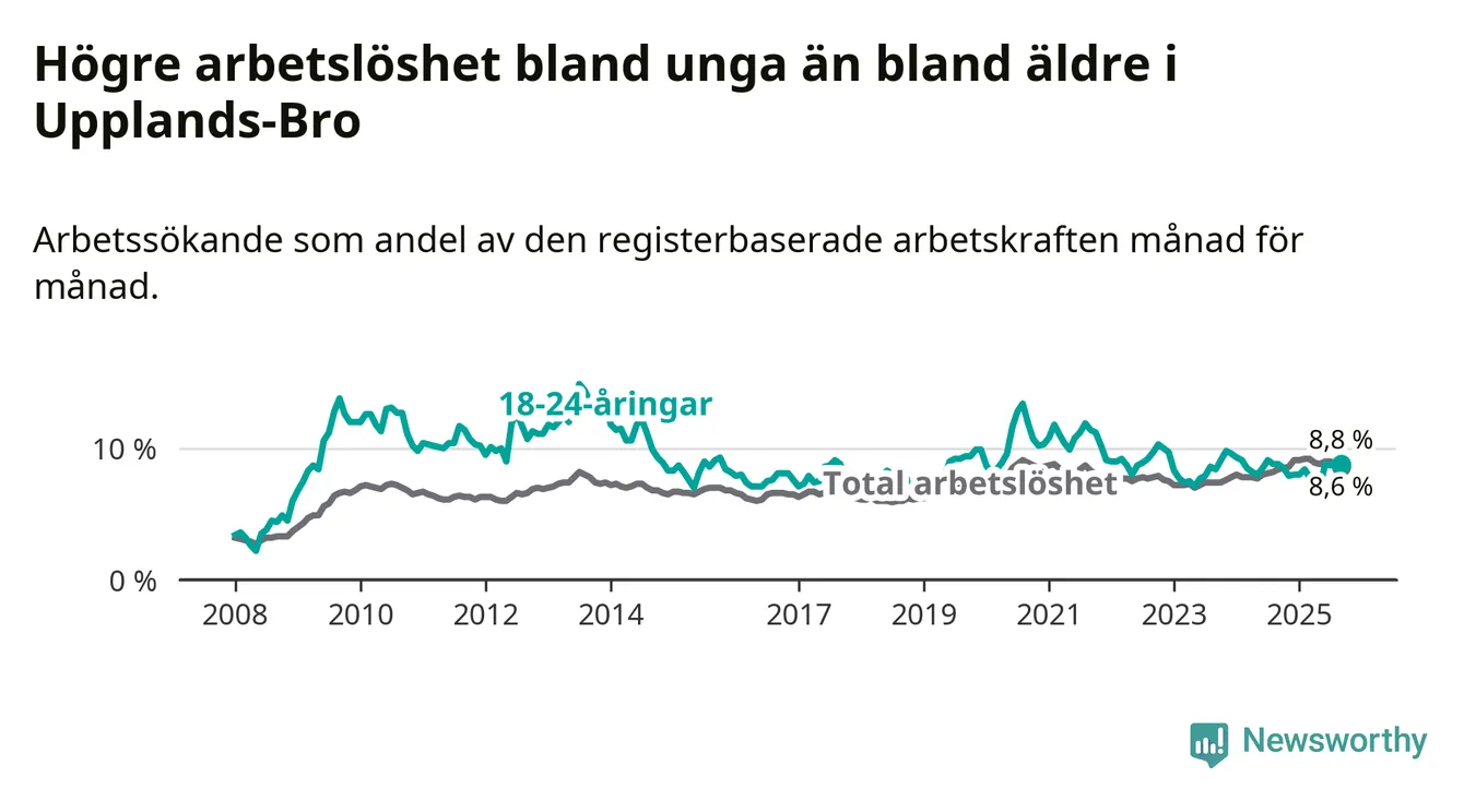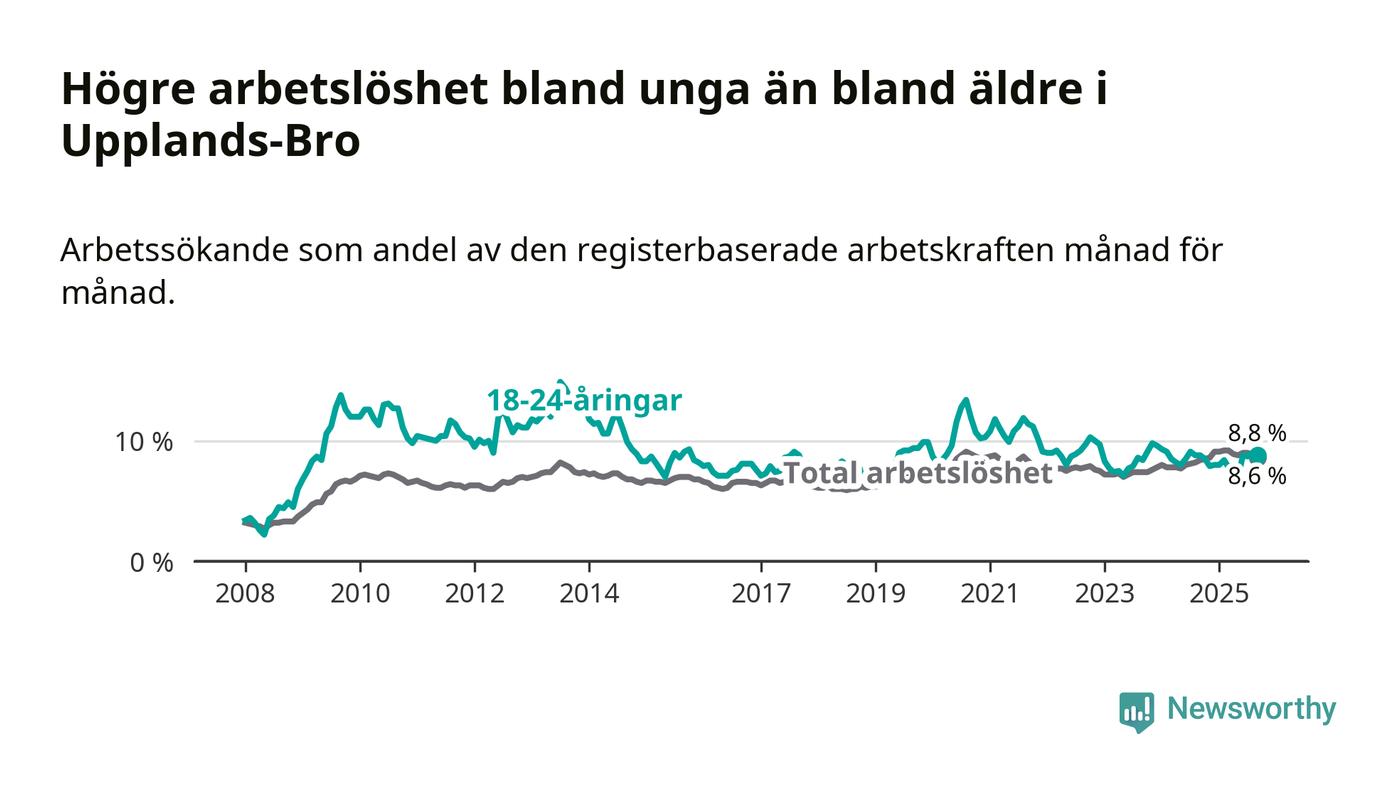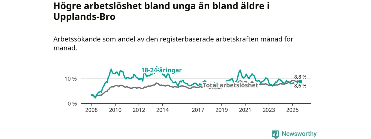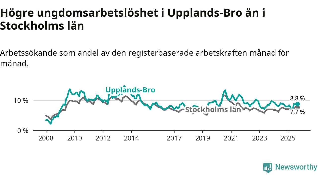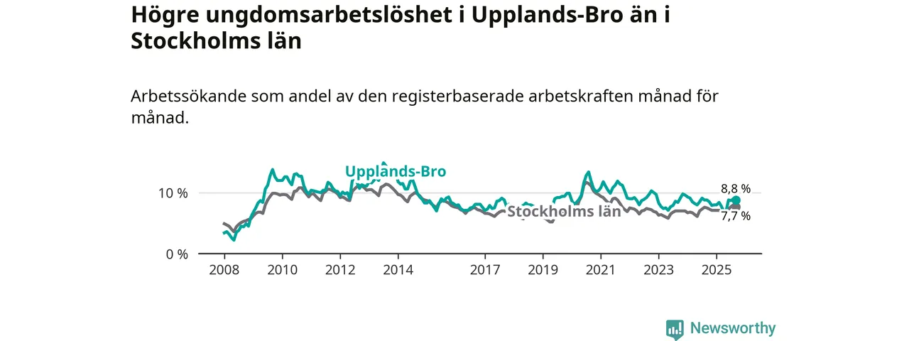Graf: Arbetslöshet bland unga i Upplands-Bro kommun och Stockholms län