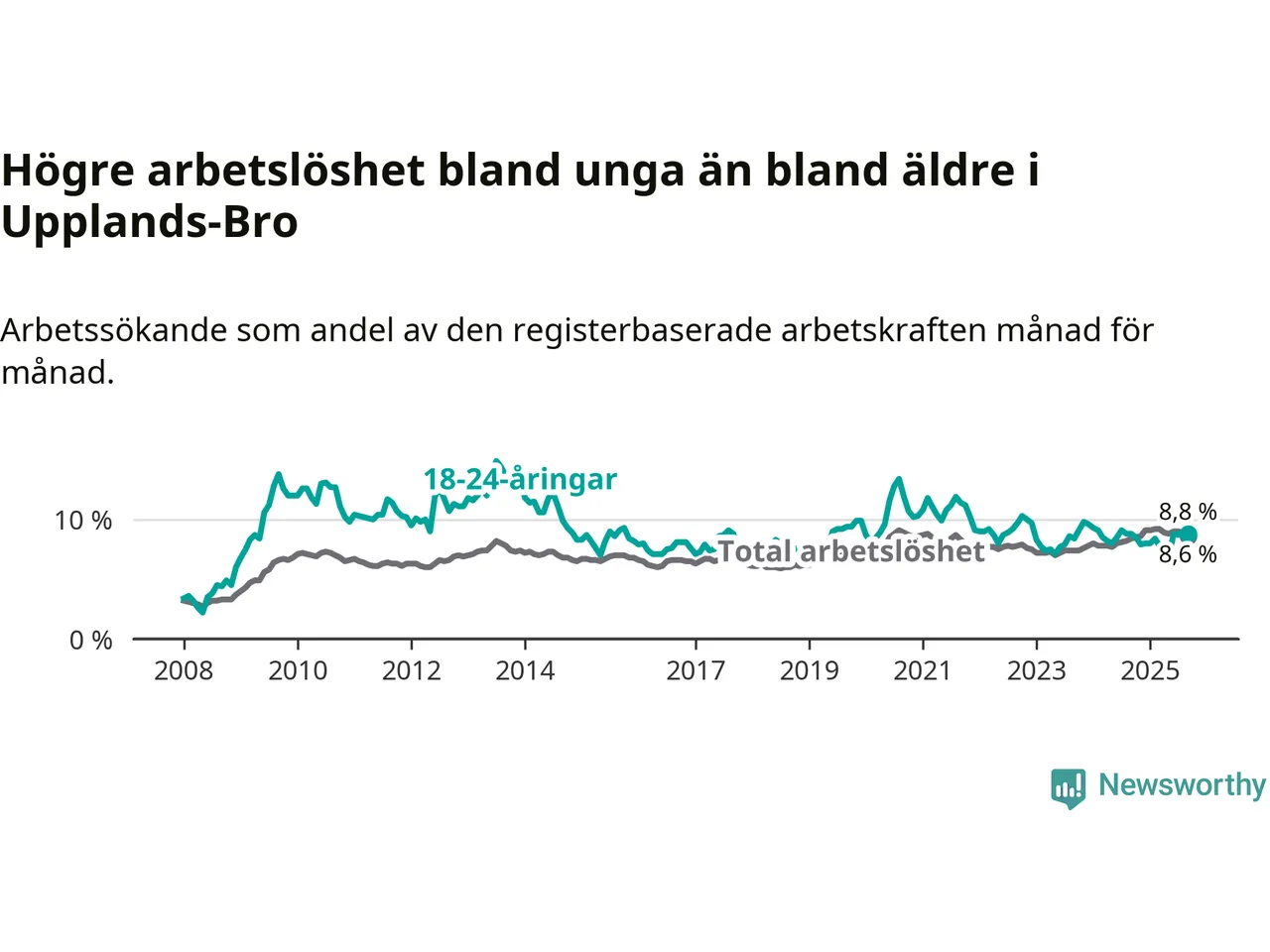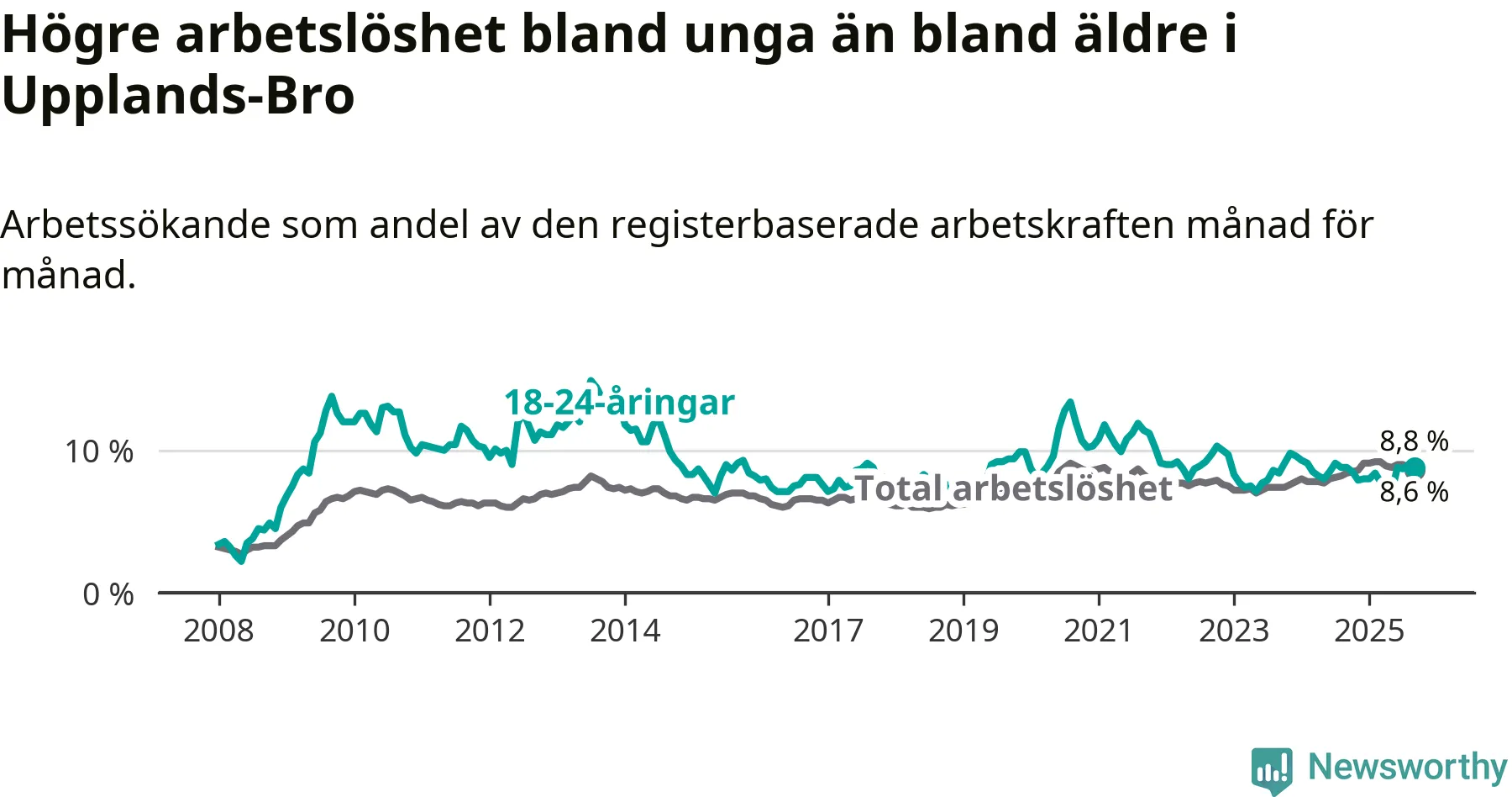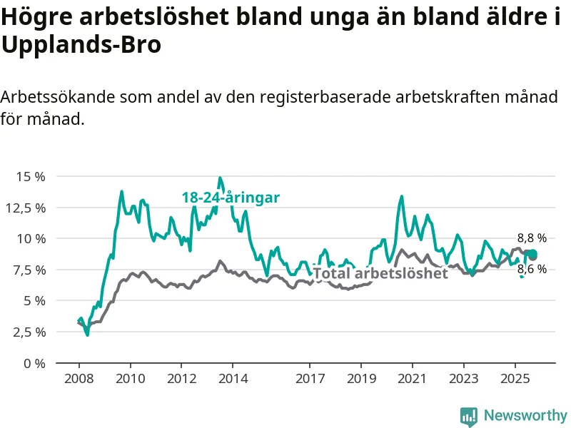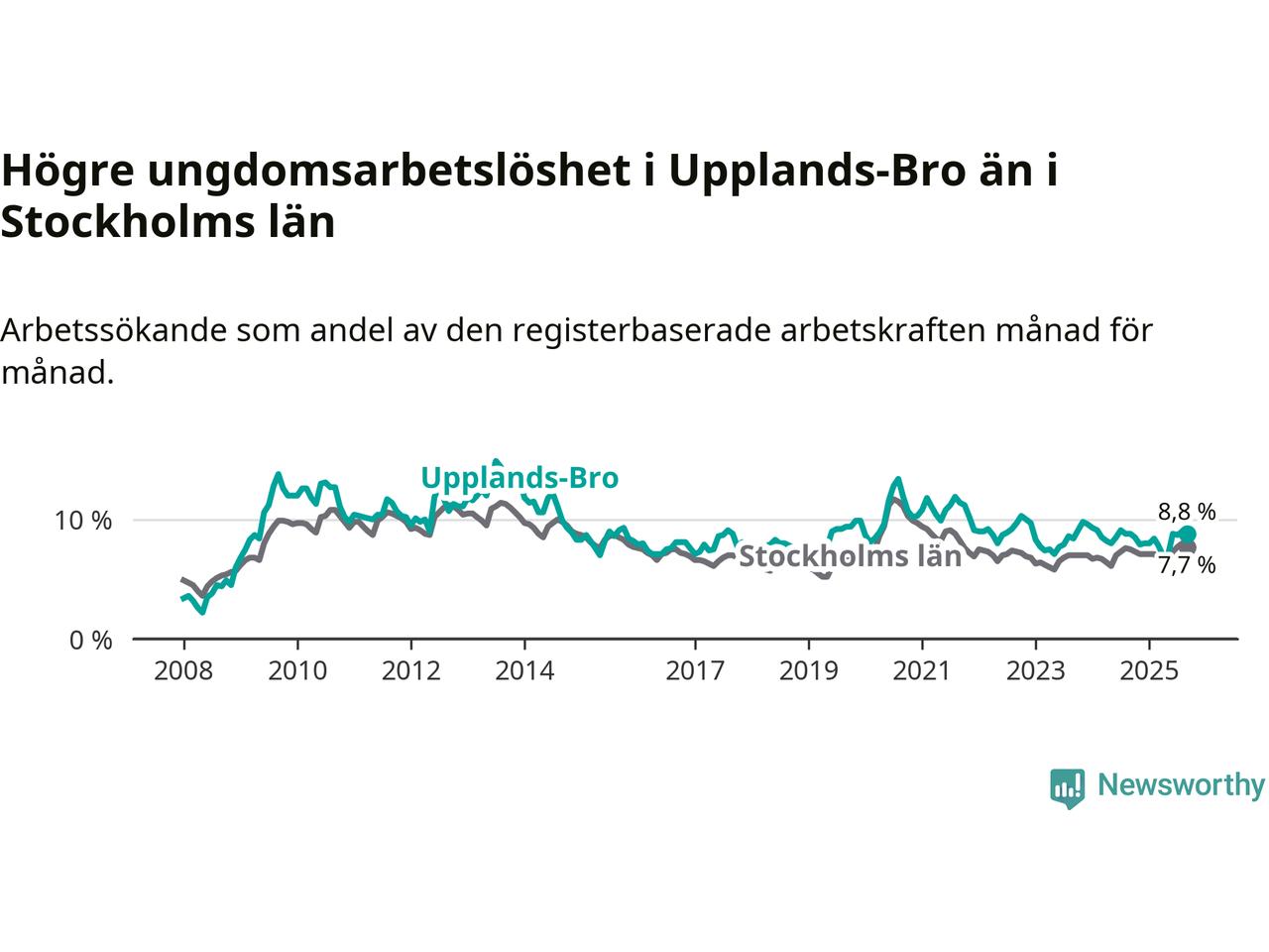 Graf: Arbetslöshet bland unga i Upplands-Bro kommun och Stockholms län