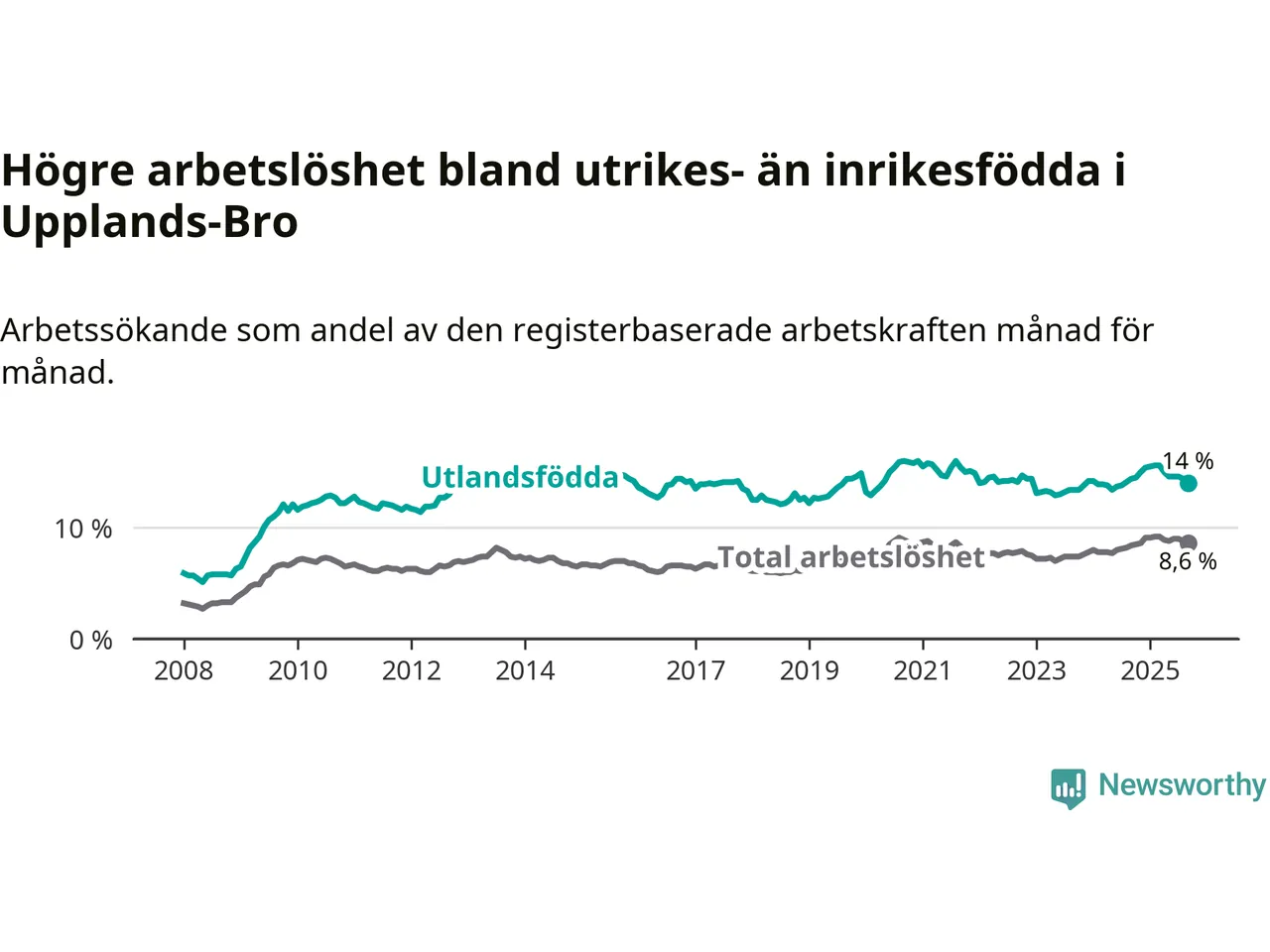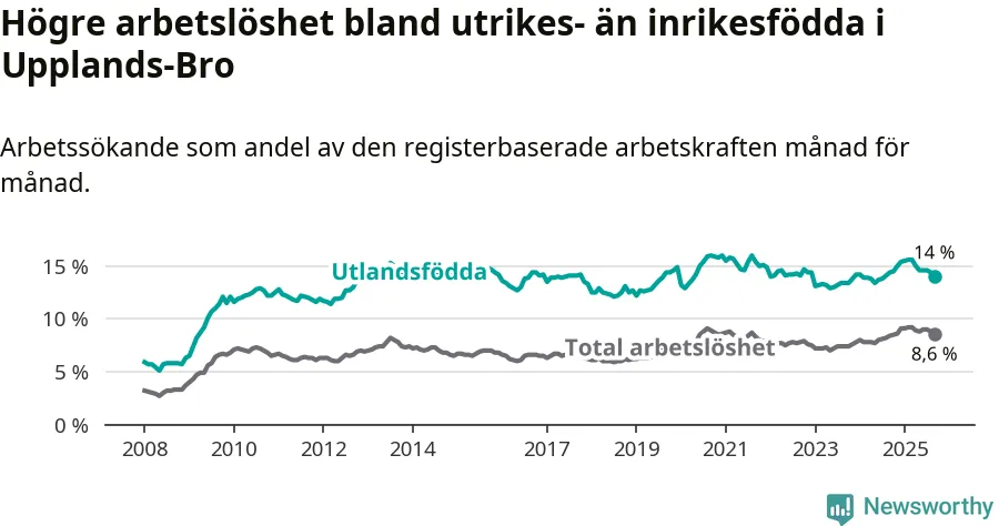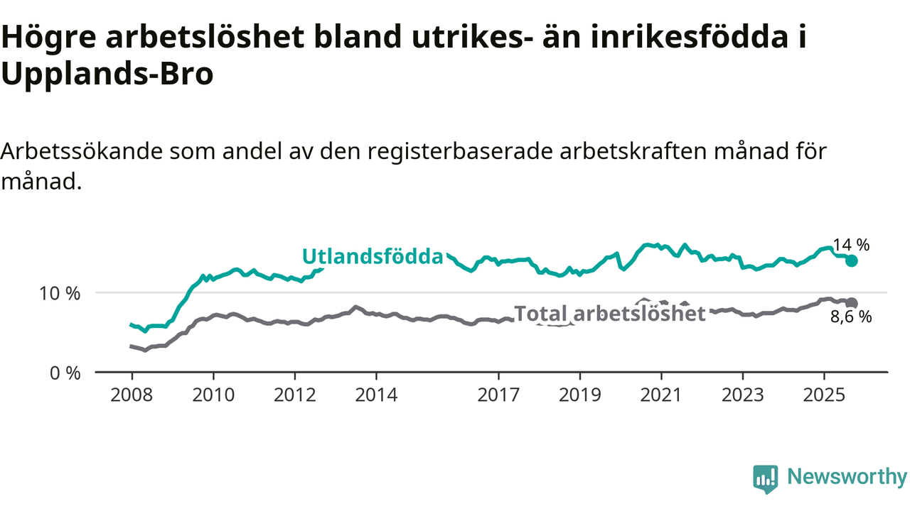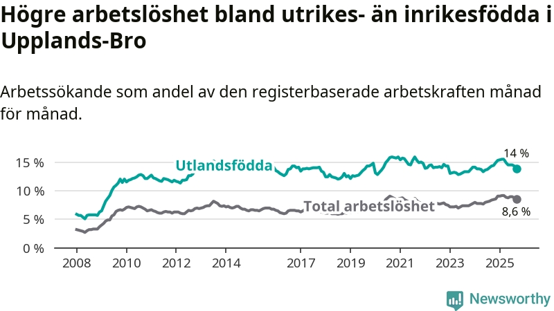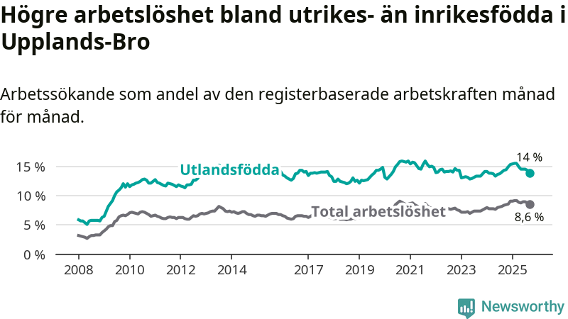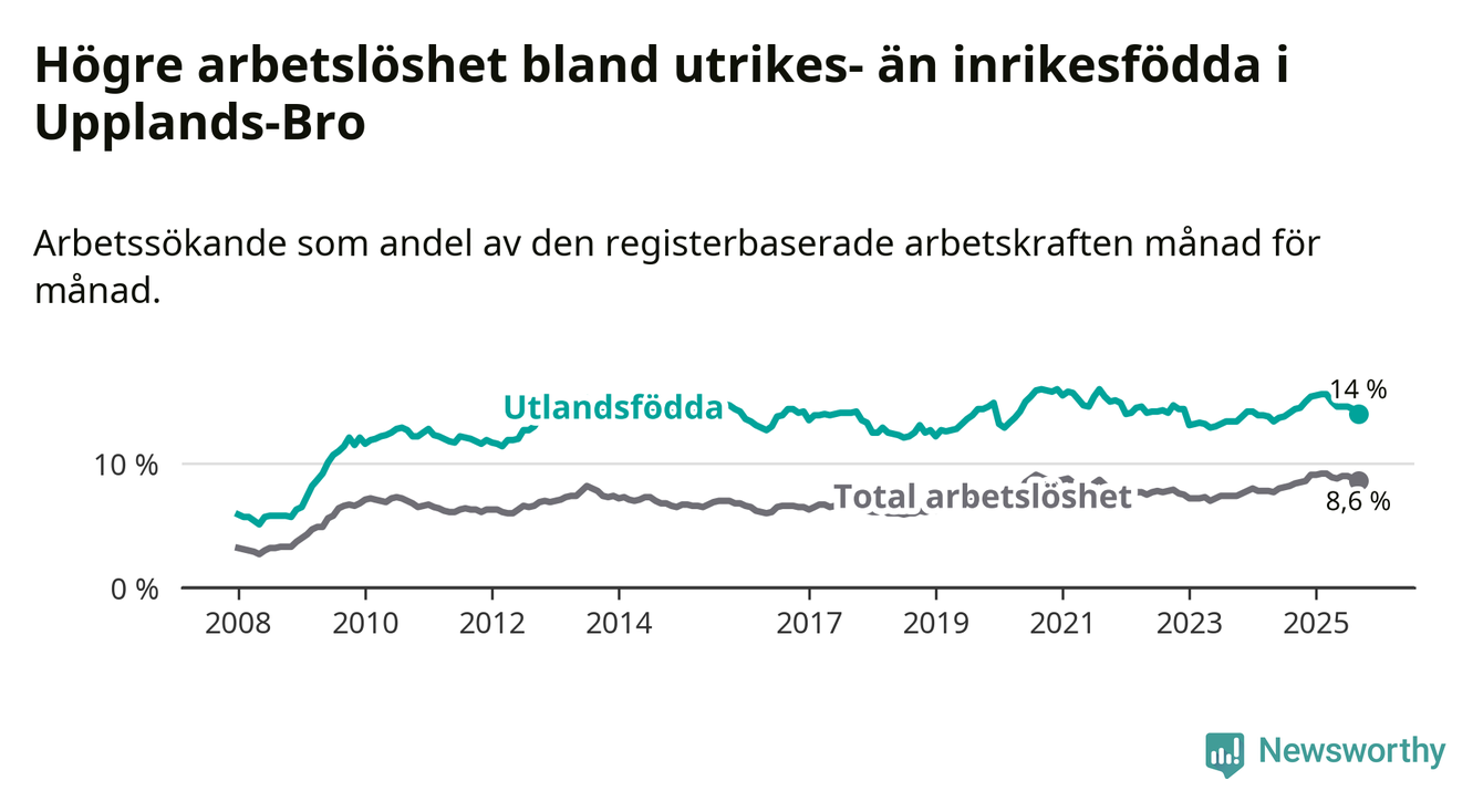 Arbetslösheten bland utlandsfödda var 14,0 procent i Upplands-Bro under september månad, motsvarande 1 005 av 7 179 personer. Det är 0,4 procentenheter färre än vid samma tidpunkt i fjol (+5 om man räknar personer). Den senaste månadens nedgång innebär ett trendbrott. Under de 20 föregående månaderna hade arbetslösheten bland utlandsfödda varit högre än motsvarande tidpunkt året innan.