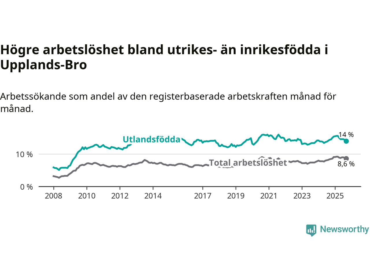 Graf: Skillnad i arbetslöshet mellan utrikesfödda och hela befolkningen i Upplands-Bro kommun