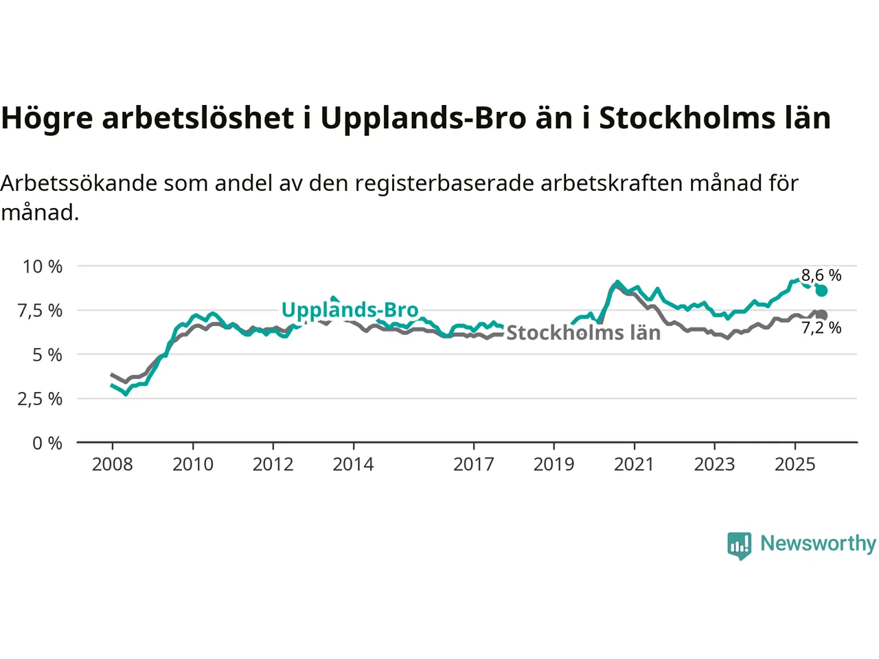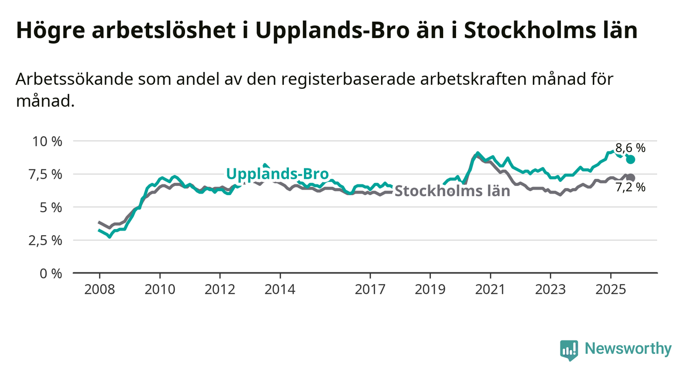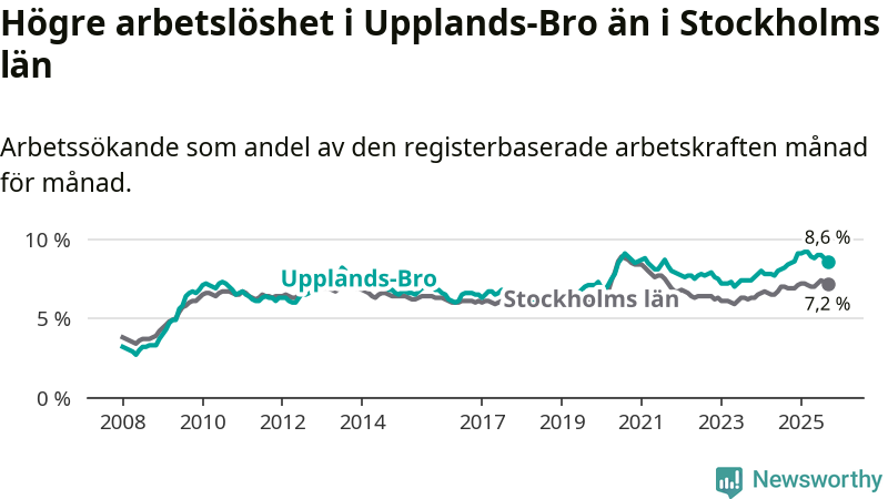 Upplands-Bro hade redan tidigare högre arbetslöshet än snittet i hela Stockholms län och nu växer klyftan (8,6 procent i kommunen, jämfört med 7,2 procent i hela länet). Vaxholm och Värmdö har den lägsta arbetslösheten i länet (3,9 procent), medan Södertälje har den högsta (11,1 procent). För att Upplands-Bro skulle komma ner i samma arbetslöshetsnivå som Vaxholm och Värmdö skulle 797 personer behöva sysselsättas.
