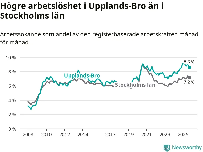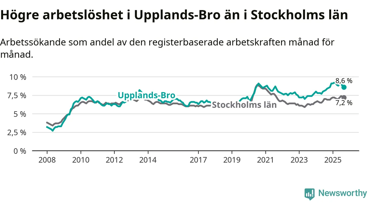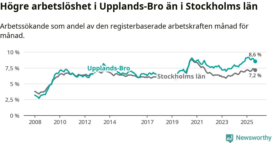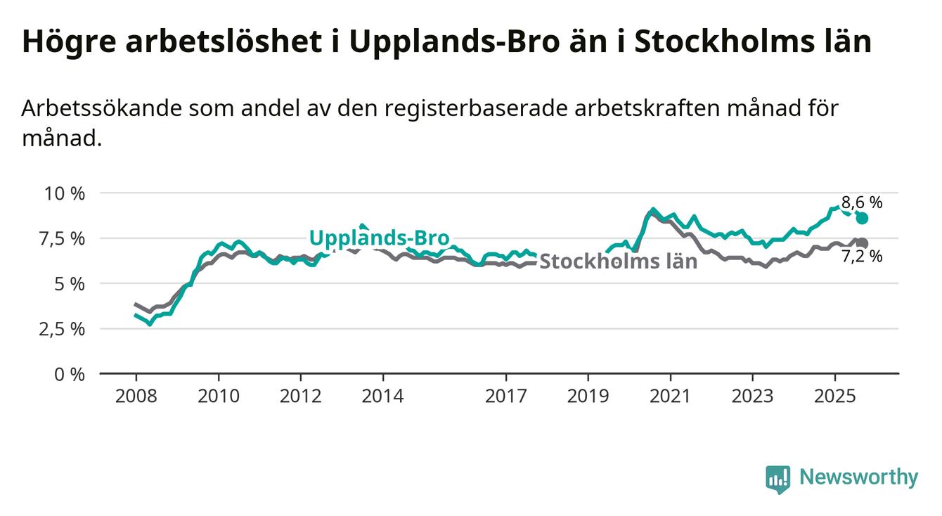 Under september månad rapporterade Upplands-Bro kommun en total arbetslöshet på 8,6 procent. Det är en ökning jämfört med samma tidpunkt i fjol (+0,2 procentenheter). Även i Stockholms län stiger arbetslösheten .