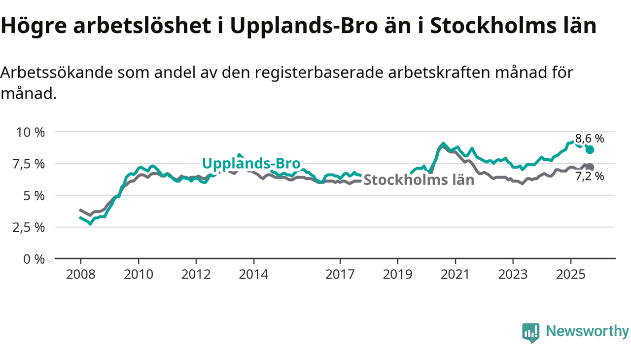 Graf: Arbetslöshet i Upplands-Bro kommun och Stockholms län
