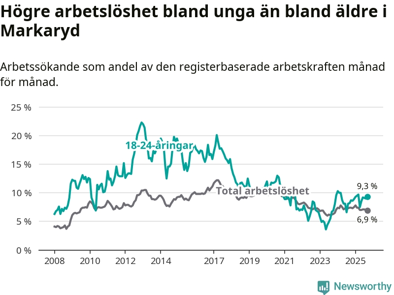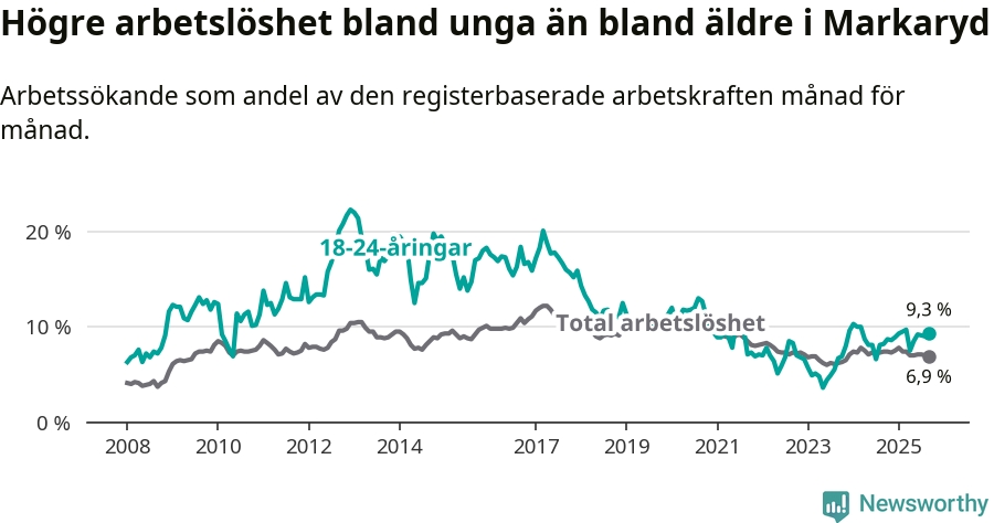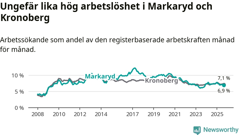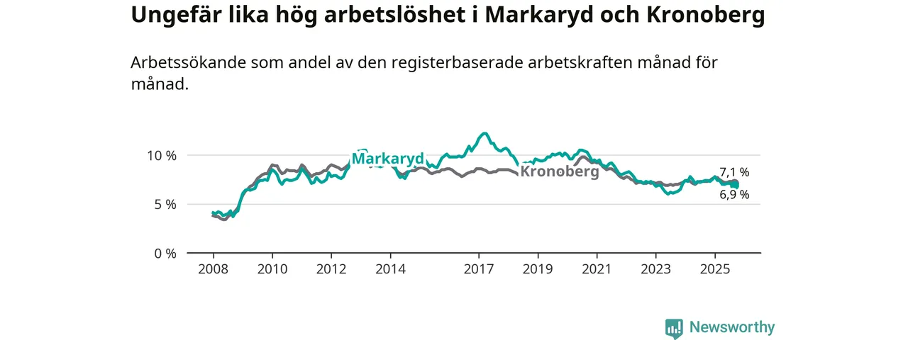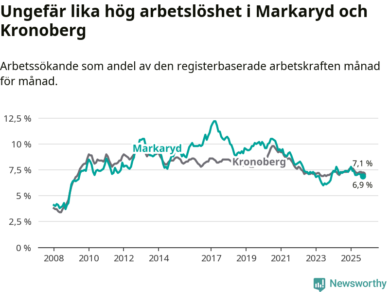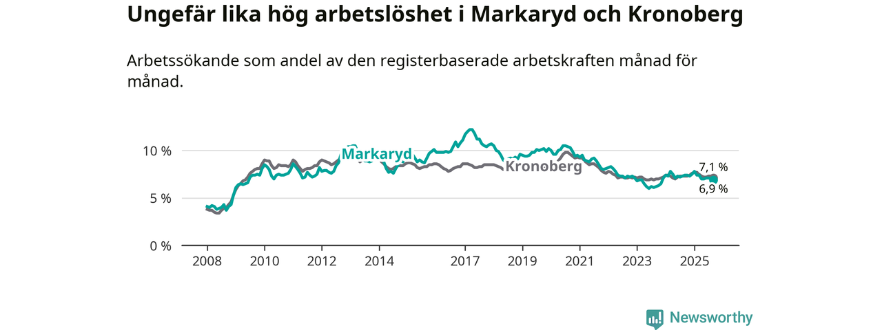 Under september månad rapporterade Markaryds kommun en total arbetslöshet på 6,9 procent. Det är en minskning jämfört med samma tidpunkt i fjol (−0,5 procentenheter). Även i Kronobergs län sjunker arbetslösheten .