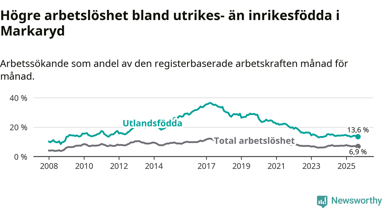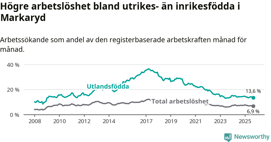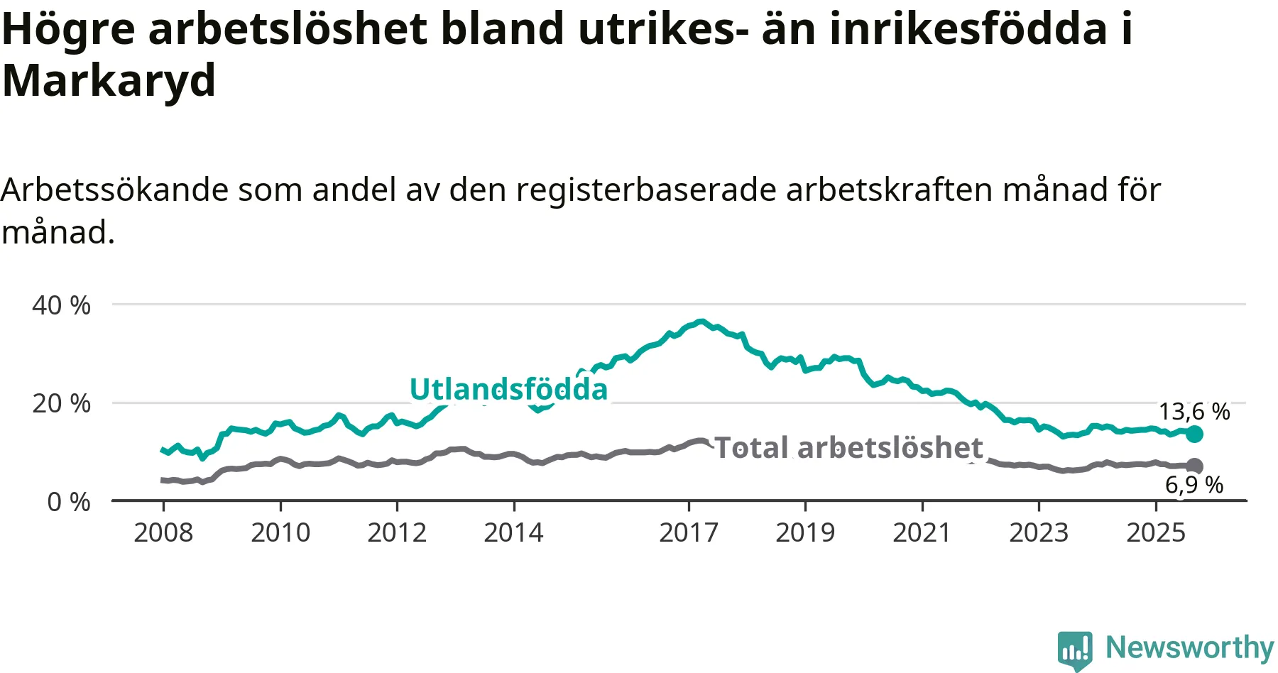 Arbetslösheten bland utlandsfödda var 13,6 procent i Markaryd under september månad, motsvarande 185 av 1 360 personer. Det är 0,7 procentenheter färre än vid samma tidpunkt i fjol (−17 om man räknar personer).