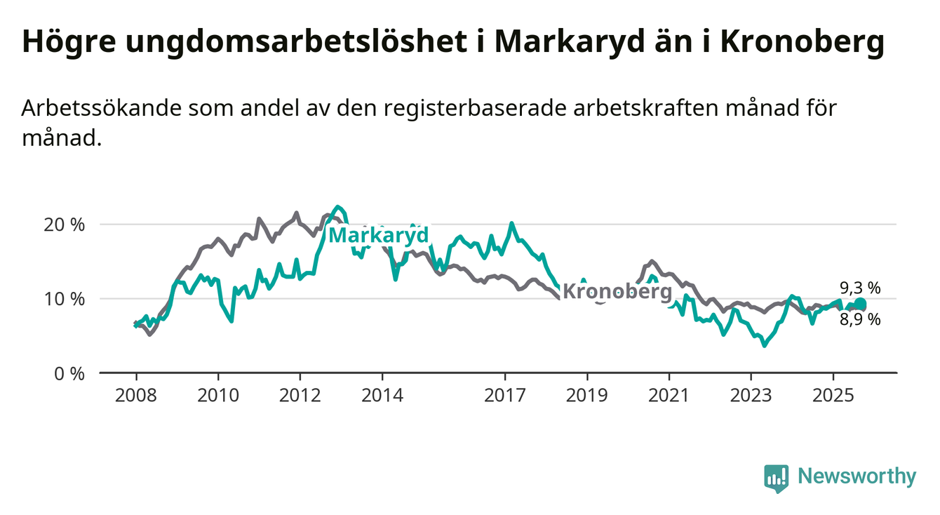 Den här skillnaden i arbetslöshet mellan inrikes- och utrikesfödda är ändå förhållandevis liten i Markaryd om man jämför med andra kommuner i Kronoberg. Älmhult har, relativt sett, den minsta skillnaden i arbetslöshet mellan inrikes- och utrikes födda i länet. Växjö har den största.