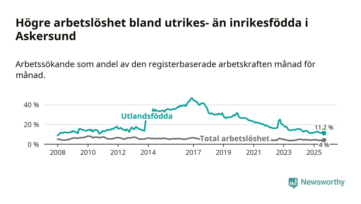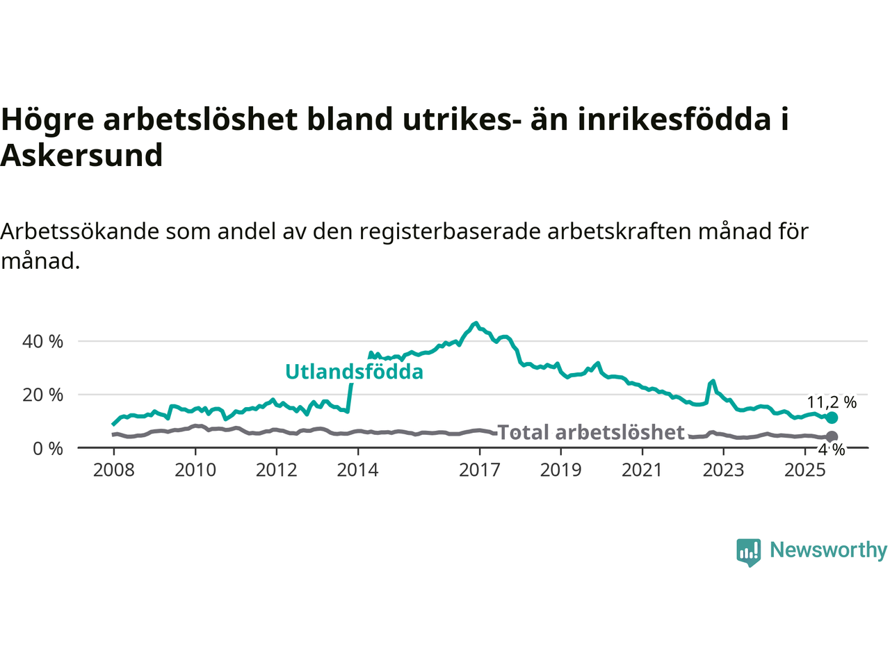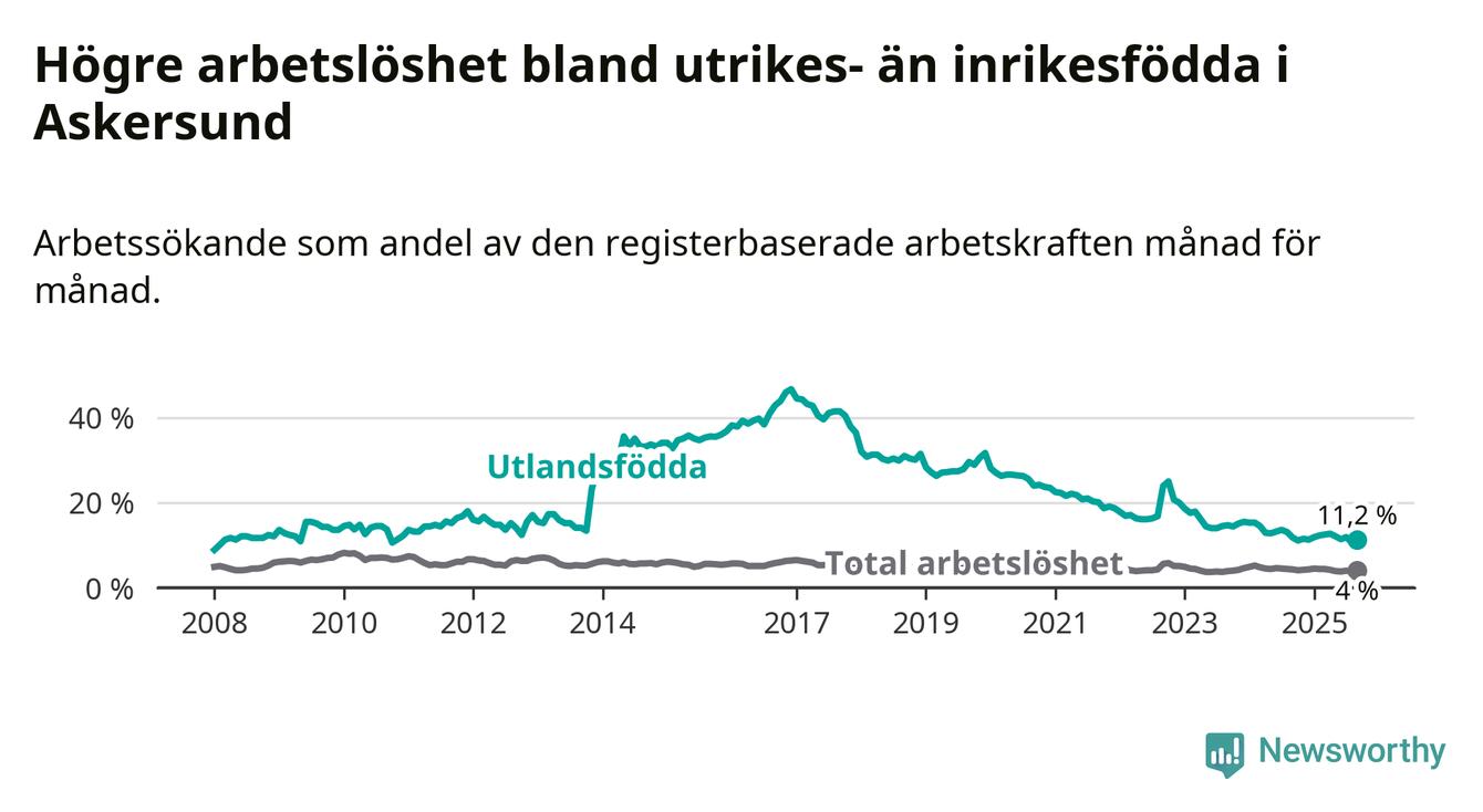 Arbetslösheten bland utlandsfödda var 11,2 procent i Askersund under september månad, motsvarande 62 av 554 personer. Det är 0,6 procentenheter färre än vid samma tidpunkt i fjol (−4 om man räknar personer). Därmed har de utlandsföddas arbetslöshet varit lägre än vid samma tidpunkt i fjol i över två år i sträck. Sedan mars 2023 har arbetslösheten bland utlandsfödda minskat från 17,9 till 11,2 procent.
