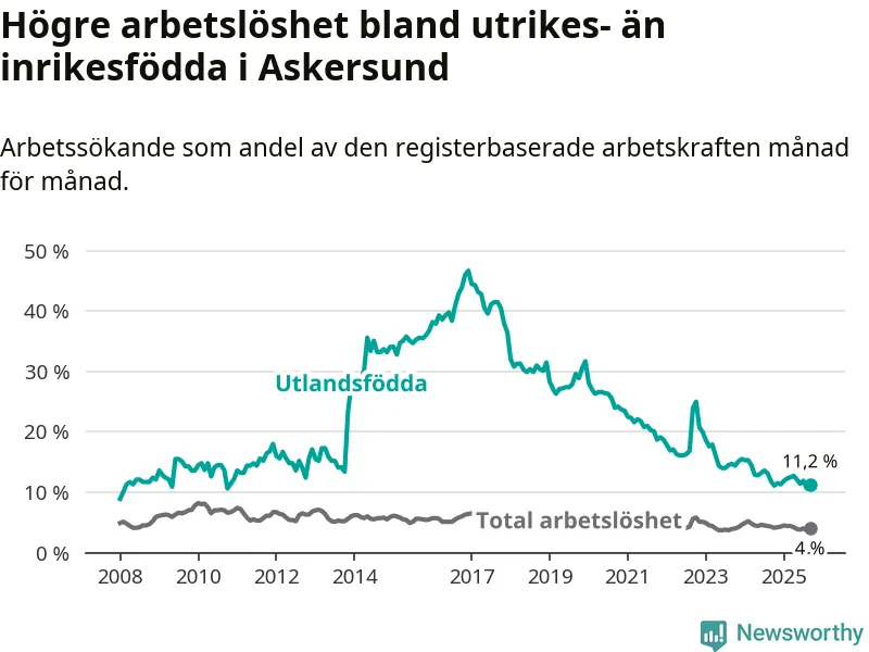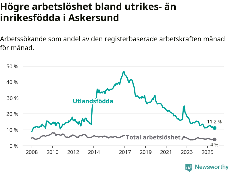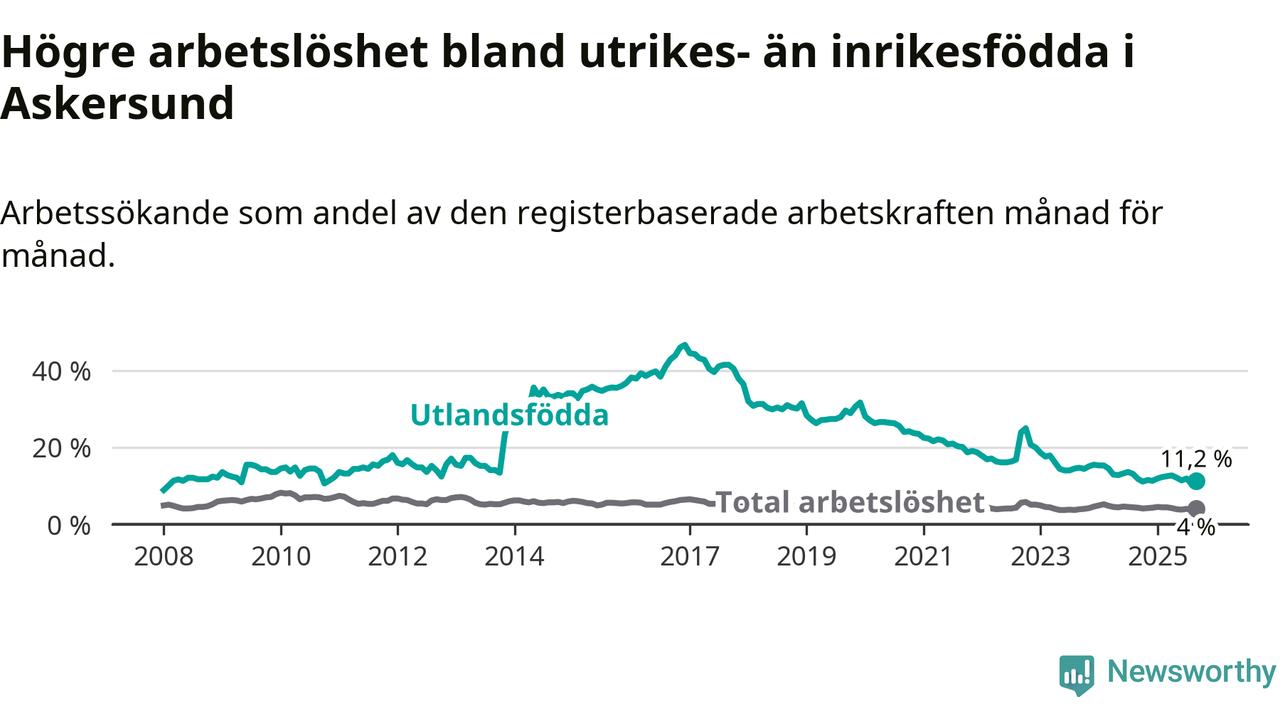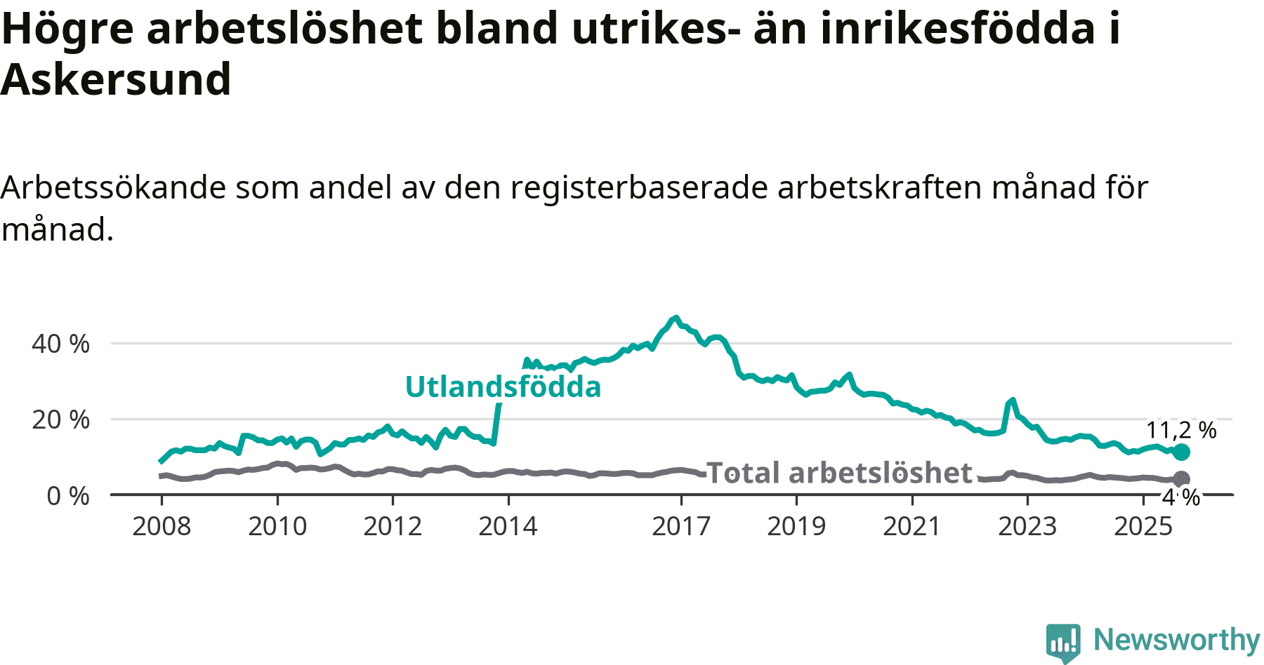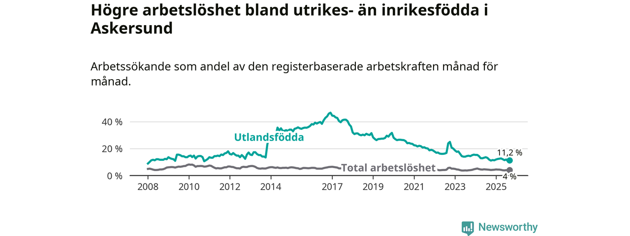 Arbetslösheten bland utlandsfödda var 11,2 procent i Askersund under september månad, motsvarande 62 av 554 personer. Det är 0,6 procentenheter färre än vid samma tidpunkt i fjol (−4 om man räknar personer). Därmed har de utlandsföddas arbetslöshet varit lägre än vid samma tidpunkt i fjol i över två år i sträck. Sedan mars 2023 har arbetslösheten bland utlandsfödda minskat från 17,9 till 11,2 procent.