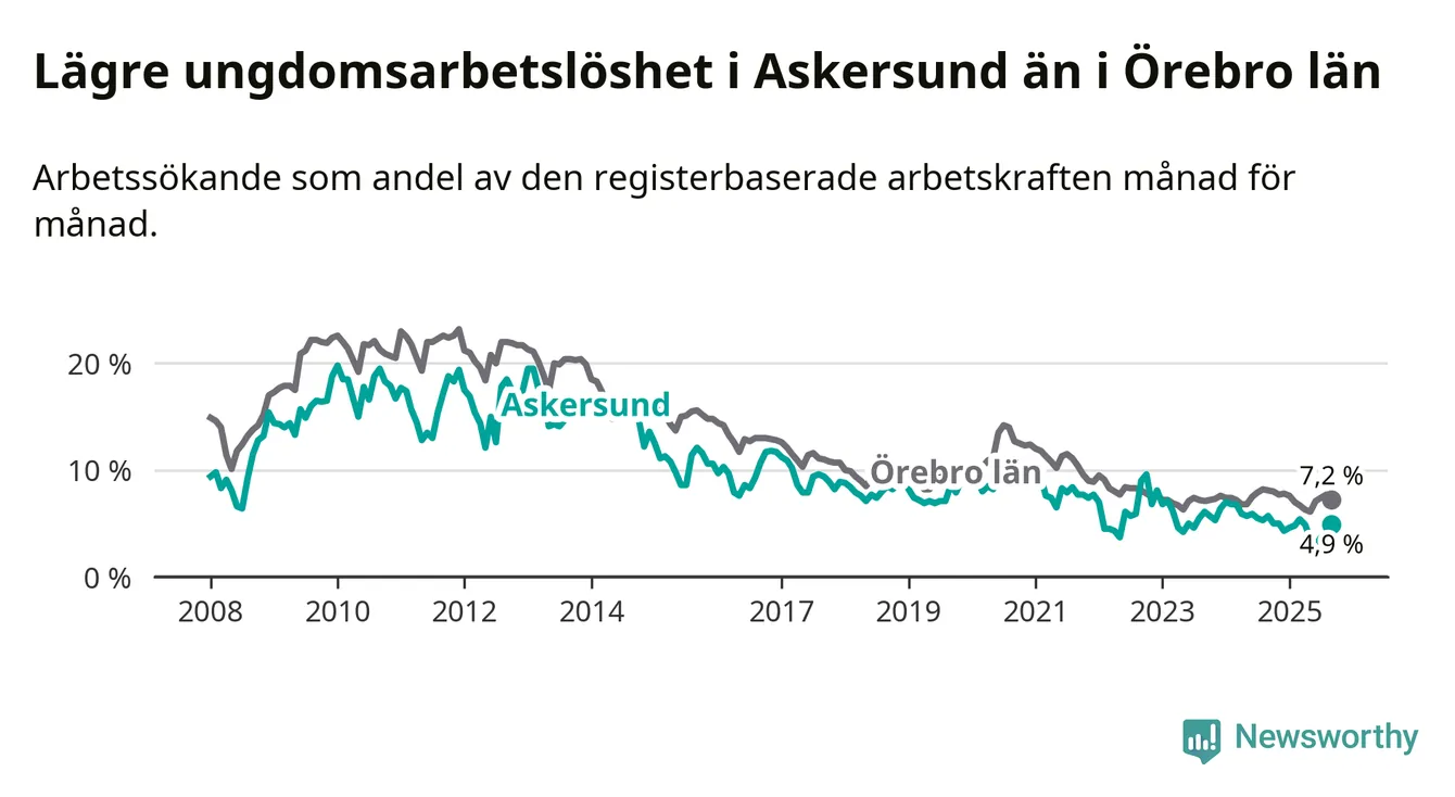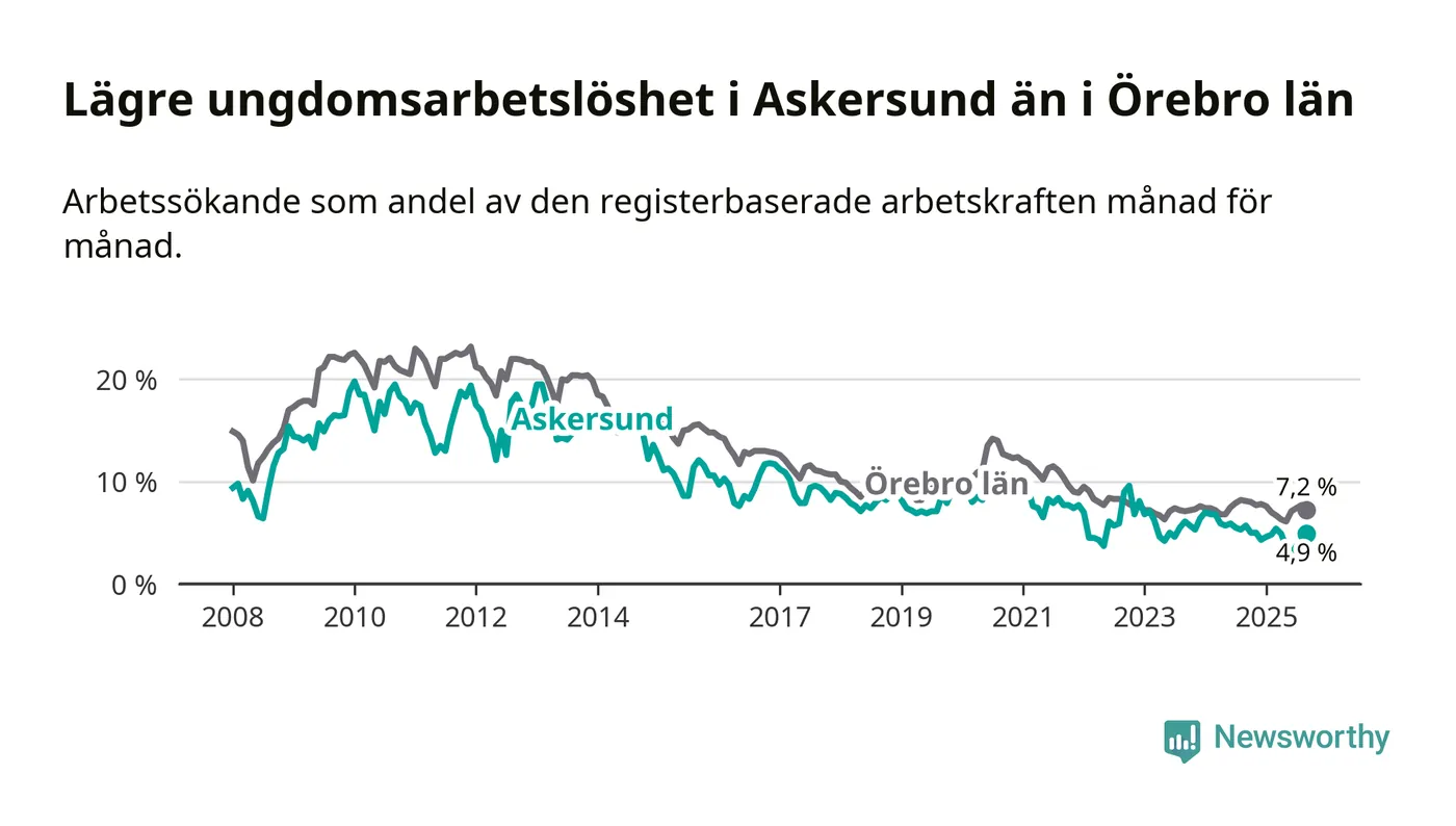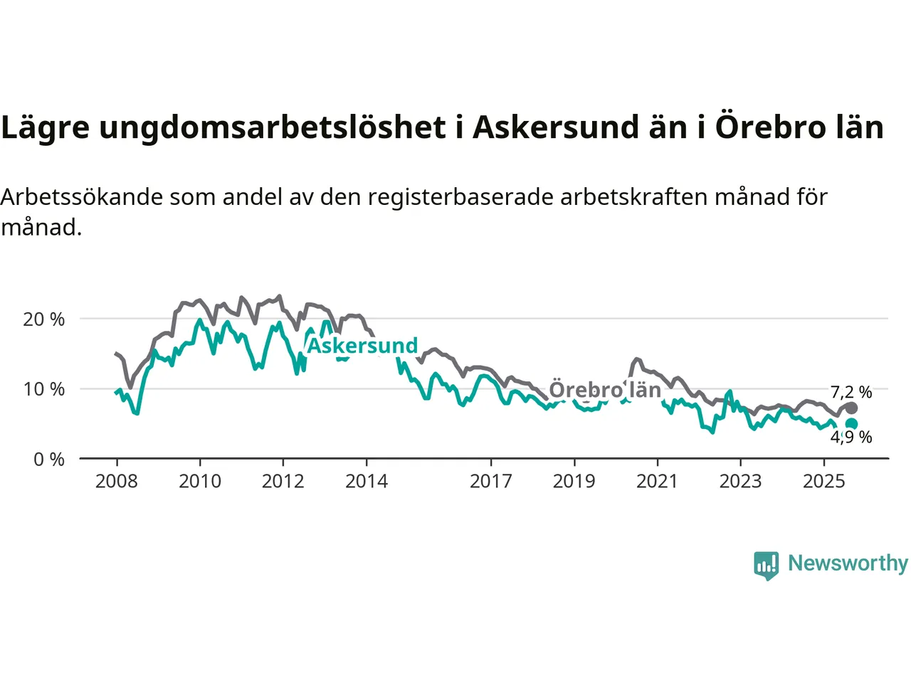 Precis som den totala arbetslösheten ligger ungdomsarbetslösheten i Askersund lägre än i Örebro som helhet. Skillnaden mellan kommunen och länet är 2,3 procentenheter.