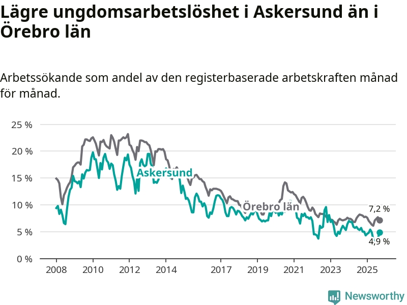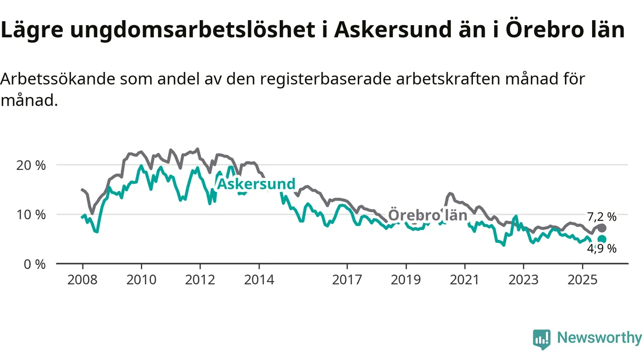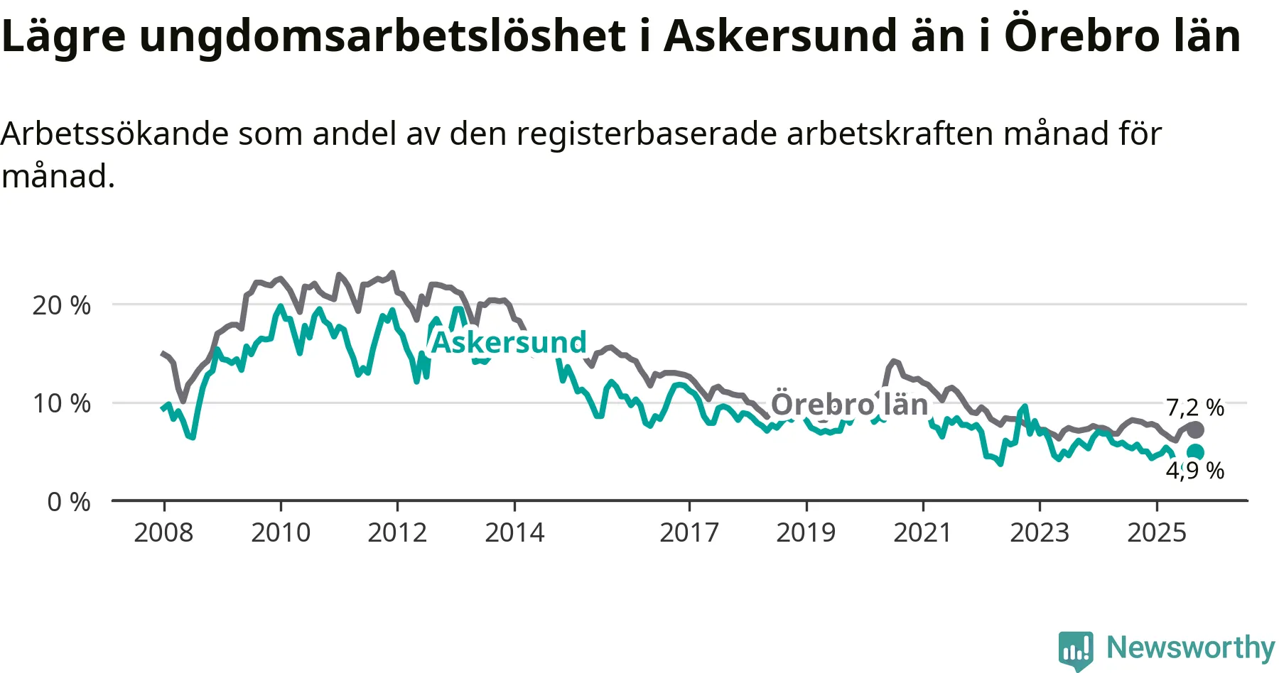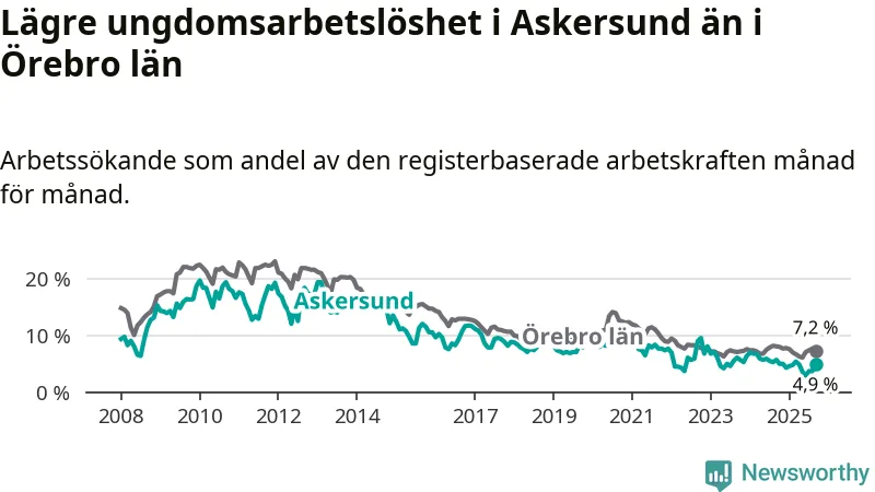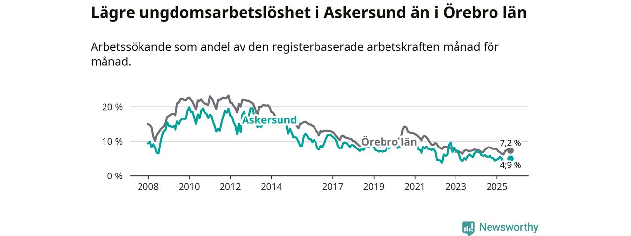 Precis som den totala arbetslösheten ligger ungdomsarbetslösheten i Askersund lägre än i Örebro som helhet. Skillnaden mellan kommunen och länet är 2,3 procentenheter.